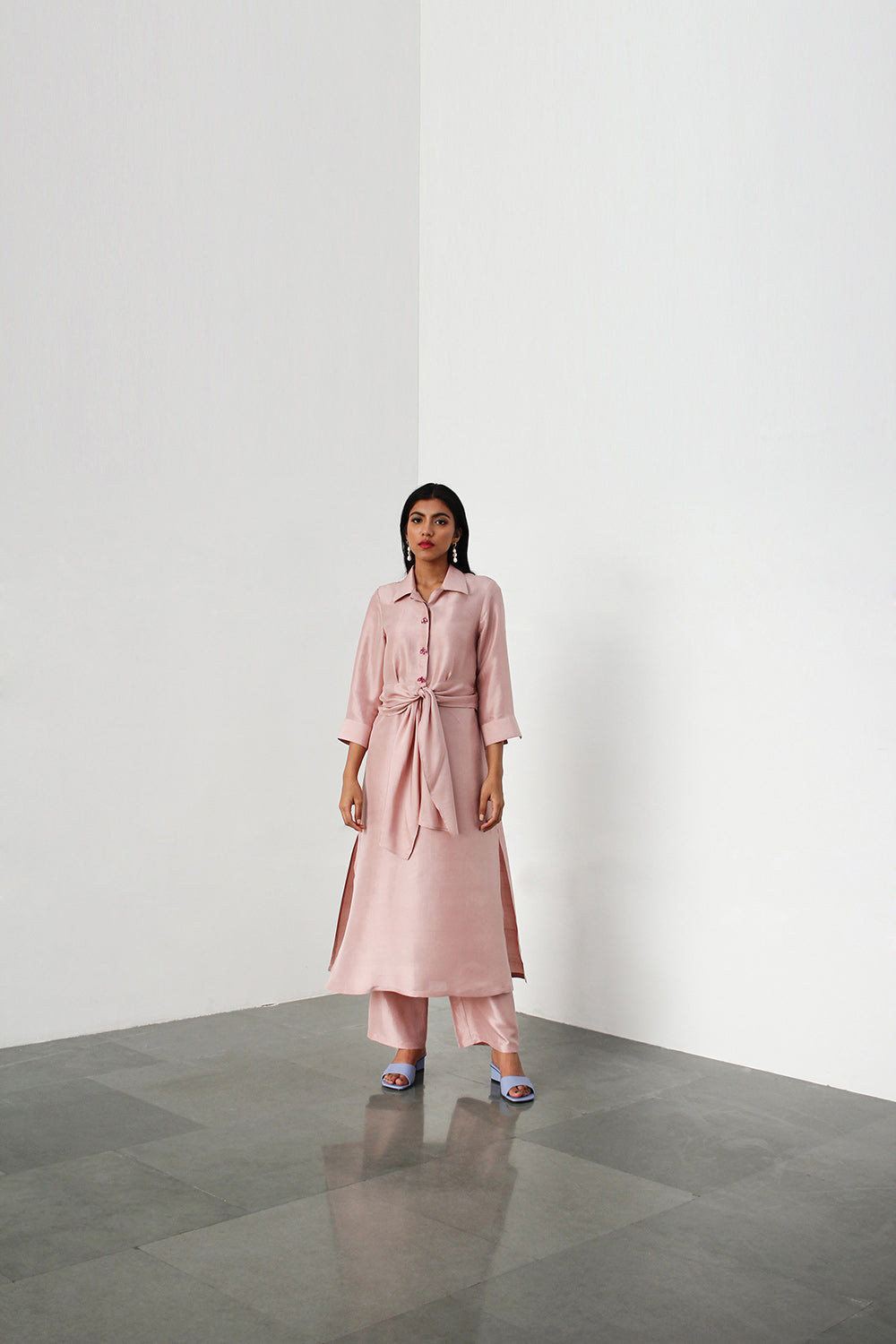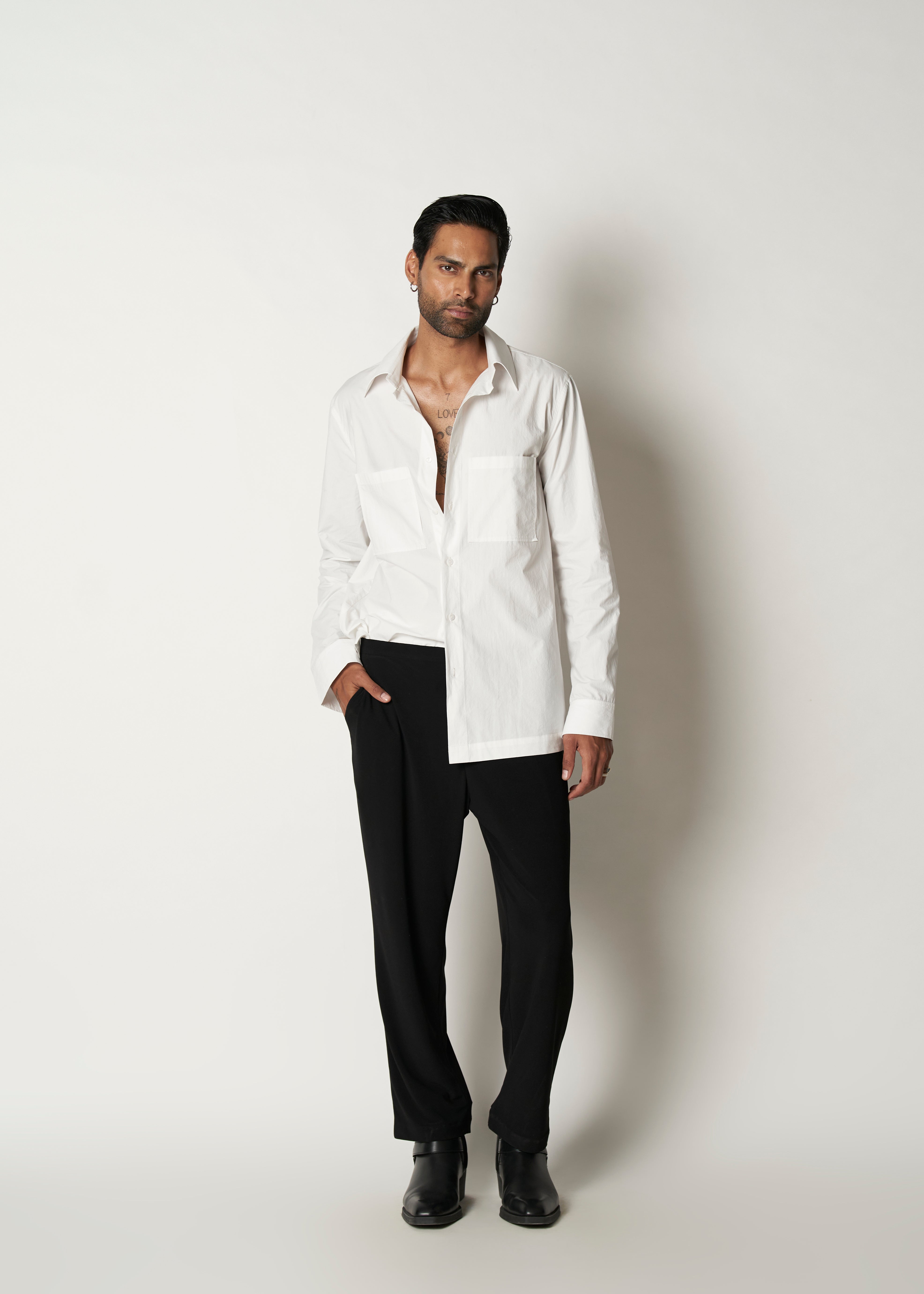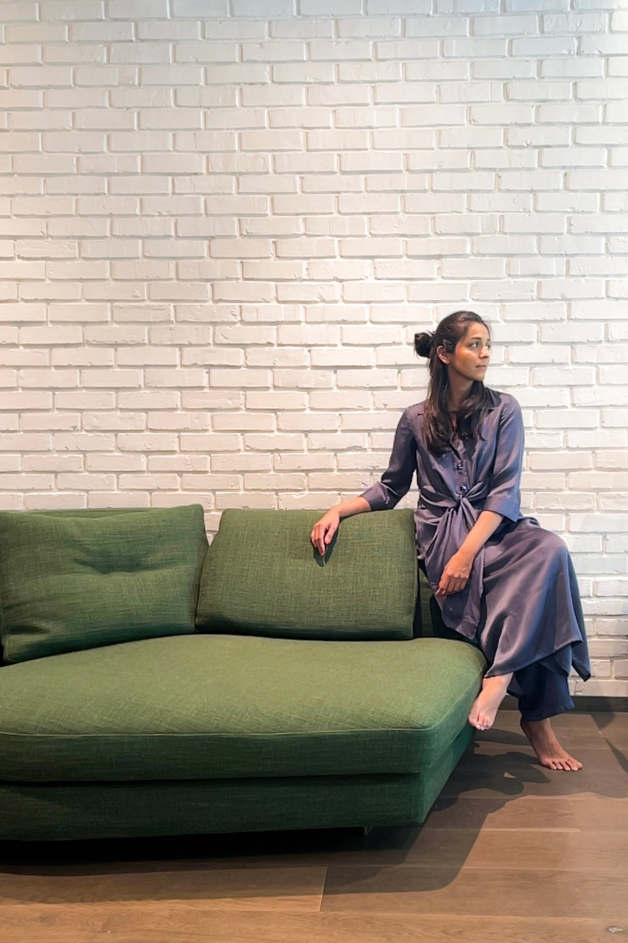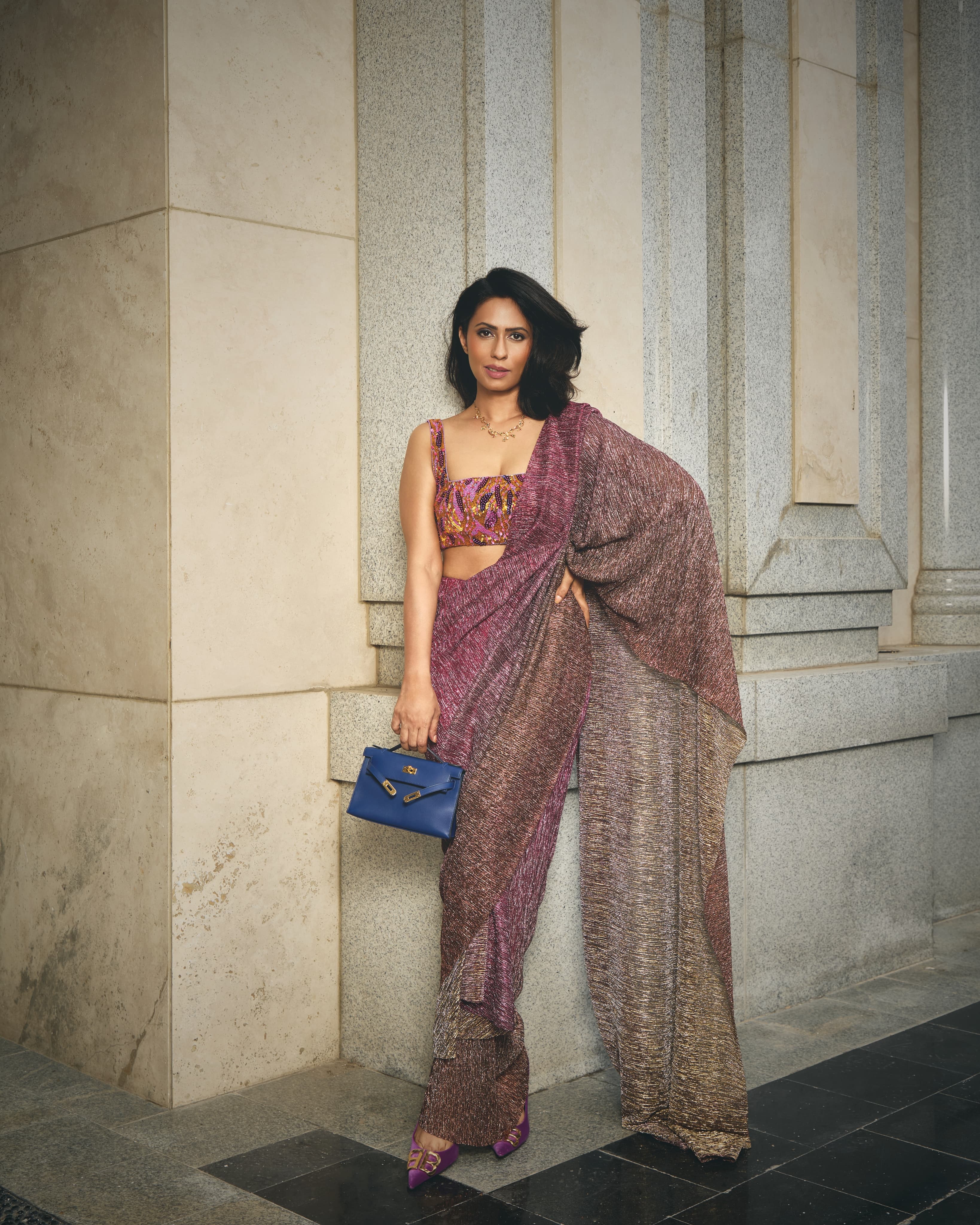 Introducing 24-7, a collection that spans the entire day and shows how you can wear 431-88 from morning to evening to night. The clothes feel like second skin in fabrics that look and feel like liquid on your skin. Vegan leather and slinky jerseys come together in a colour palette of greys, golds and our signature pinks. Adding to our repertoire of pre-draped saris, we are introducing 3 new drapes: The Cape Sari, The 4 way Sari (which also functions as a dress) and the Annie Sari. The focus is celebratory but not limited to the traditional rules. We are talking about how a suit pant can be a go-to for a day event, how a cropped blazer is acceptable as a blouse on its own, and how we can take tone down a sari with just a white t-shirt.