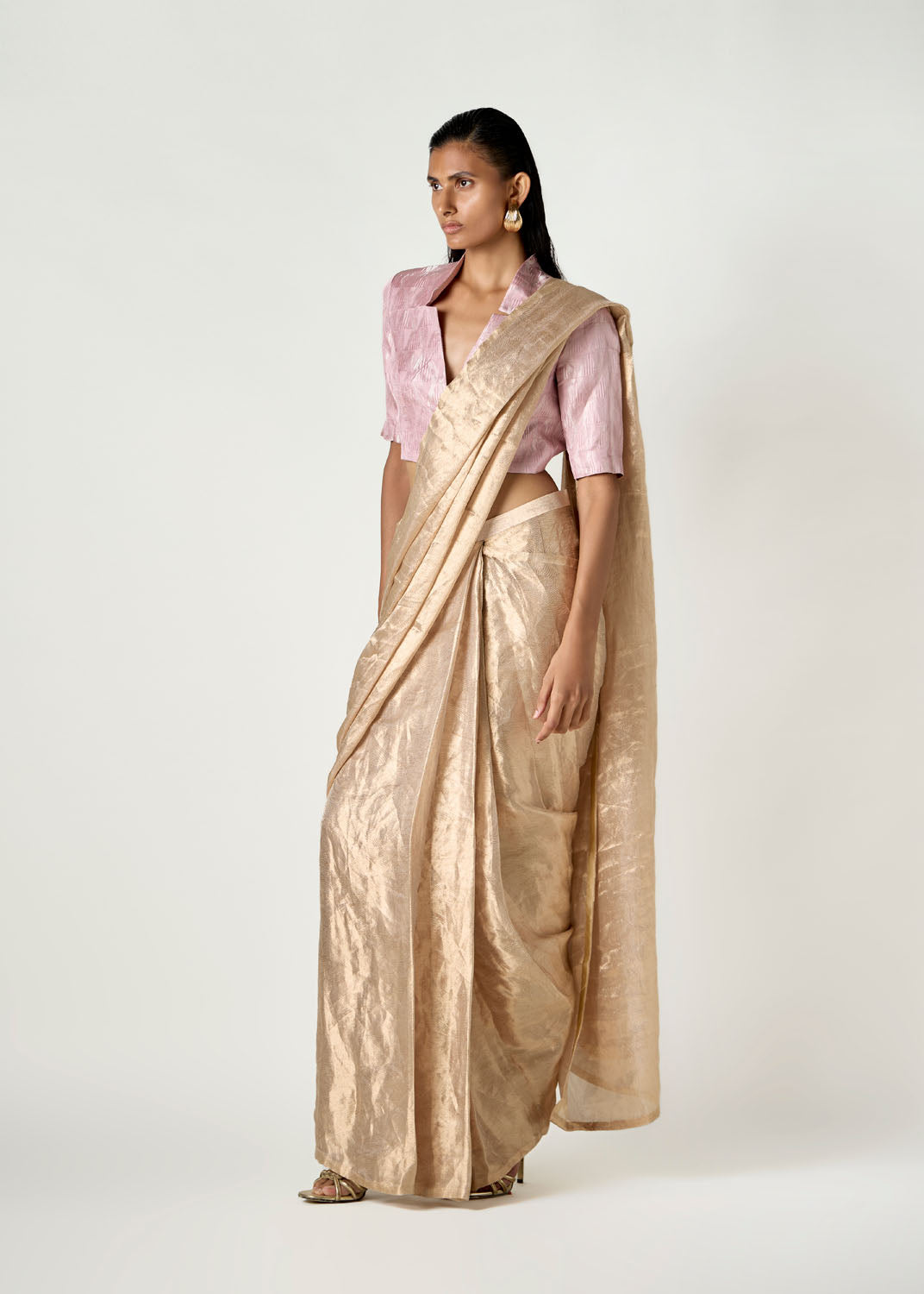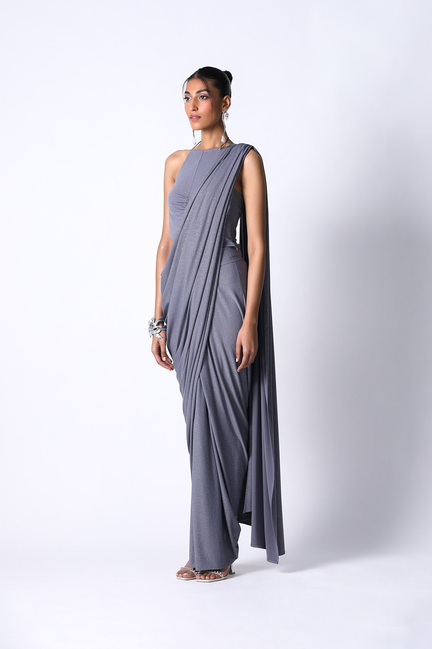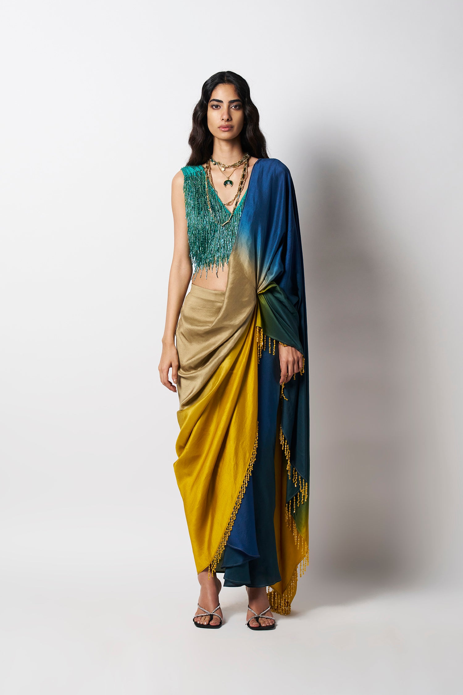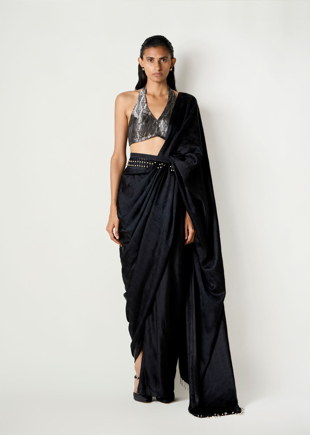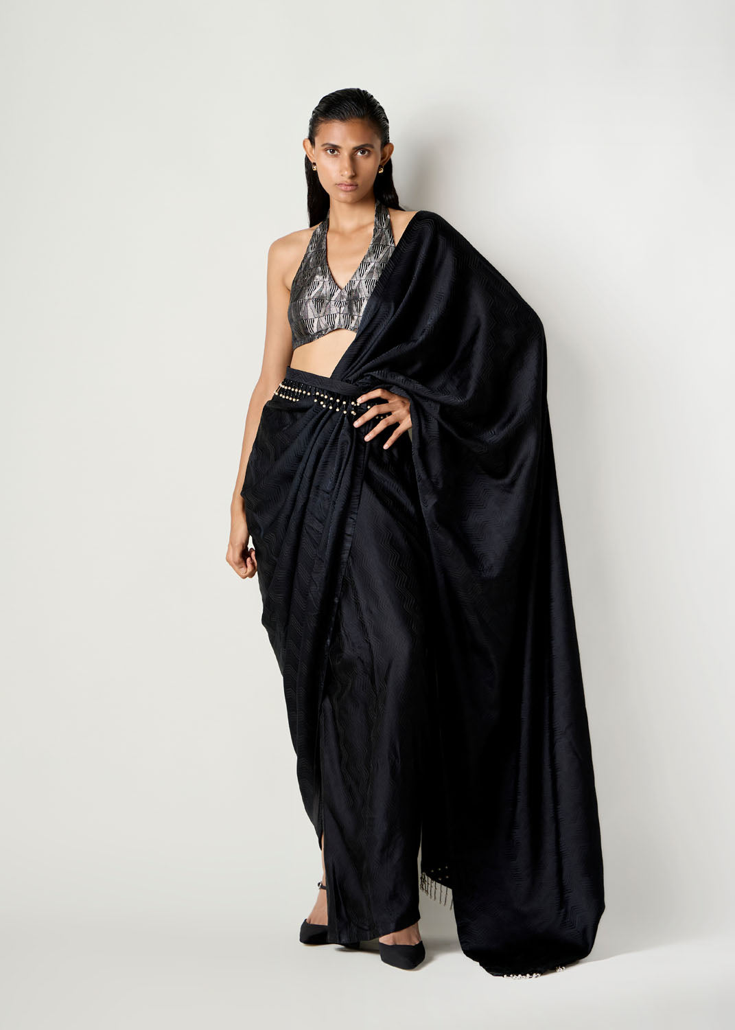This artistic overlap of a collection redefines the sari, embodying culture and comfort. It's a revolutionary coming together of invention and tradition, like never before.