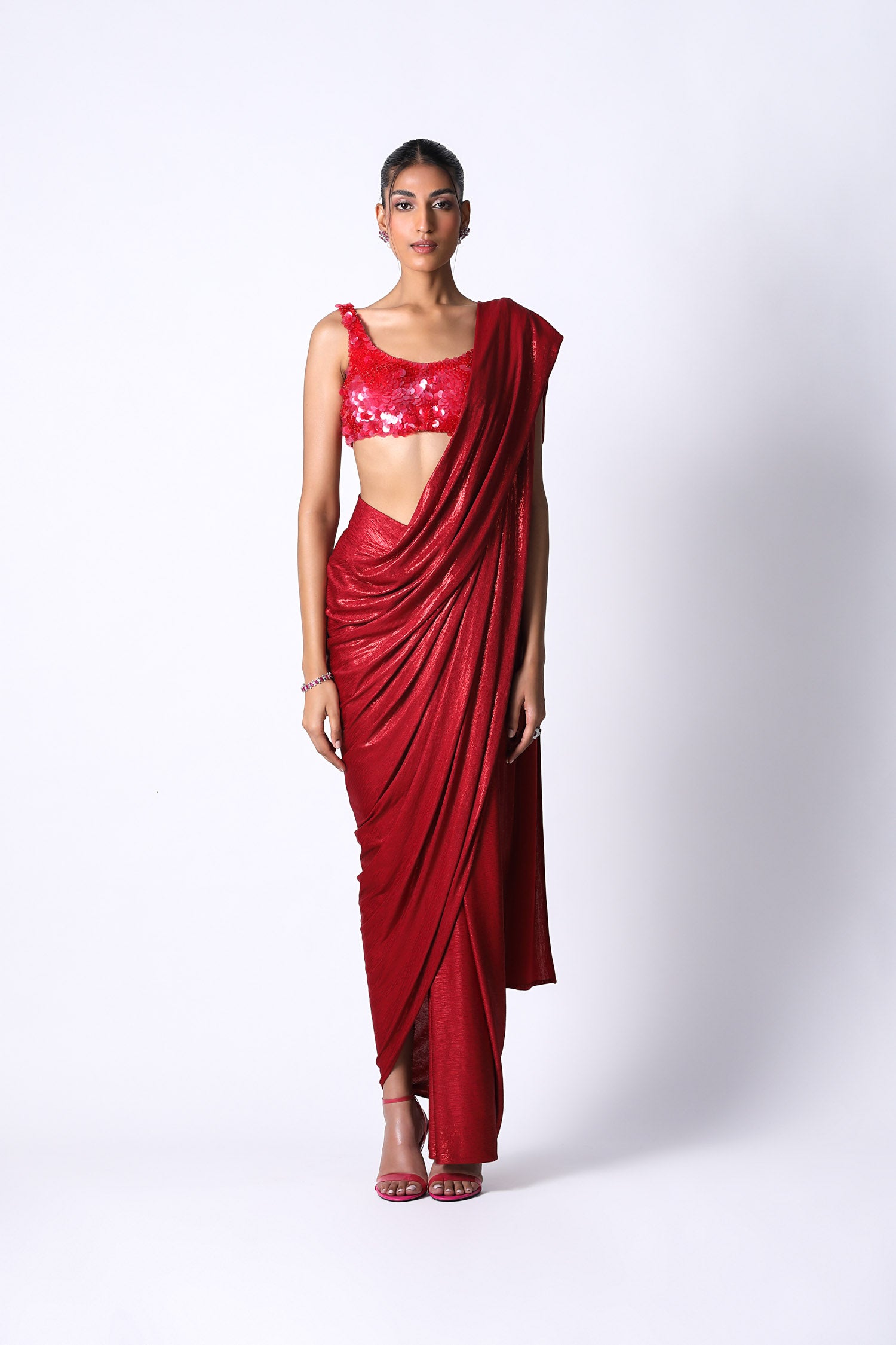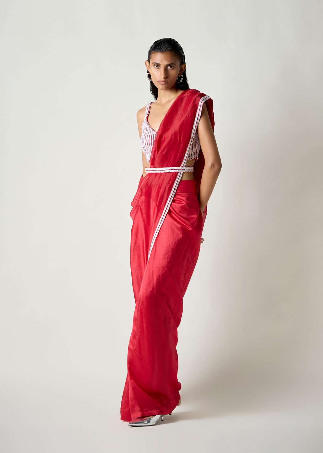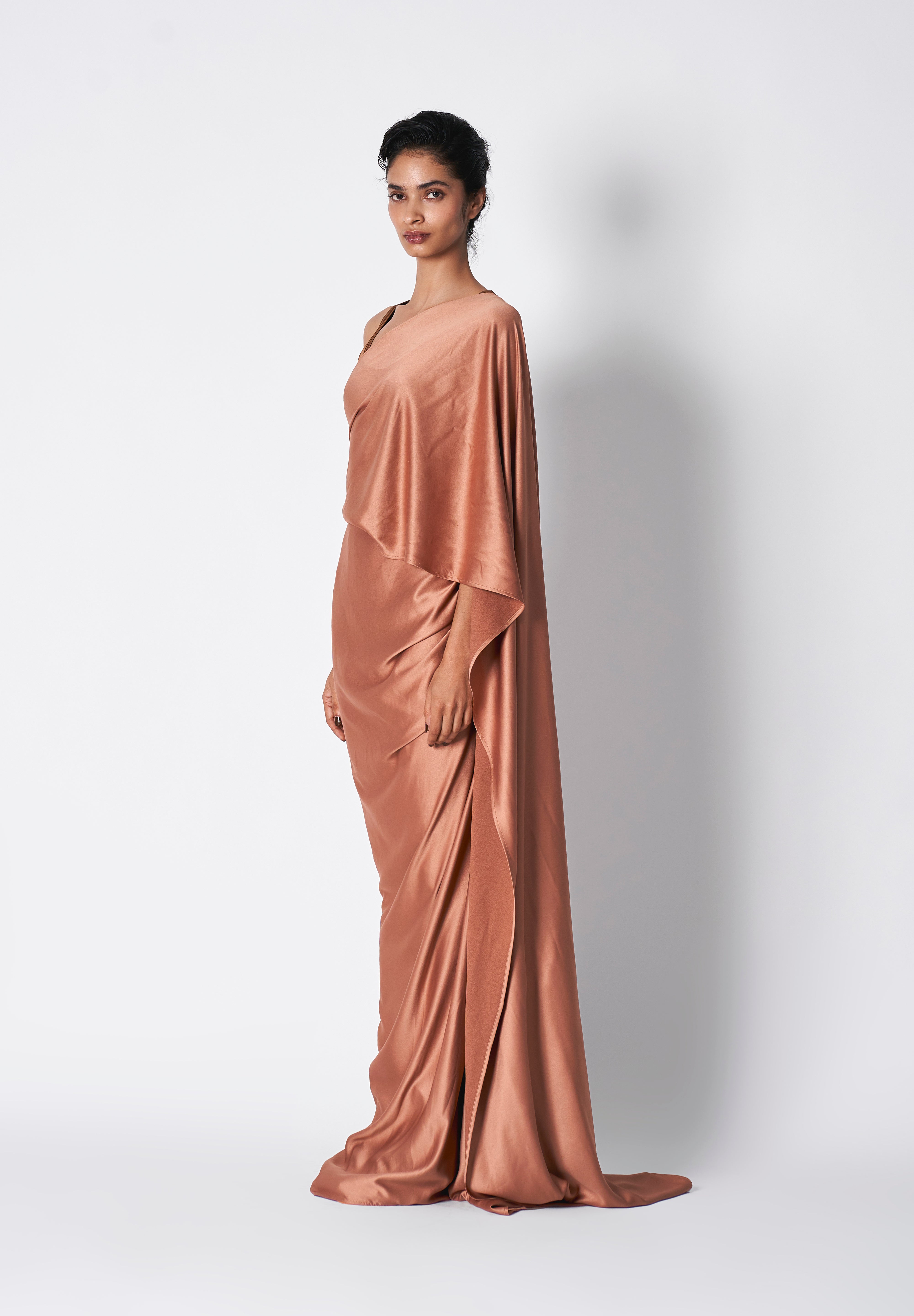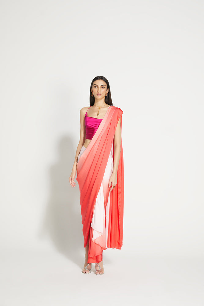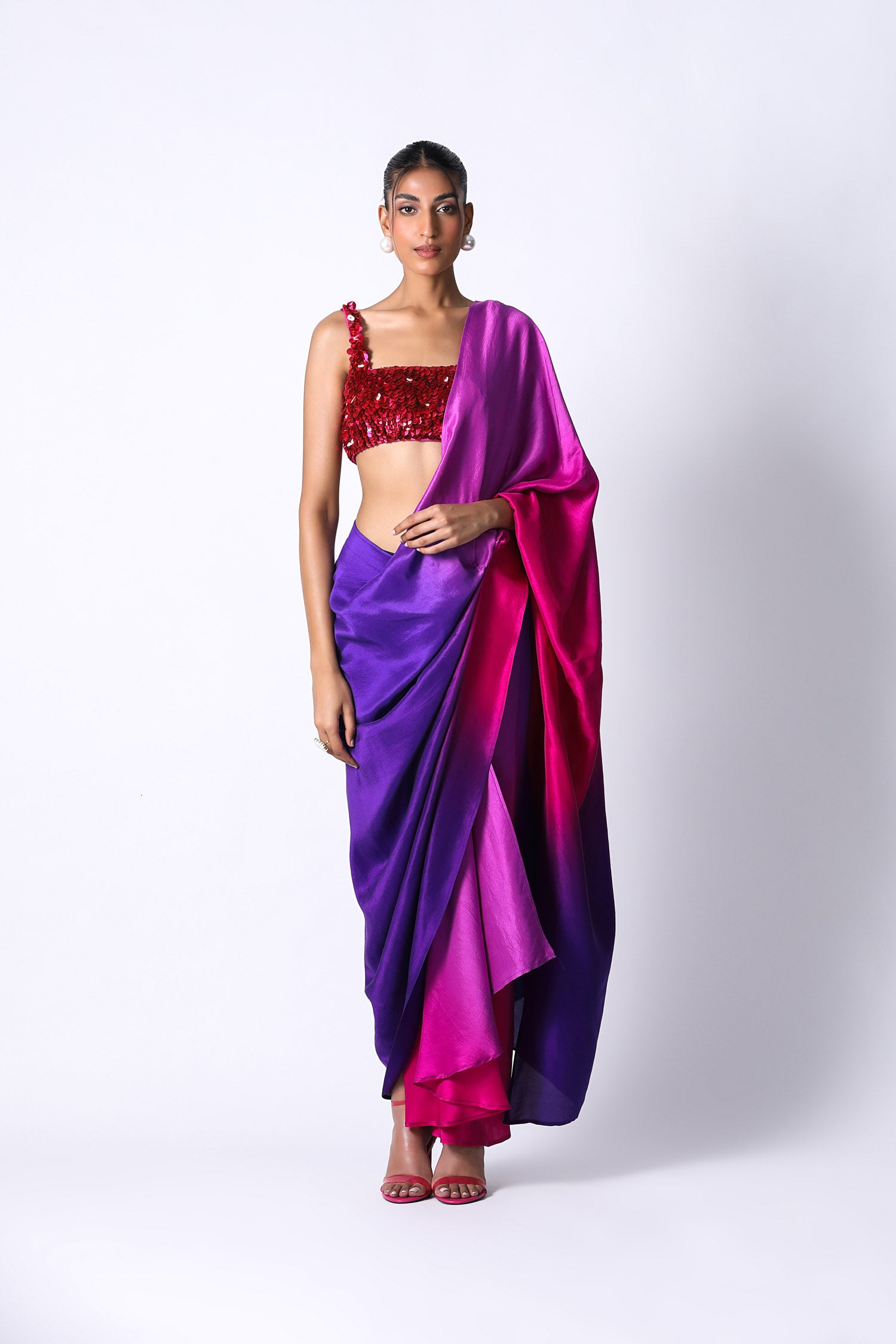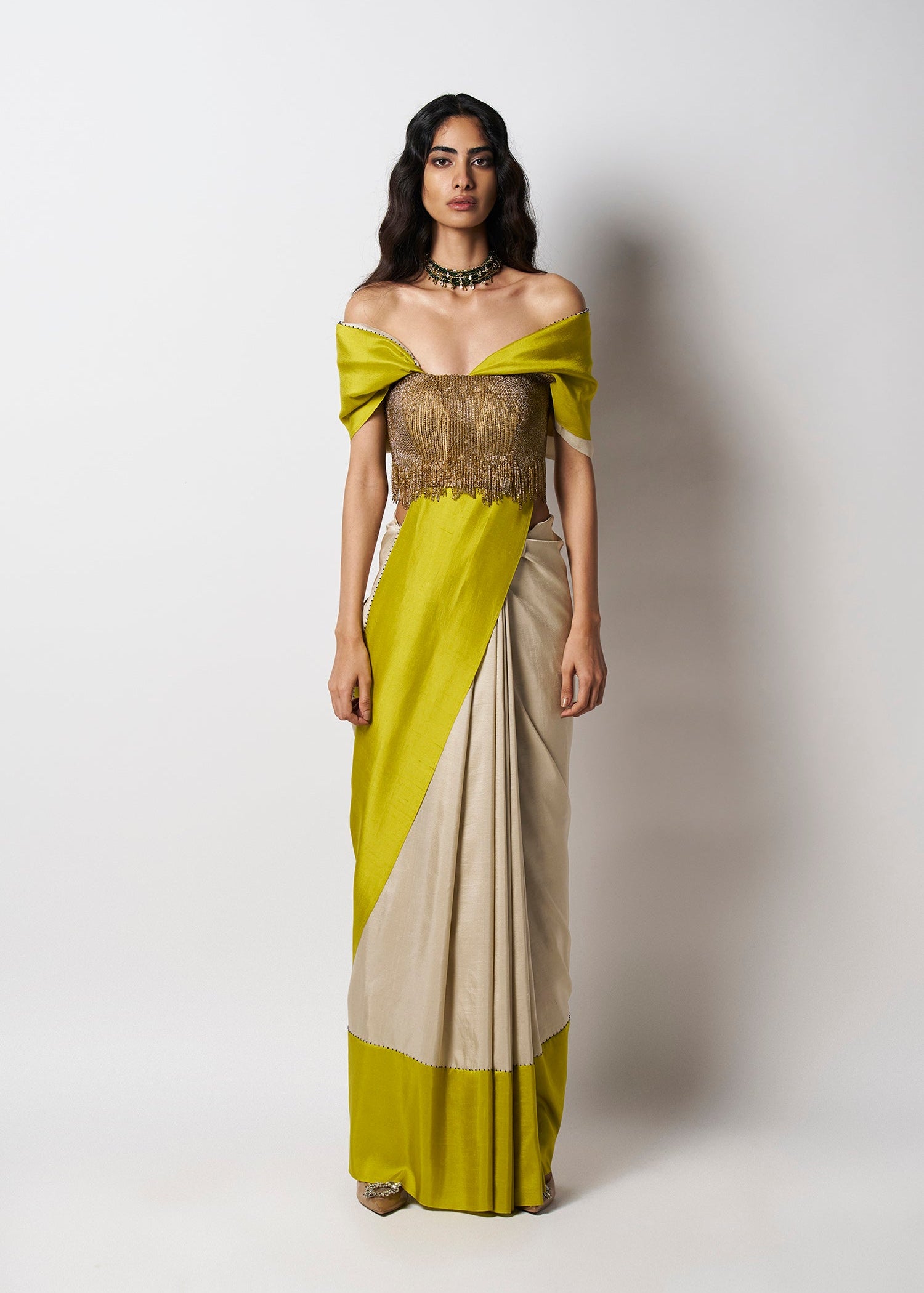 This artistic overlap of a collection redefines the sari, embodying culture and comfort. It's a revolutionary coming together of invention and tradition, like never before.