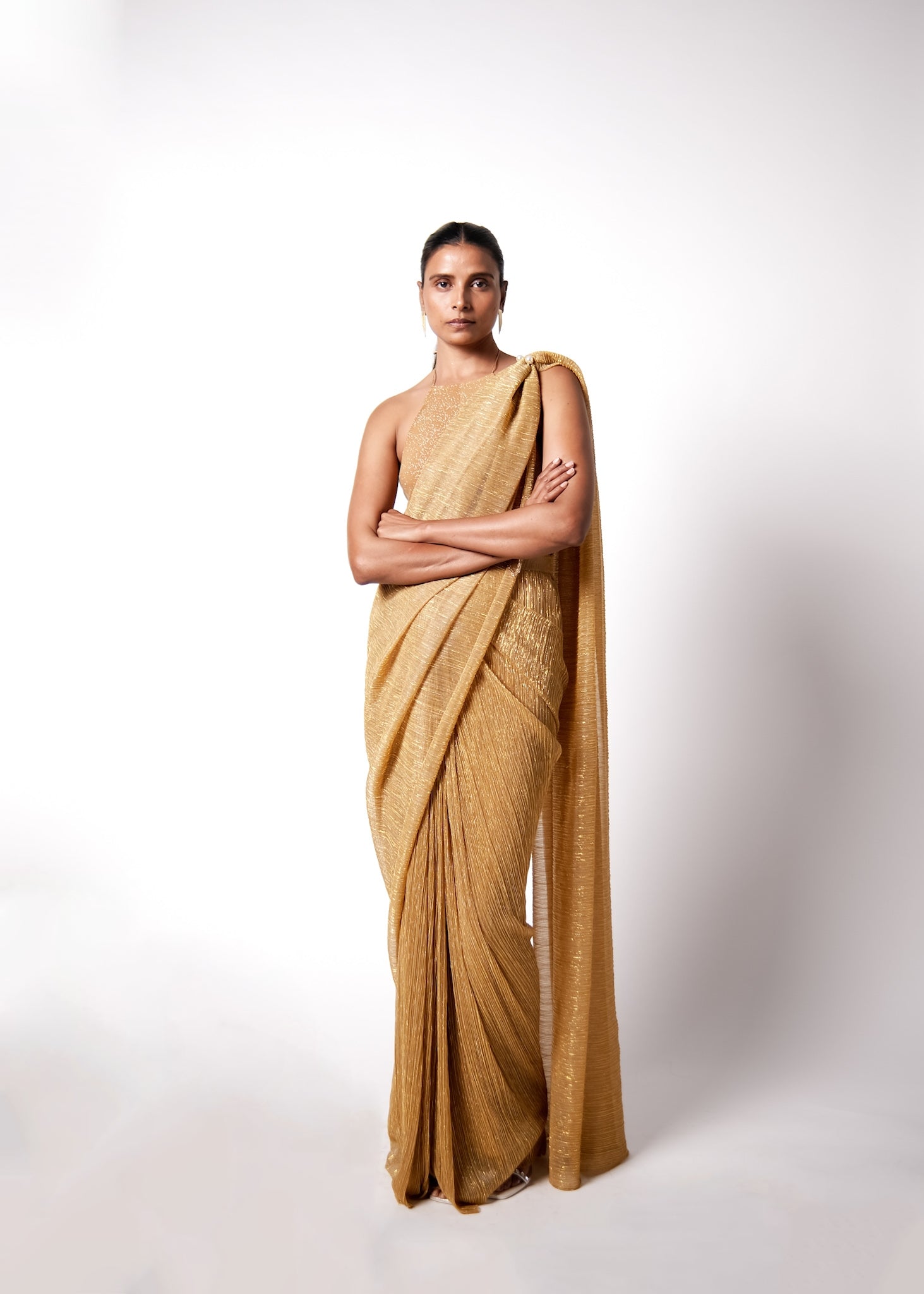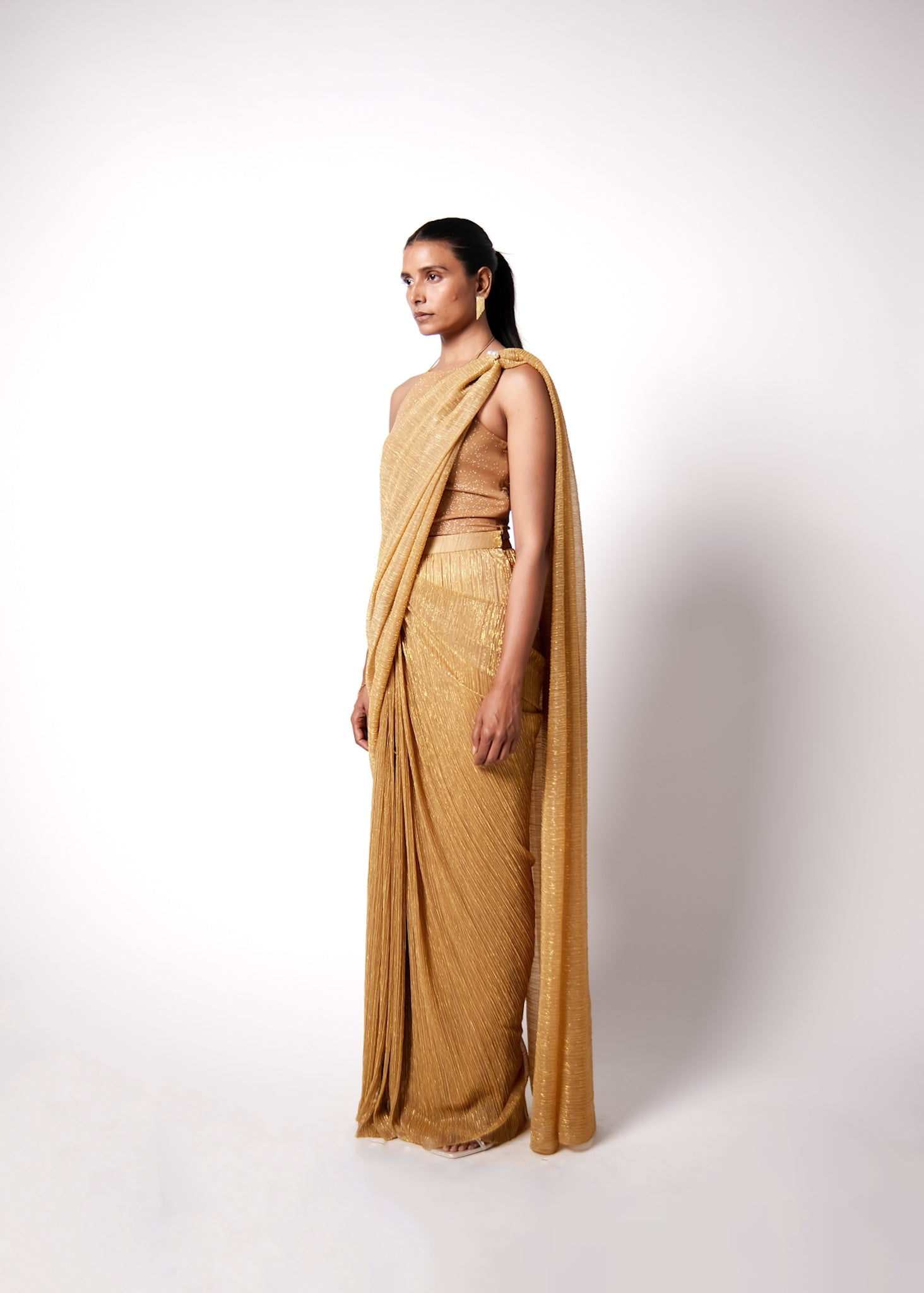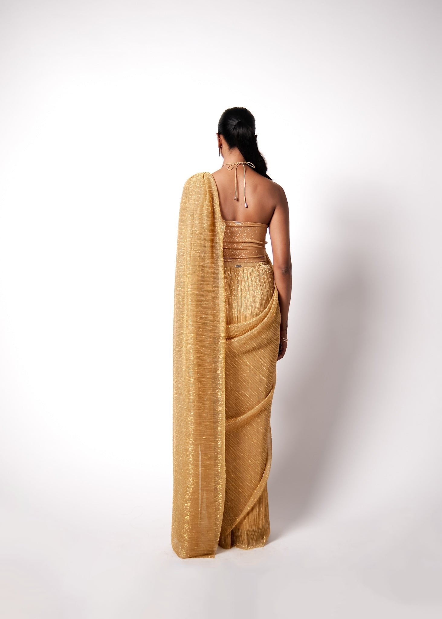 The EZ Sari is a pre draped sari but gives the look of a traditional normal sari. Made in shimmer net, it is fuss free and really light to wear. An added pearl clasp detail on the drape of the pallu gives it a fresh look. The sari closes on the side with a concealed zipper. Pair it up with our halter top made in a slinky jersey and you have an easy but sexy outfit ready for you next festivities.