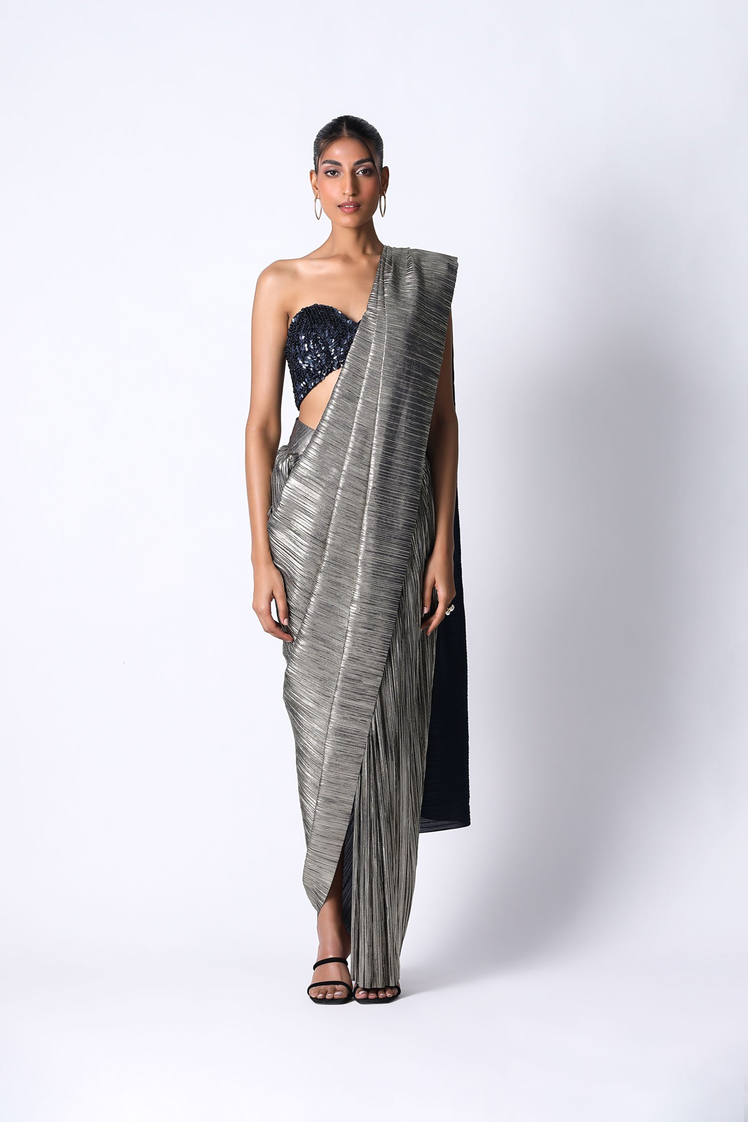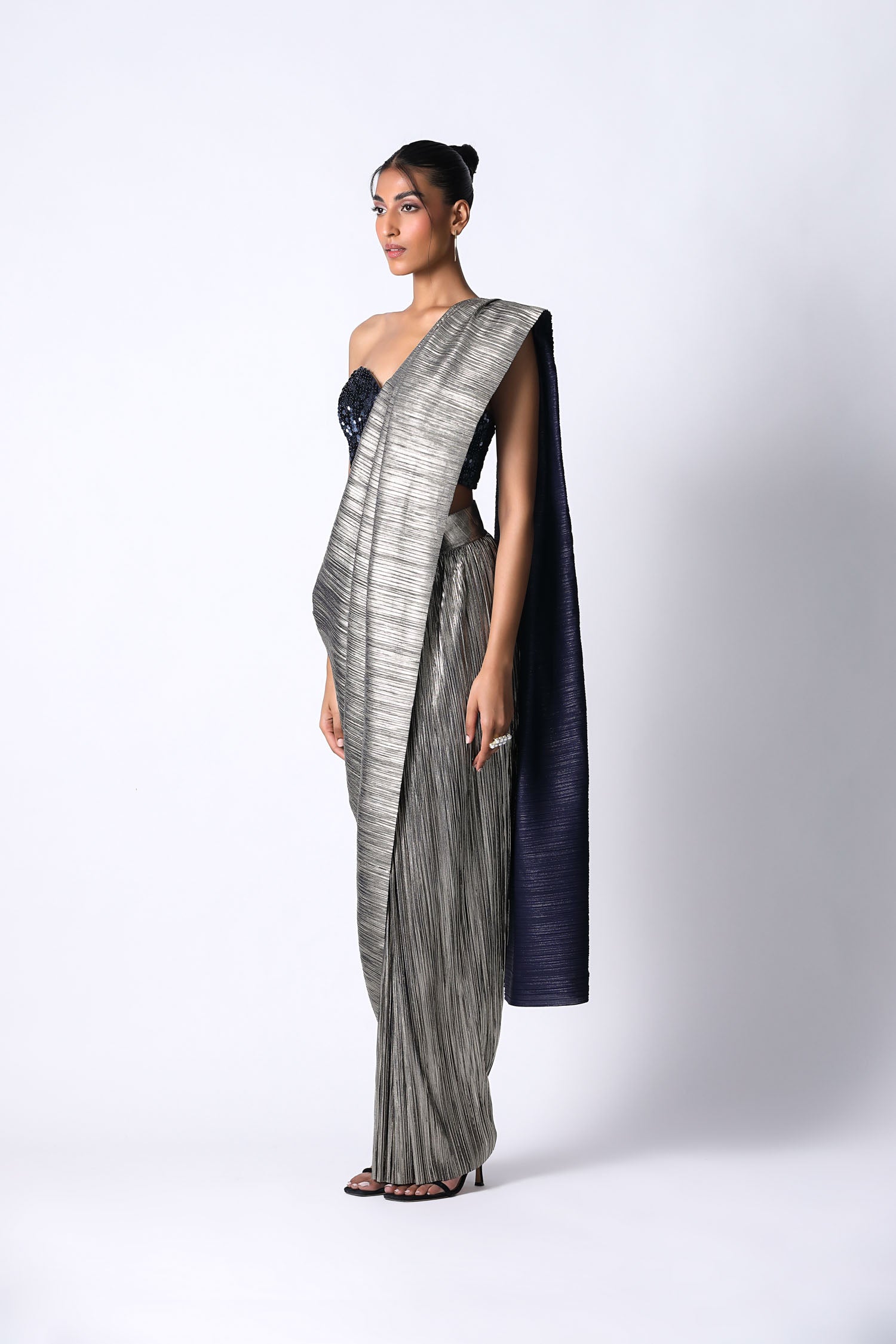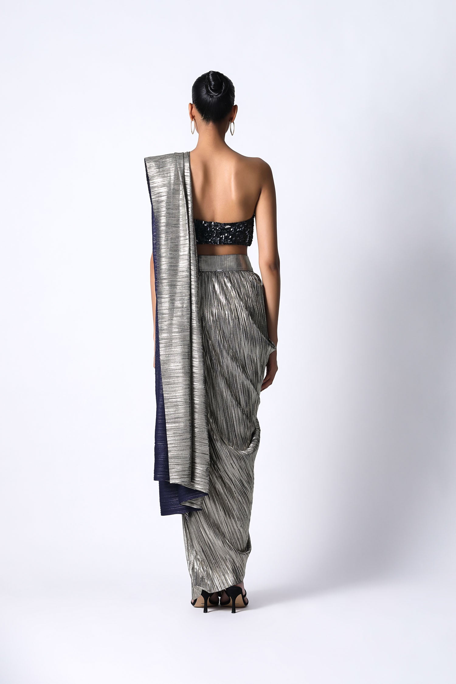 Our Metallic 2.0 comes with a built in petticoat. Lightweight, fuss free and easy to wear, it’s the perfect piece to carry to destination weddings. Pair it with our Corset Bustier which is embroidered with navy blue sequins in the front and black sequins at the back. The blouses closes at the back with hooks. .