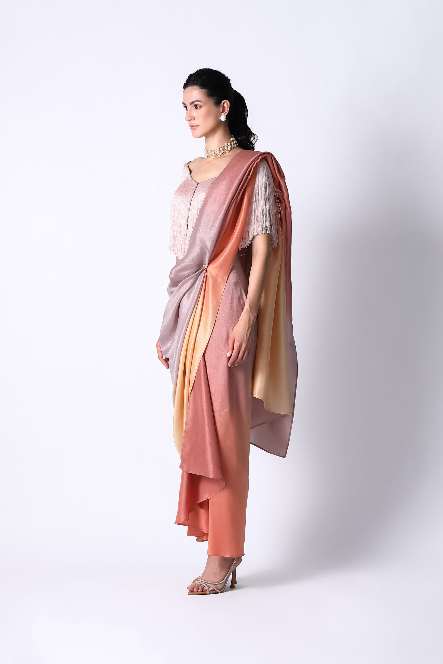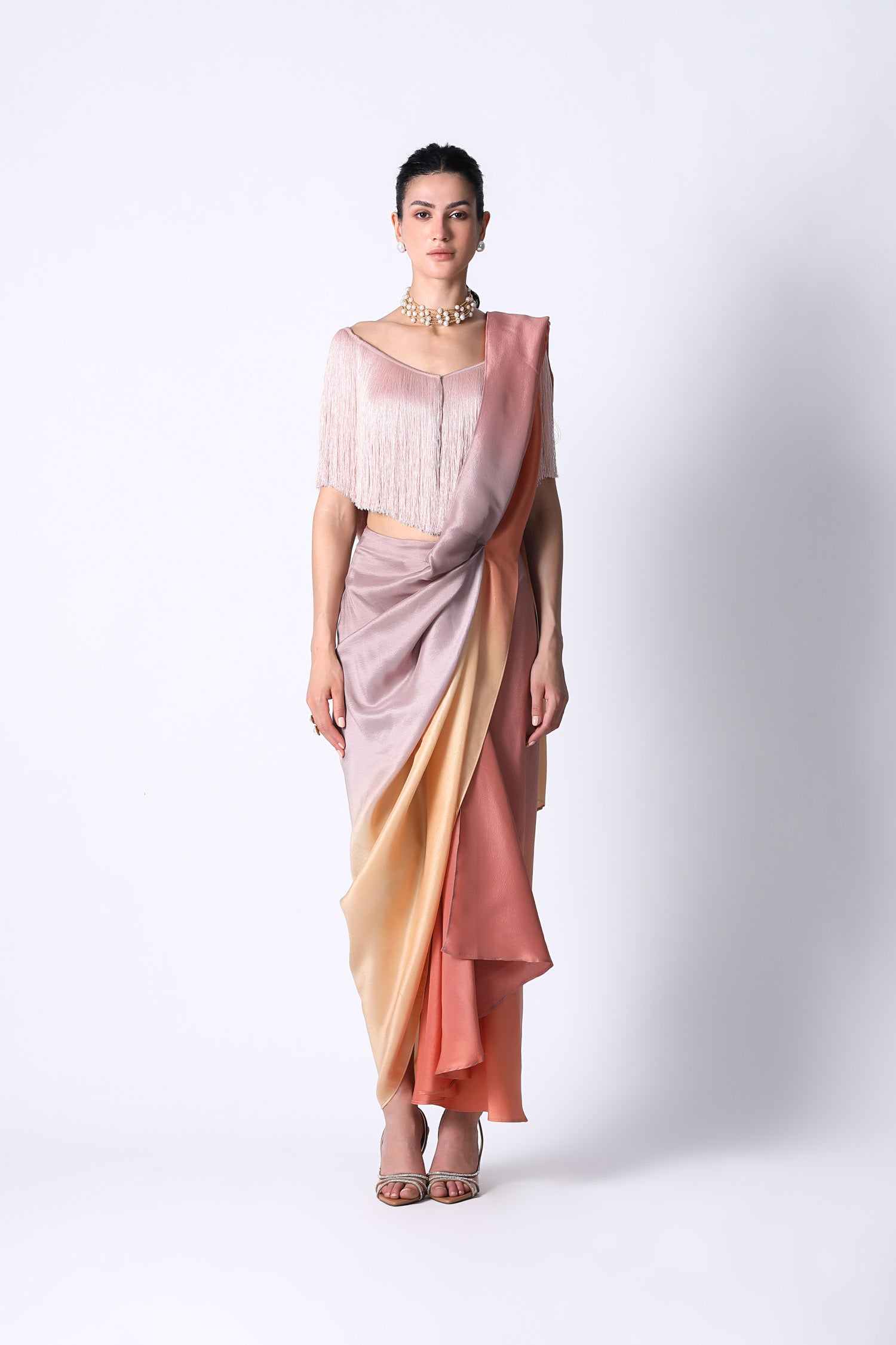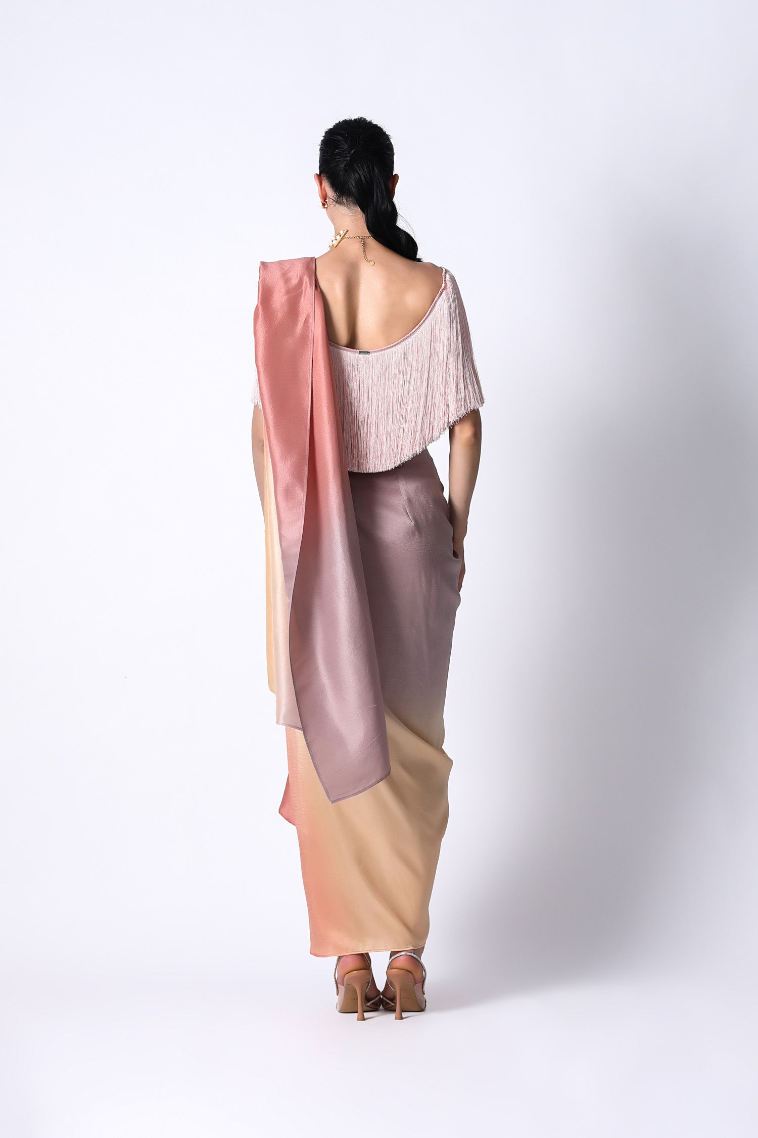 The classic Masai Godet Sari gets a new look with a 4 way ombré treatment. With a built in petticoat, the pallu gets attached to the waist with the clever use of a snap button and stays on while you are on the move. Pair it with our erica shoulder fringe top which has an off shoulder and closes in the front with hooks.