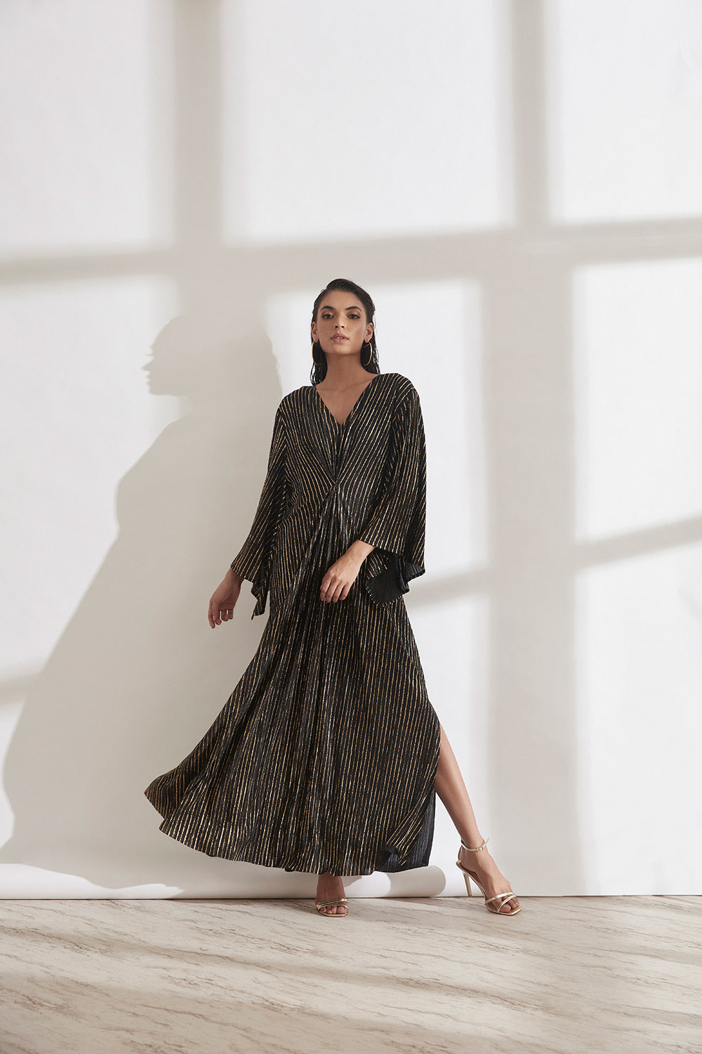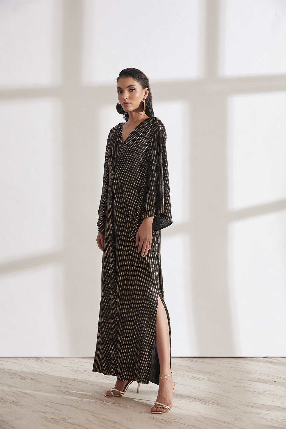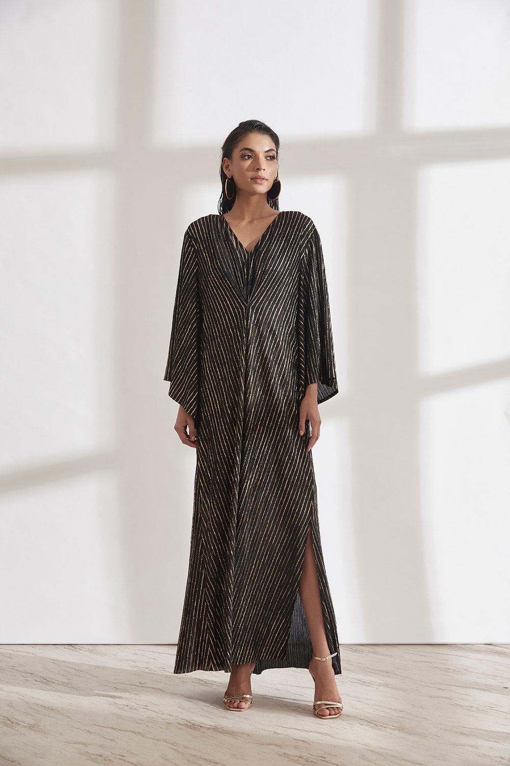 A relaxed fit Kaftan Dress with a pleated detail on the front waist that shapes the body slightly. The flowy sleeves add some drama to an otherwise simple garment. Knee high slits on both sides.