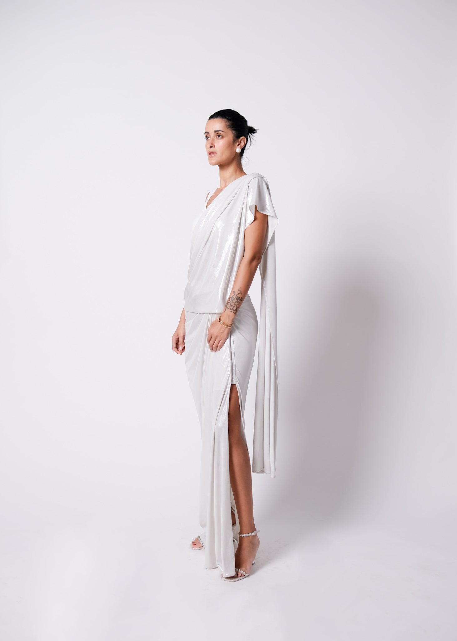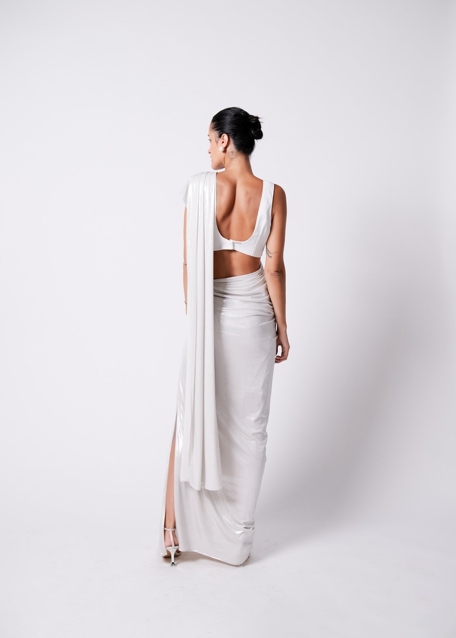 The new drape for the season, The Liquid Annie Sari has a side drape detail and looks like a dress from the front. Cut in a luxe jersey, it takes the shape of your body and comes with an attached petticoat. Closes on the side with hooks and snap buttons it is really easy to wear and barely requires any ironing. Pair it with a simple plain blouse or wear it with a t-shirt for a modern cool look.