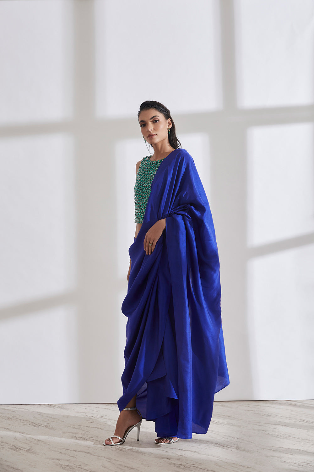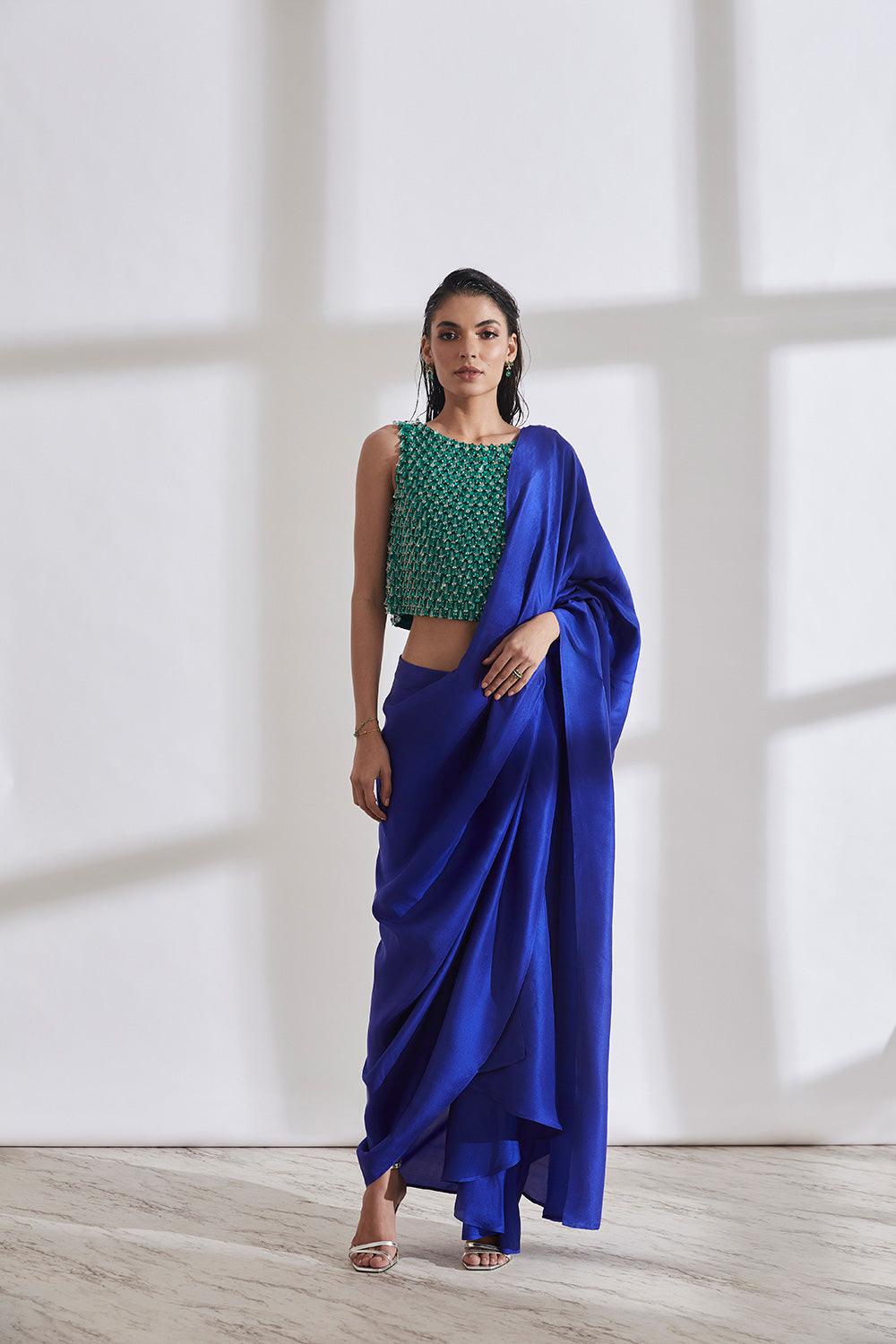 Colour block your outfit with the Chandelier Top which is hand embroidered over a span of 8 days. The Masai Godet Sari is pre draped and has a built in petticoat.