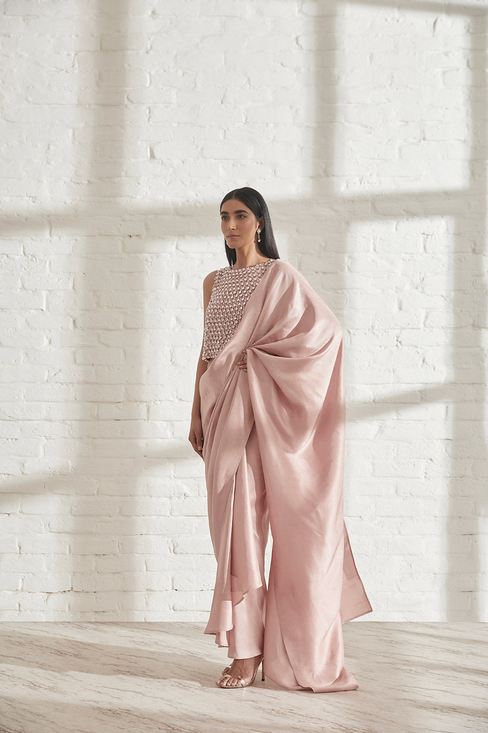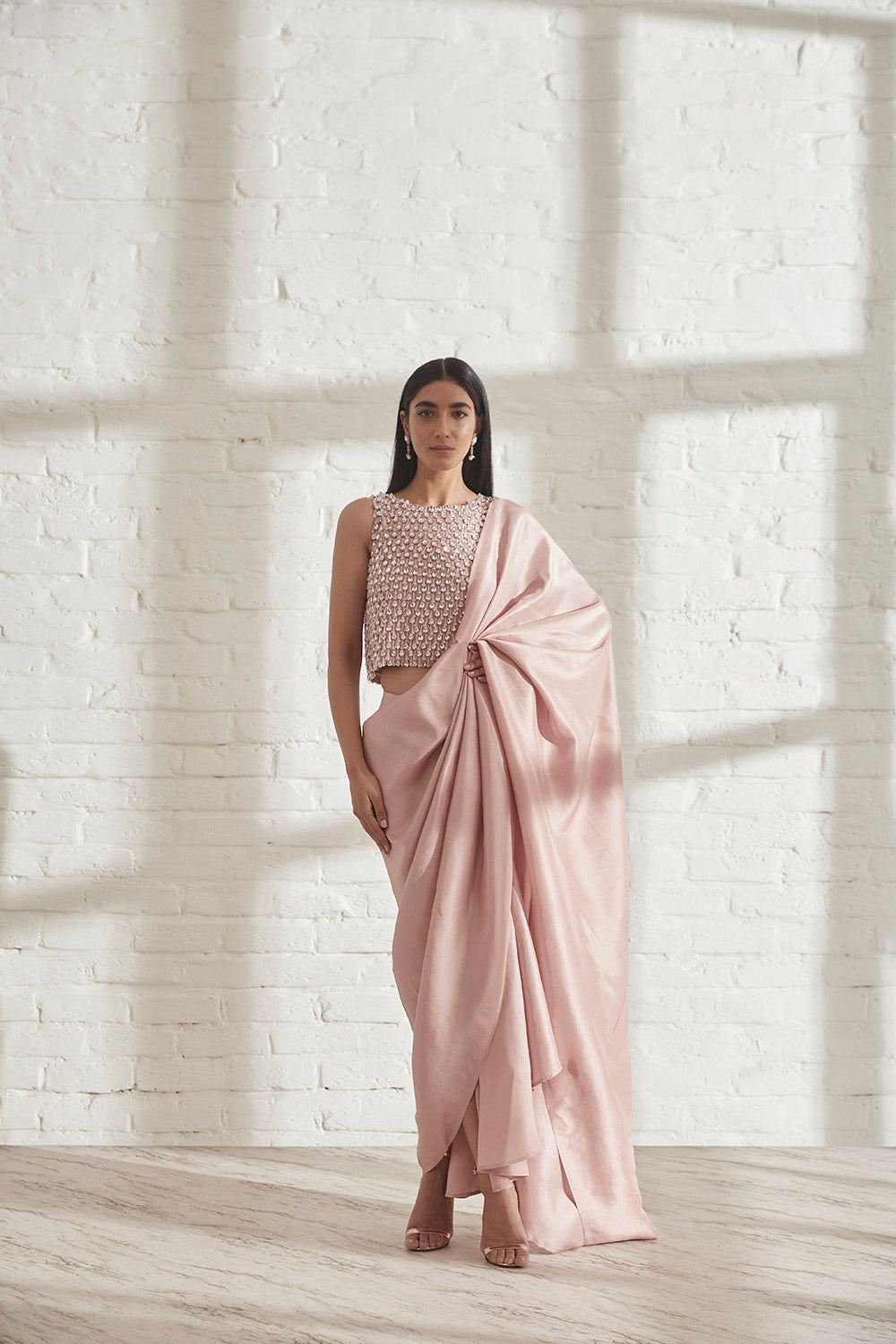 The opulence of the Chandelier Top offsets the subtlety of the Masai Godet Sari perfectly. The top closes on the side with a zip and is a boxy fit. The pre draped sari wraps around the body and closes in the front.