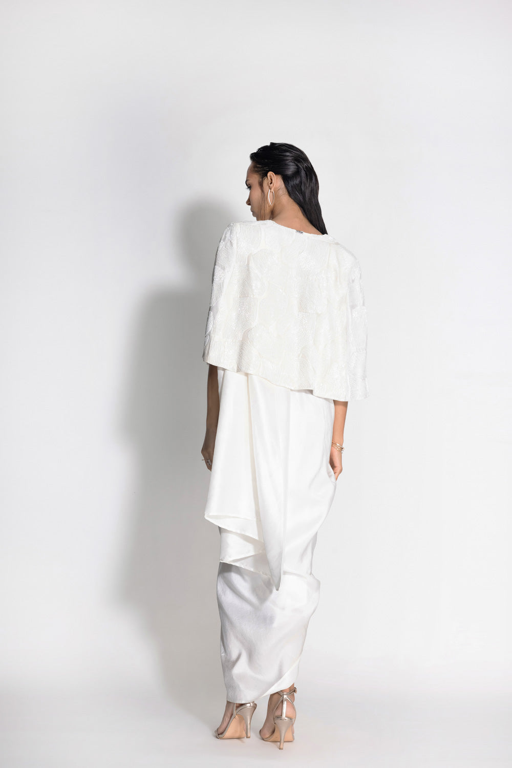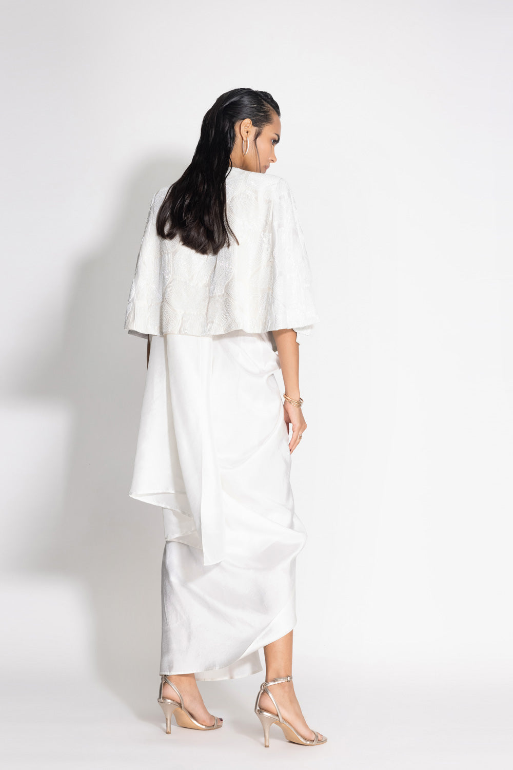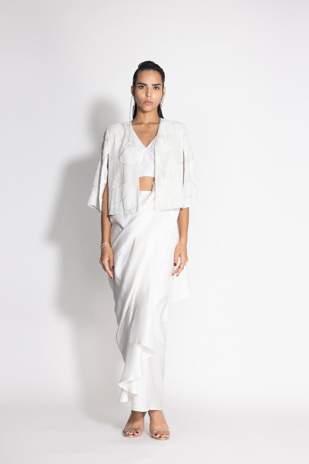 Our Masai Godet Sari is pre draped and fuss free . With a built in petticoat, the pallu gets attached to the waist with the clever use of a snap button and stays on while you are on the move. Go all white with our embroidered blouse and our favourite Wave Cape which is very versatile.