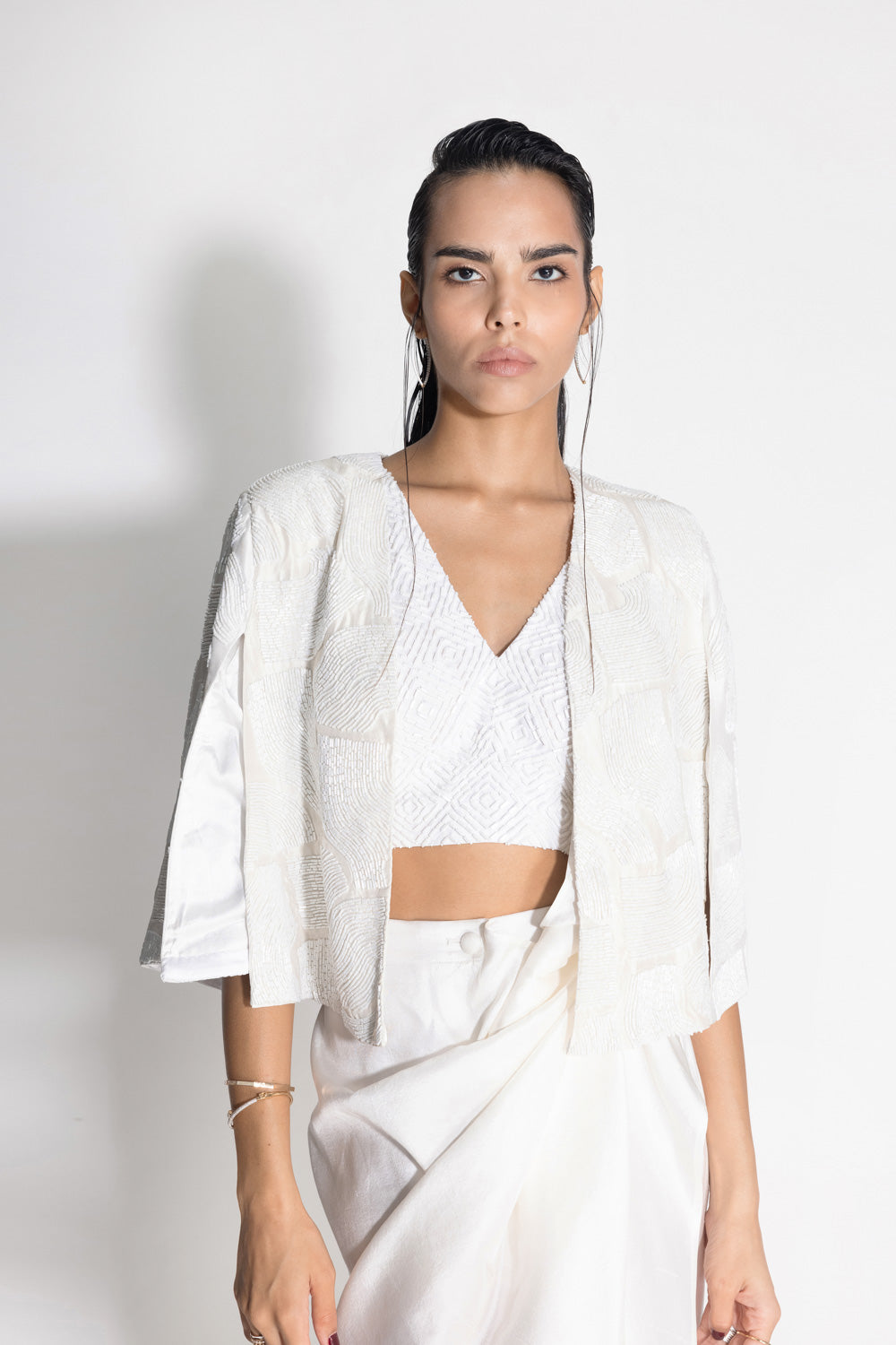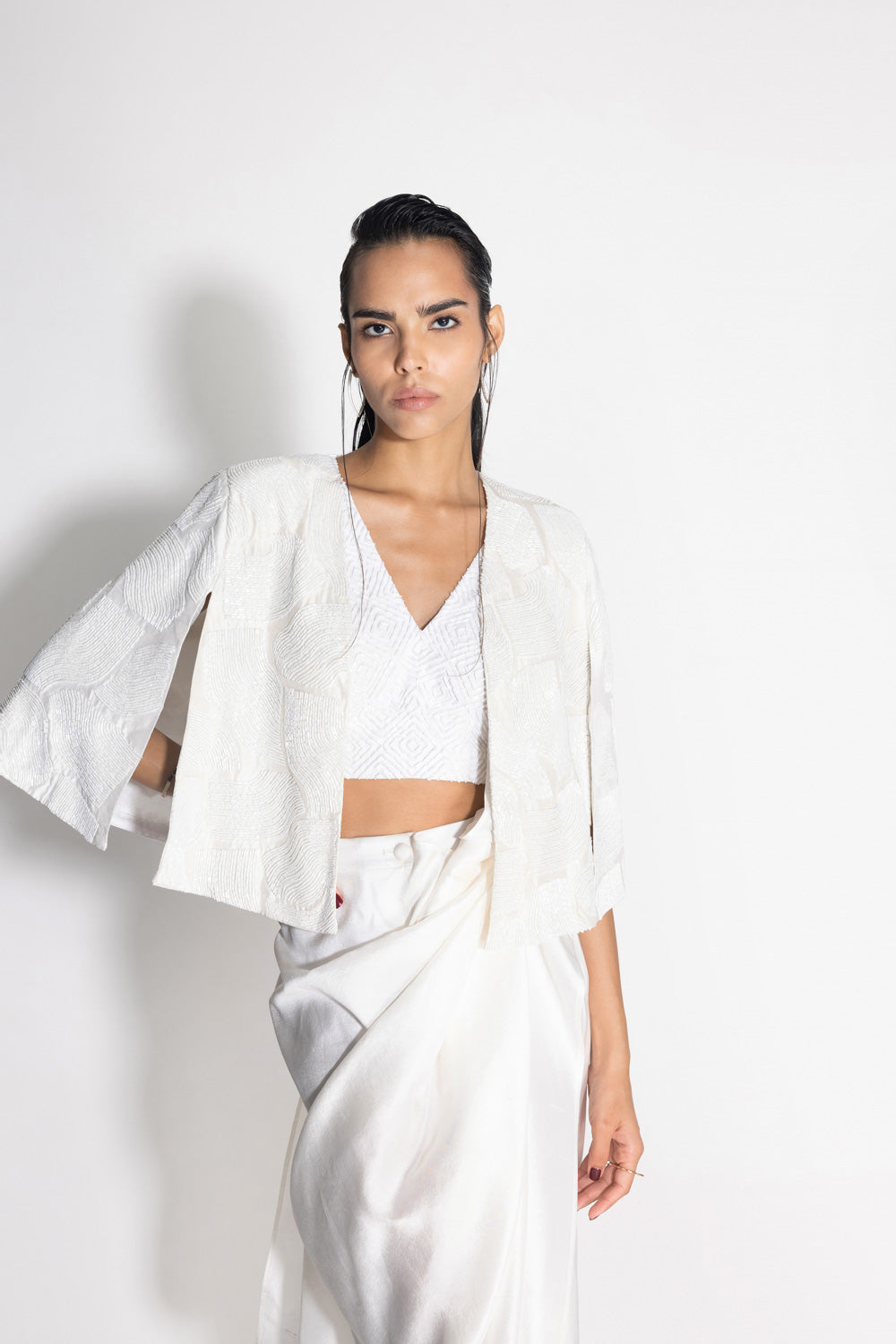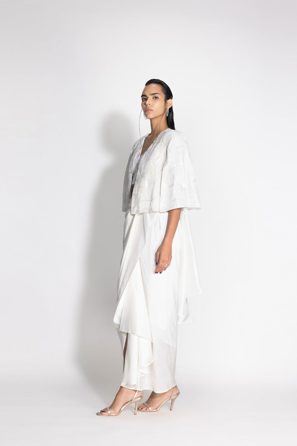 Our Masai Godet Sari is pre draped and fuss free . With a built in petticoat, the pallu gets attached to the waist with the clever use of a snap button and stays on while you are on the move. Go all white with our embroidered blouse and our favourite Wave Cape which is very versatile.