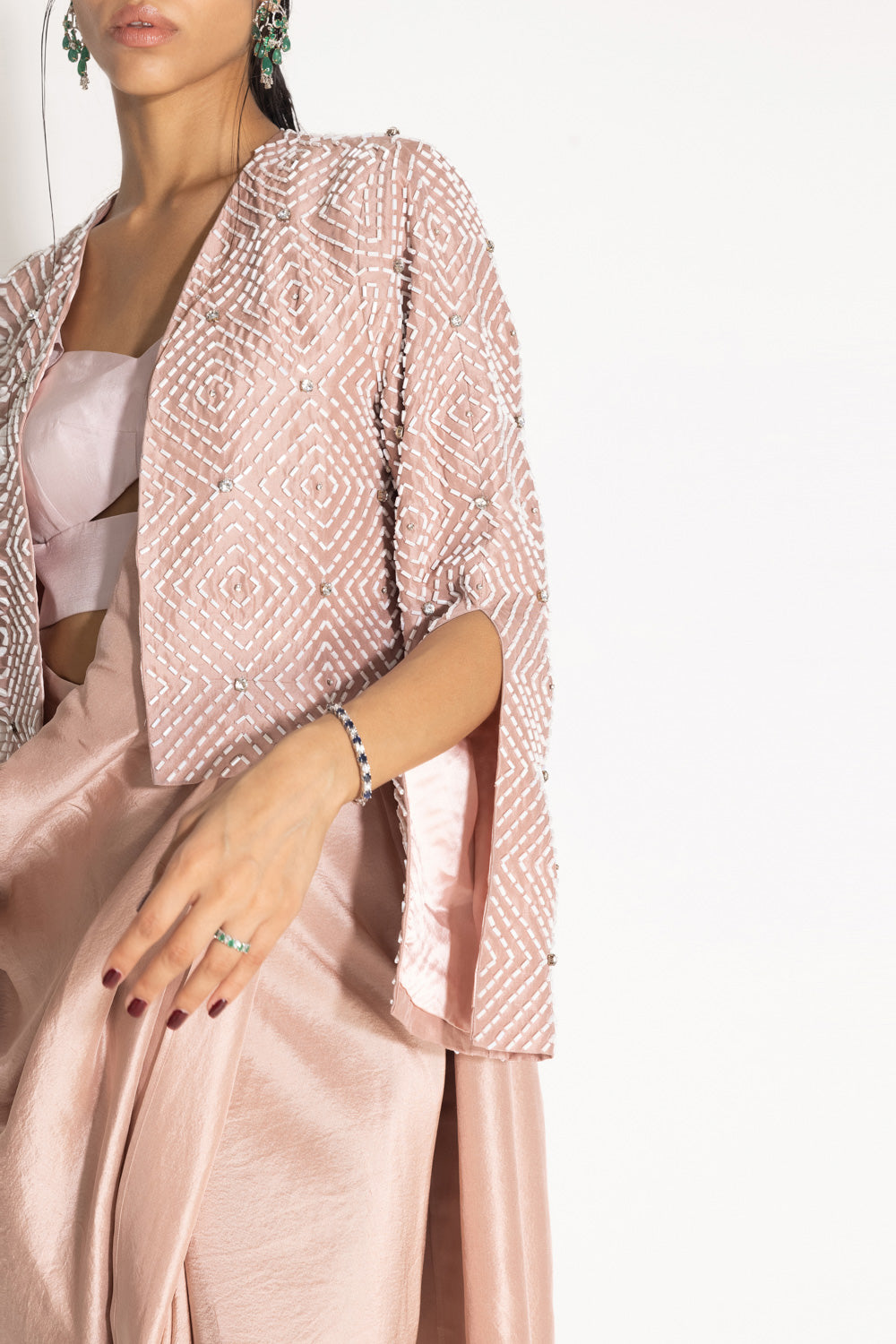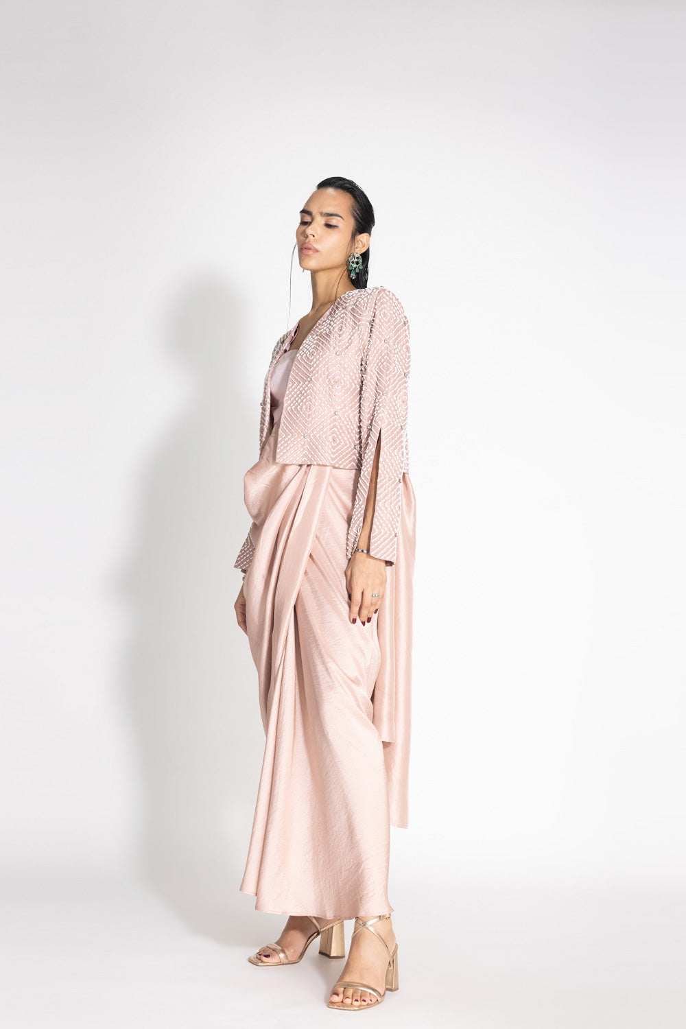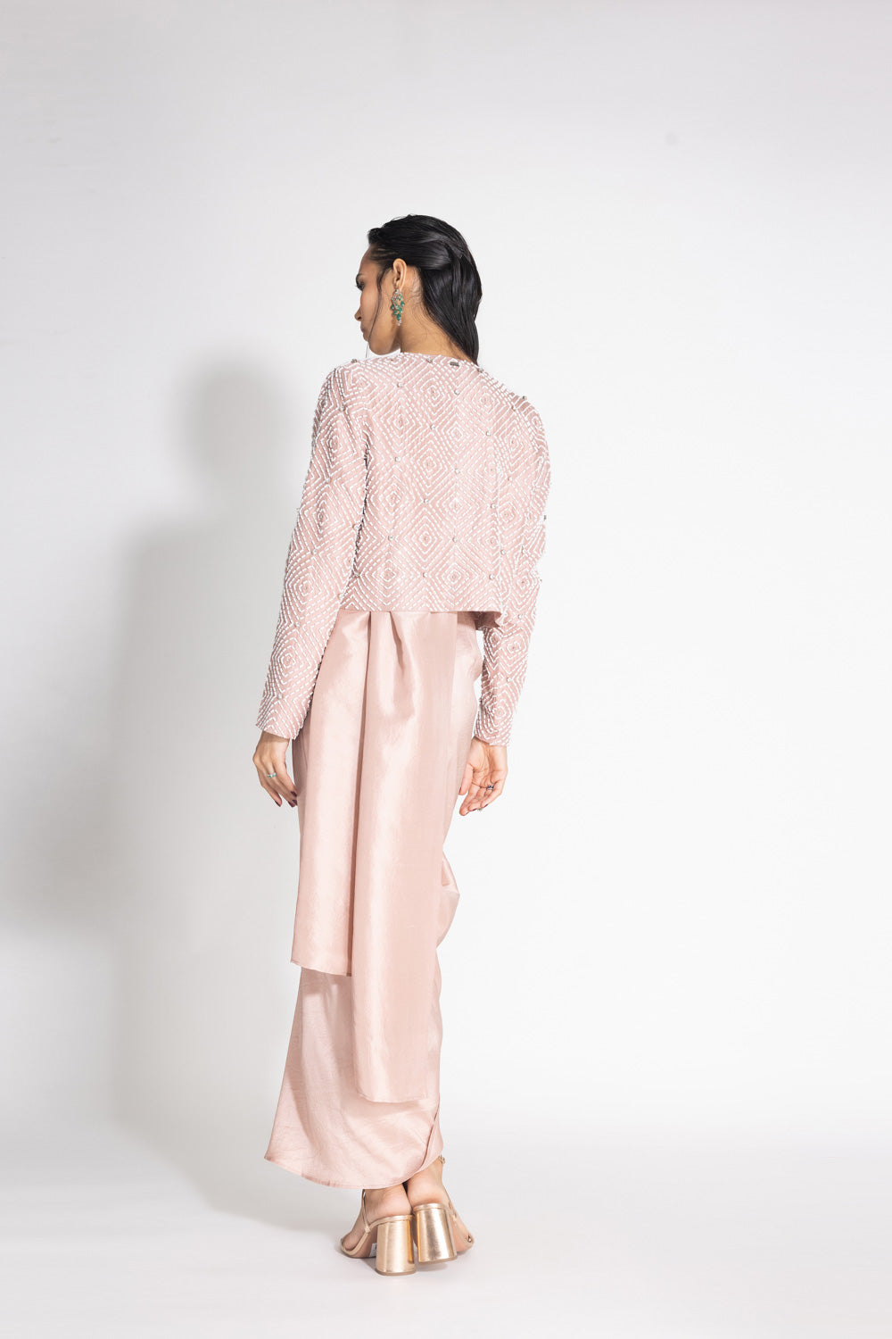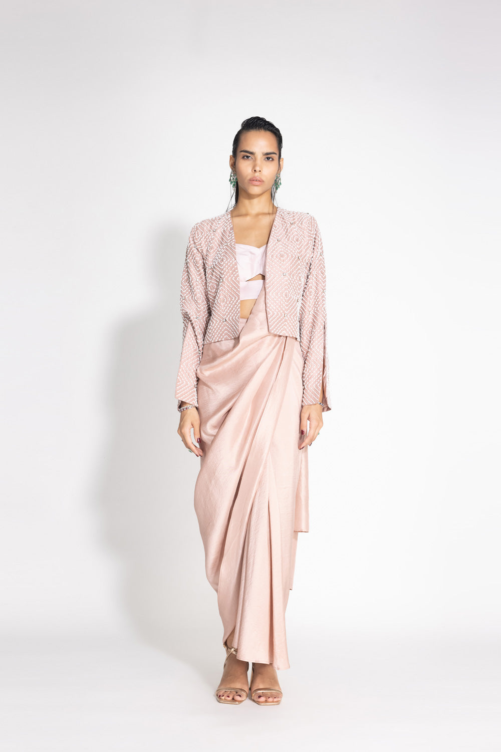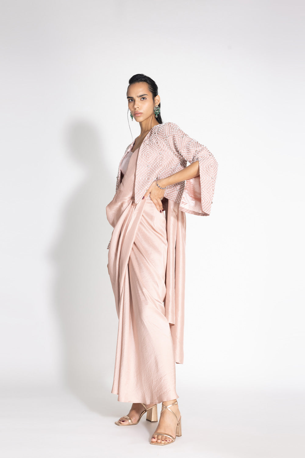 Our Masai Godet Sari is pre draped and fuss free . With a built in petticoat, the pallu gets attached to the waist with the clever use of a snap button and stays on while you are on the move. Layer it with our embroidered jacket for the colder days.