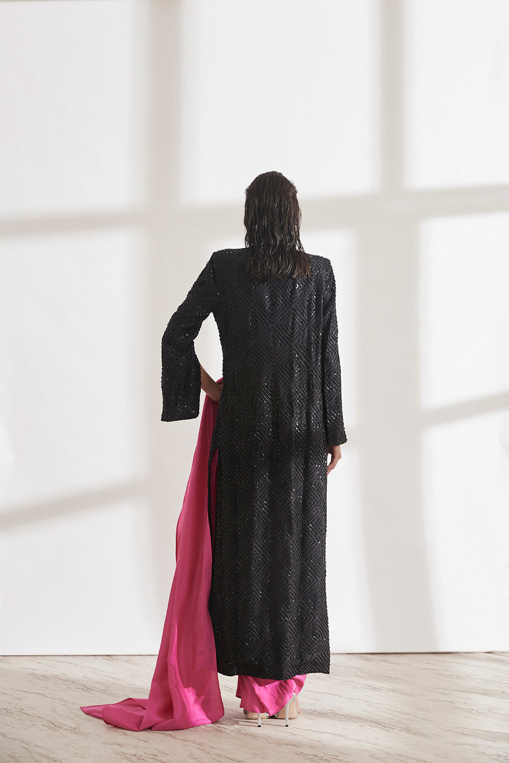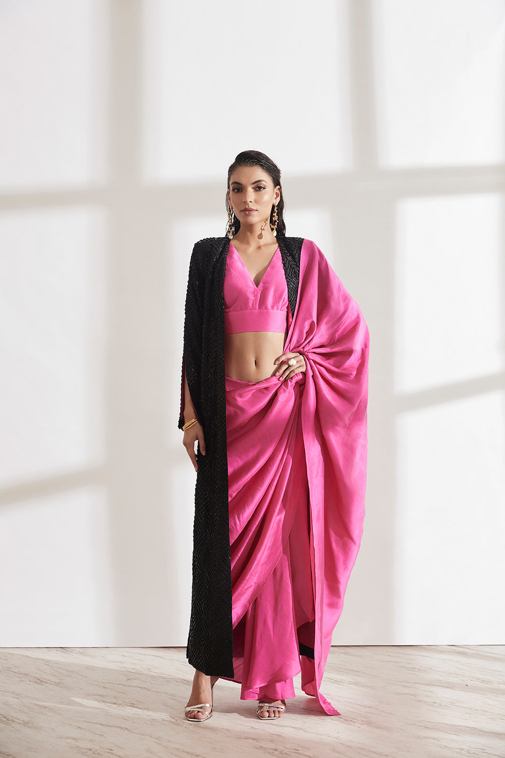 Hand embroidered statement Masai Jacket over statement colours. The fuss free Masai Godet Sari is pre draped and has an in built petticoat. Options available to customize the blouse.