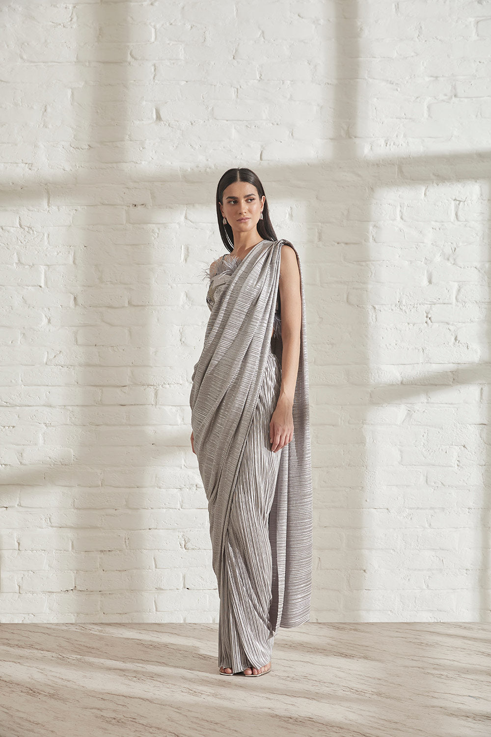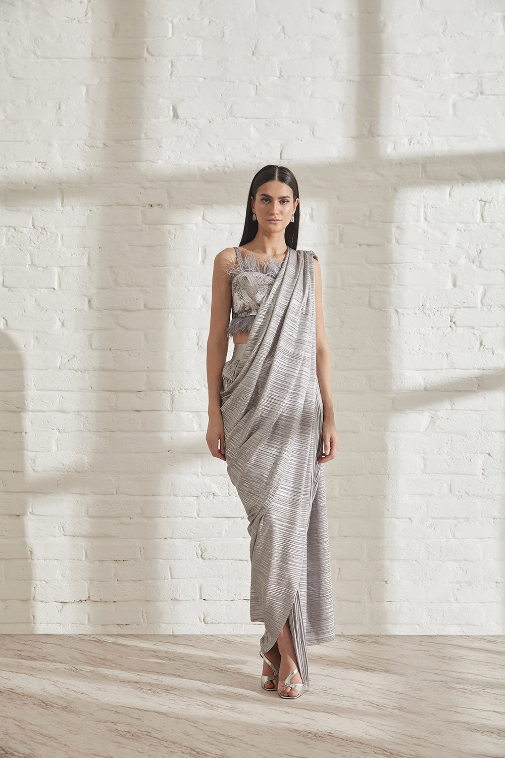 Our signature Metallic 2.0 Sari comes with a built in petticoat. Lightweight, fuss free and easy to wear, it’s the perfect piece to carry to destination weddings.