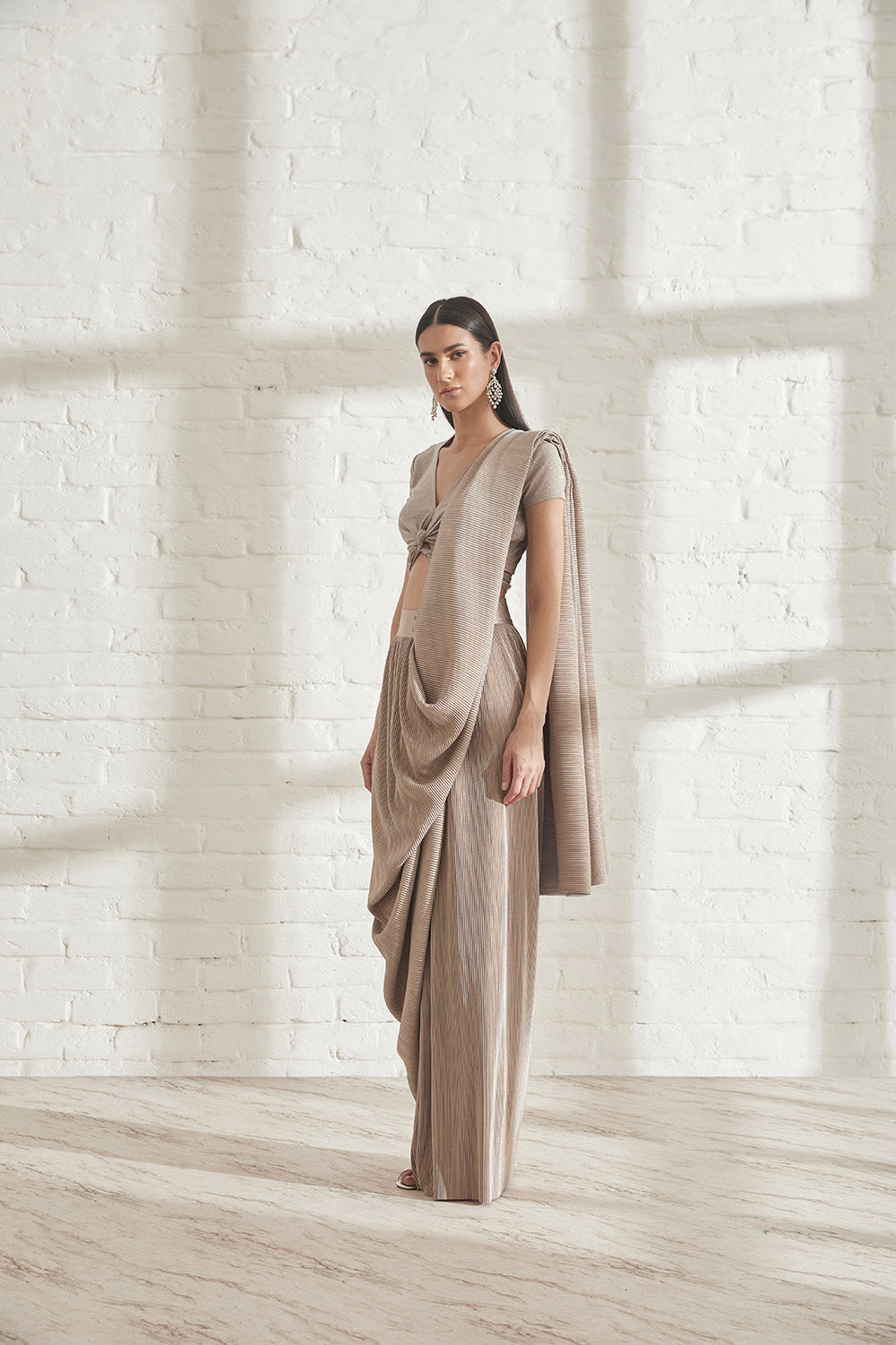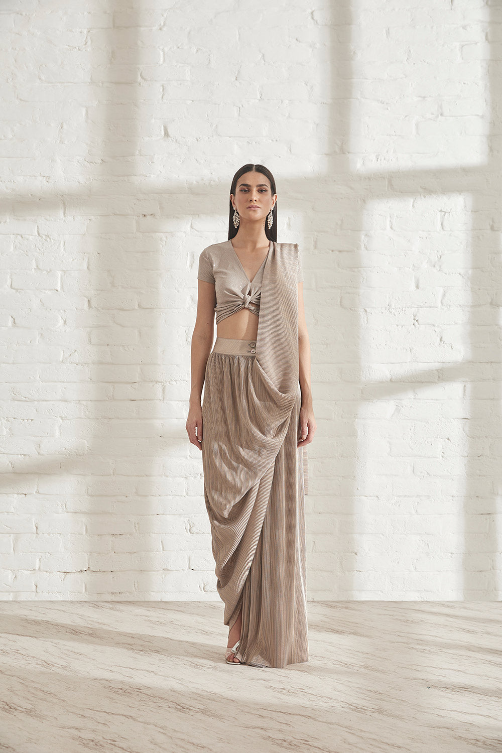 Our signature Metallic 2.0 Sari comes with a built in petticoat. Lightweight, fuss free and easy to wear, it’s the perfect piece to carry to destination weddings. The jersey blouse adds the element of sexy.