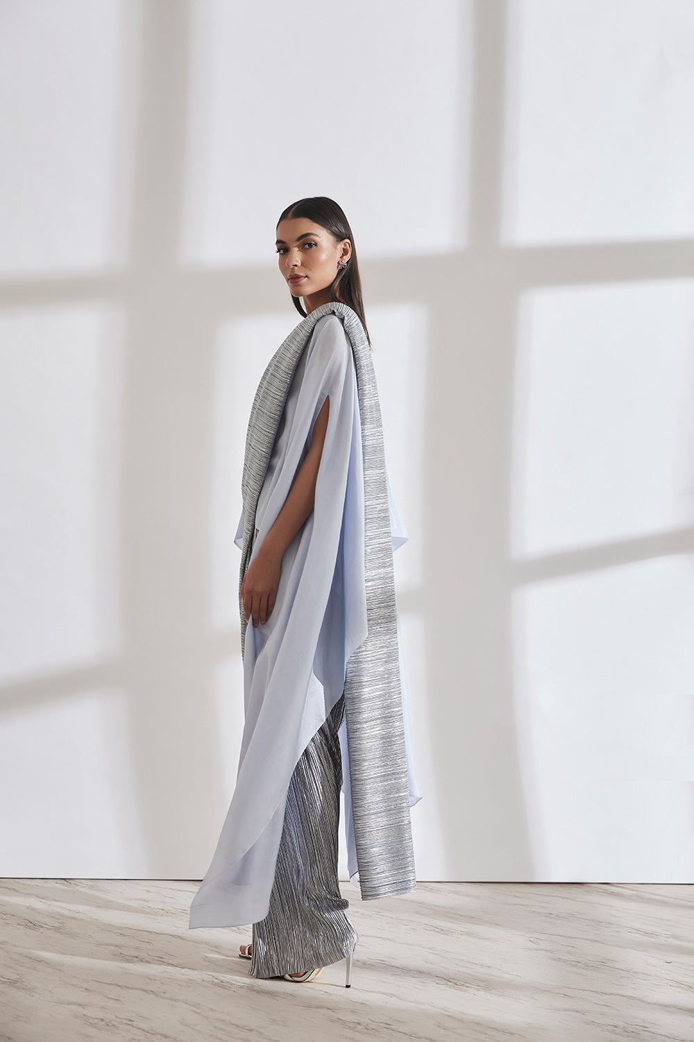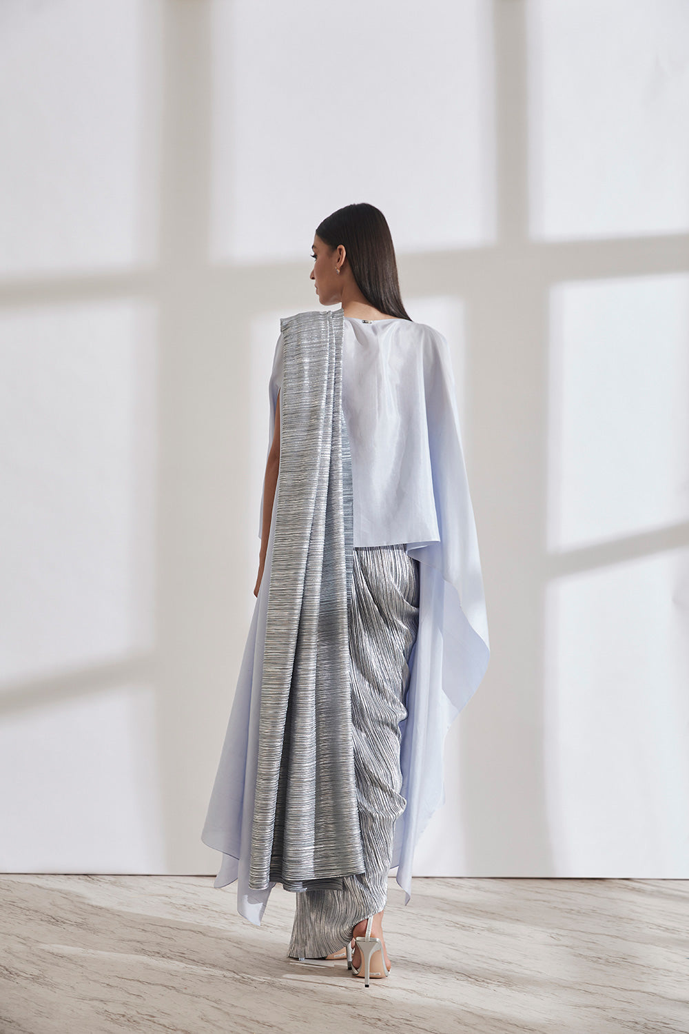 Our signature Metallic 2.0 sari features a built in petticoat. Lightweight, fuss free and easy to wear, it’s the perfect piece to carry to destination weddings. Pair it up with a cape to keep the look modern.