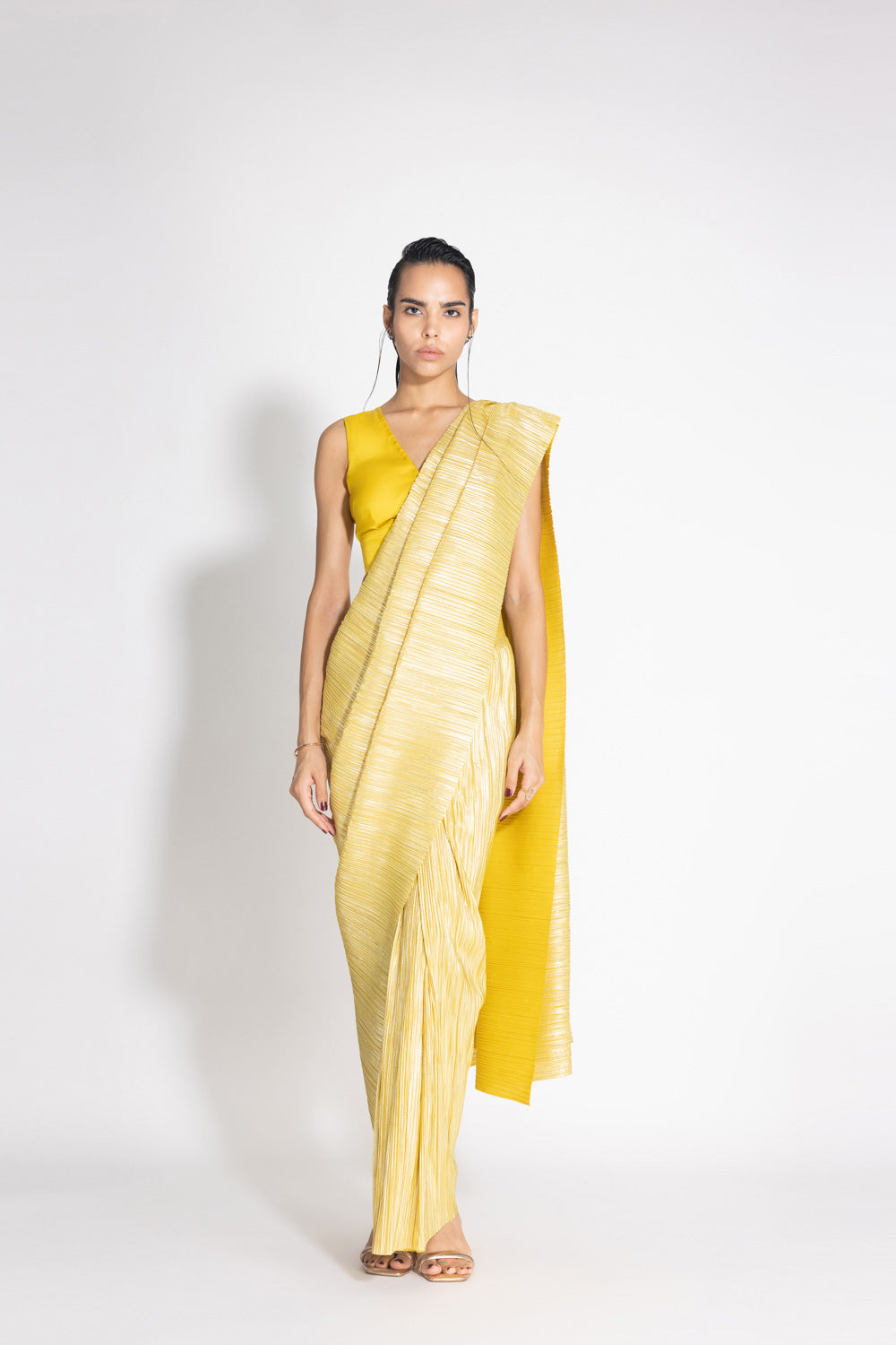 Our signature Metallic 2.0 Sari comes with a built in petticoat. Lightweight, fuss free and easy to wear, it’s the perfect piece to carry to destination weddings. Pair it with our silk blouse or a cape as well.