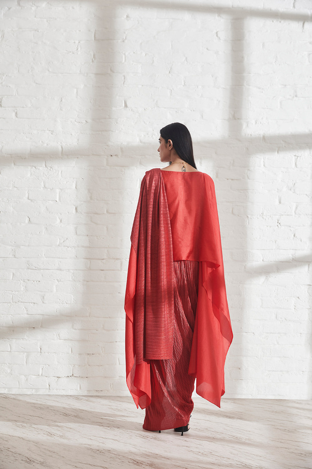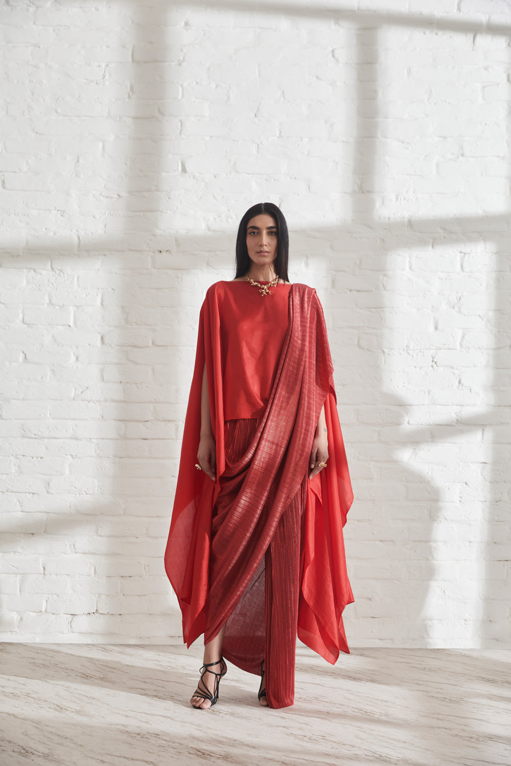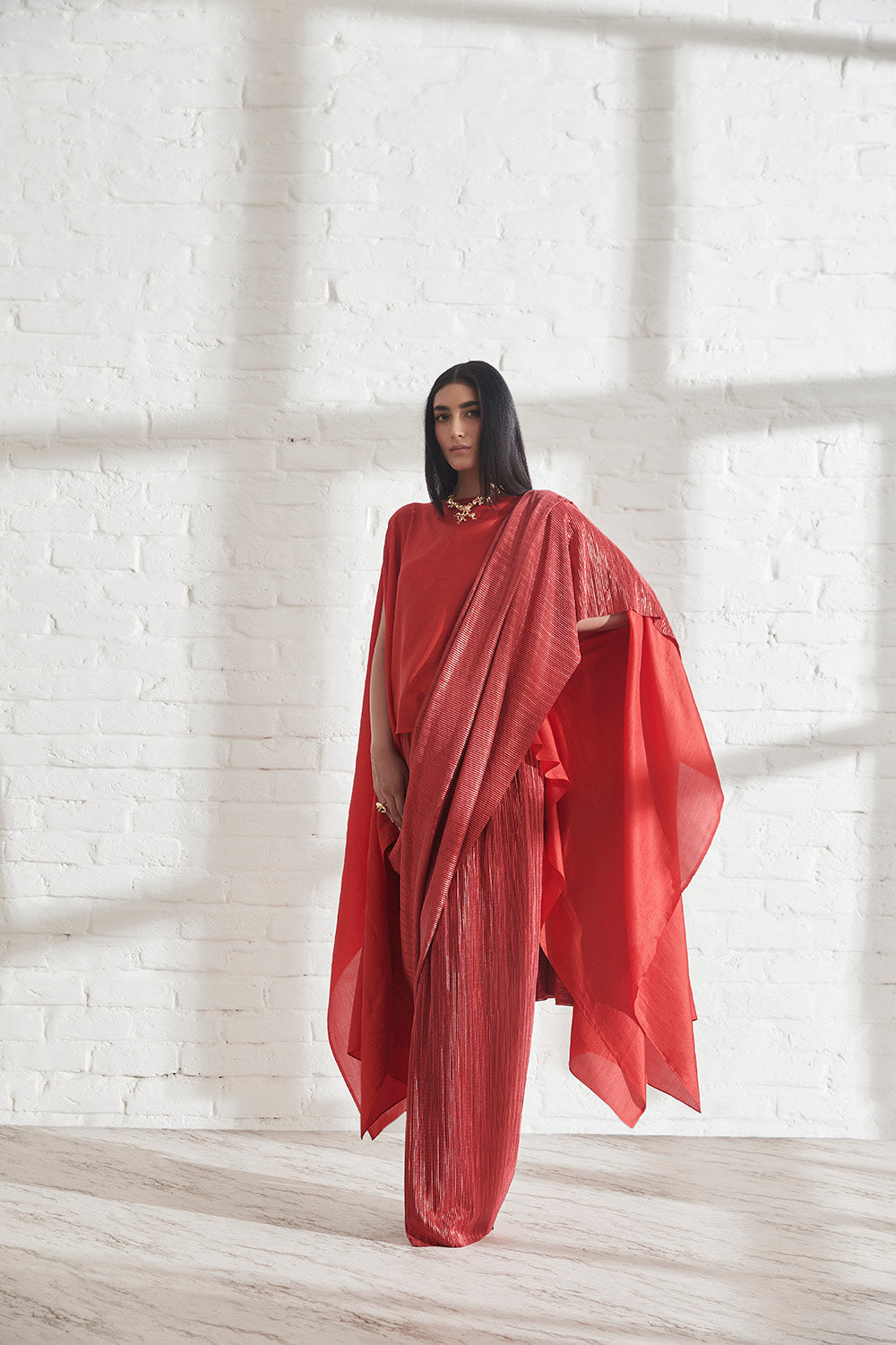 Our signature Metallic 2.0 Sari comes with a built-in petticoat. Lightweight, fuss-free and easy to wear, it’s the perfect piece to carry to destination weddings. Pair it up with a cape to keep the look more modern.