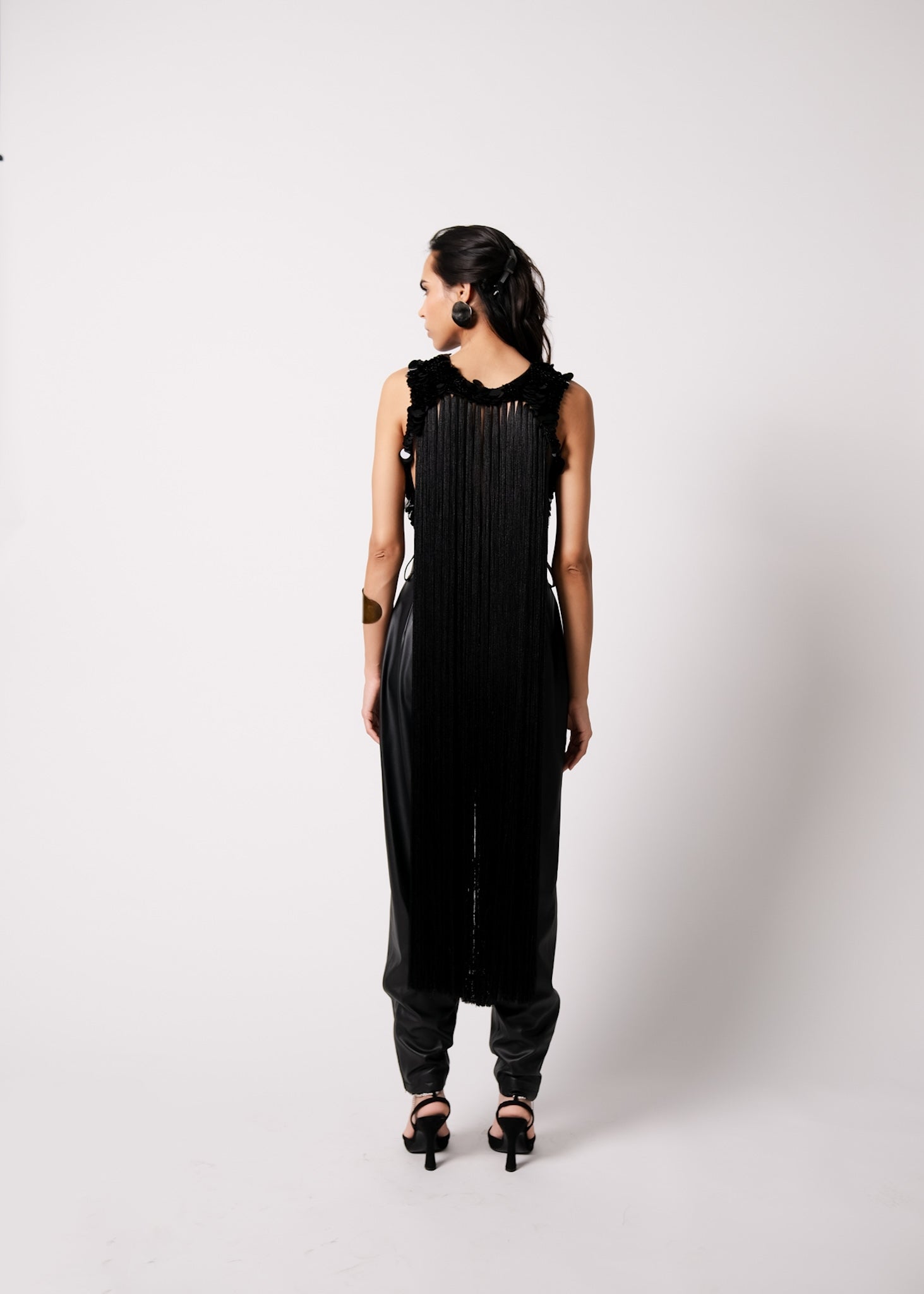 The Nemo Blouse is an amalgamation of our bestselling sequins and fringe. It has a deep V neck and a curved shaped hemline. The back features a cut out which is detailed with a long fringe that looks like a cape. This statement blouse can be worn with pants or a sari.