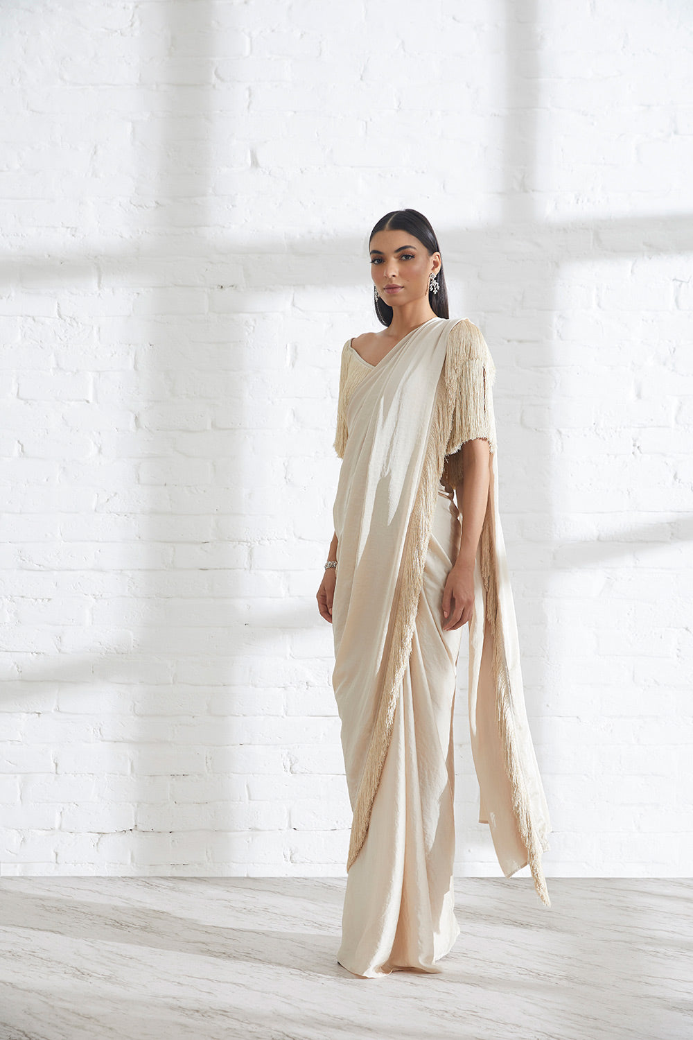 Our Noor Fringe Sari features a full pre-draped sari that looks like a regular sari with our signature fringe detail. Pair it with the slightly off shoulder fringe top or get in touch for more blouse options.