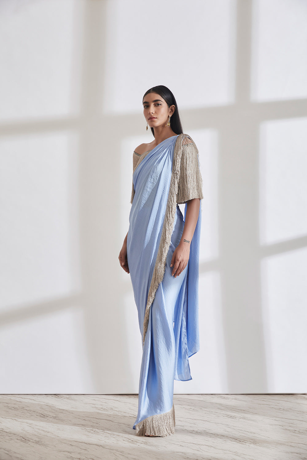 Our Noor Fringe Sari features a full pre-draped sari that looks like a regular sari with our signature fringe detail. Pair it with the off shoulder fringe top or get in touch for more blouse options.