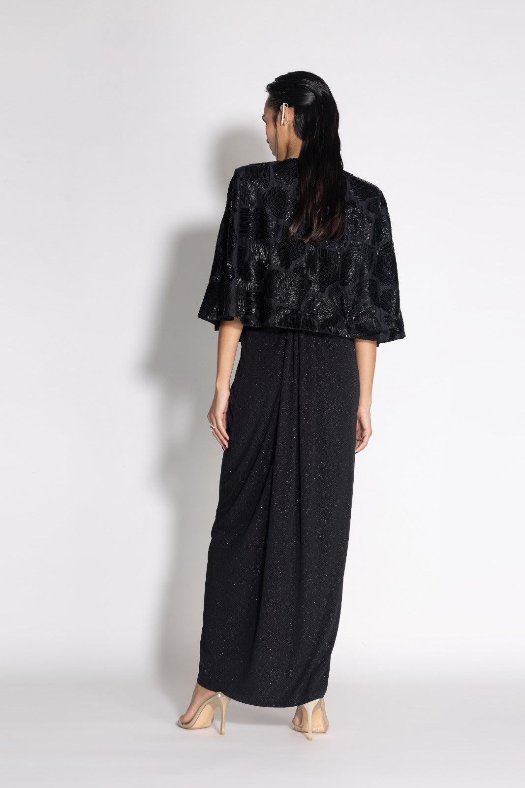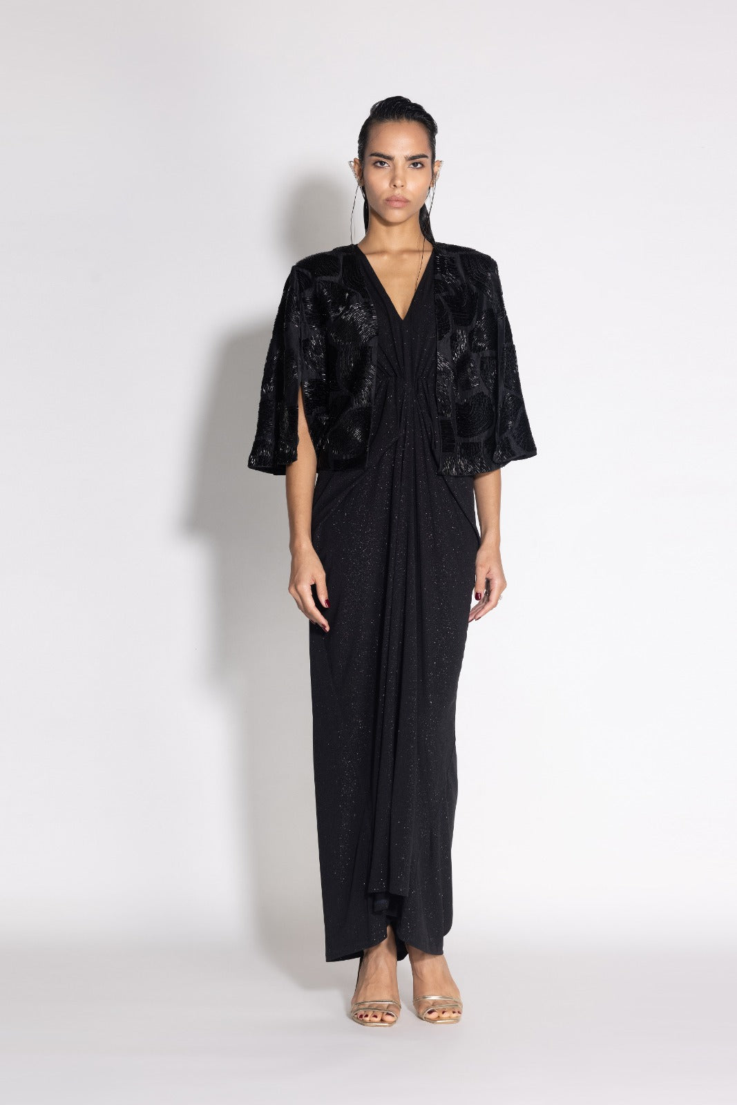 The Pleated Dress made in a shimmer jersey has a pleated drape detail at the waist that gives a flattering shape to any body type.