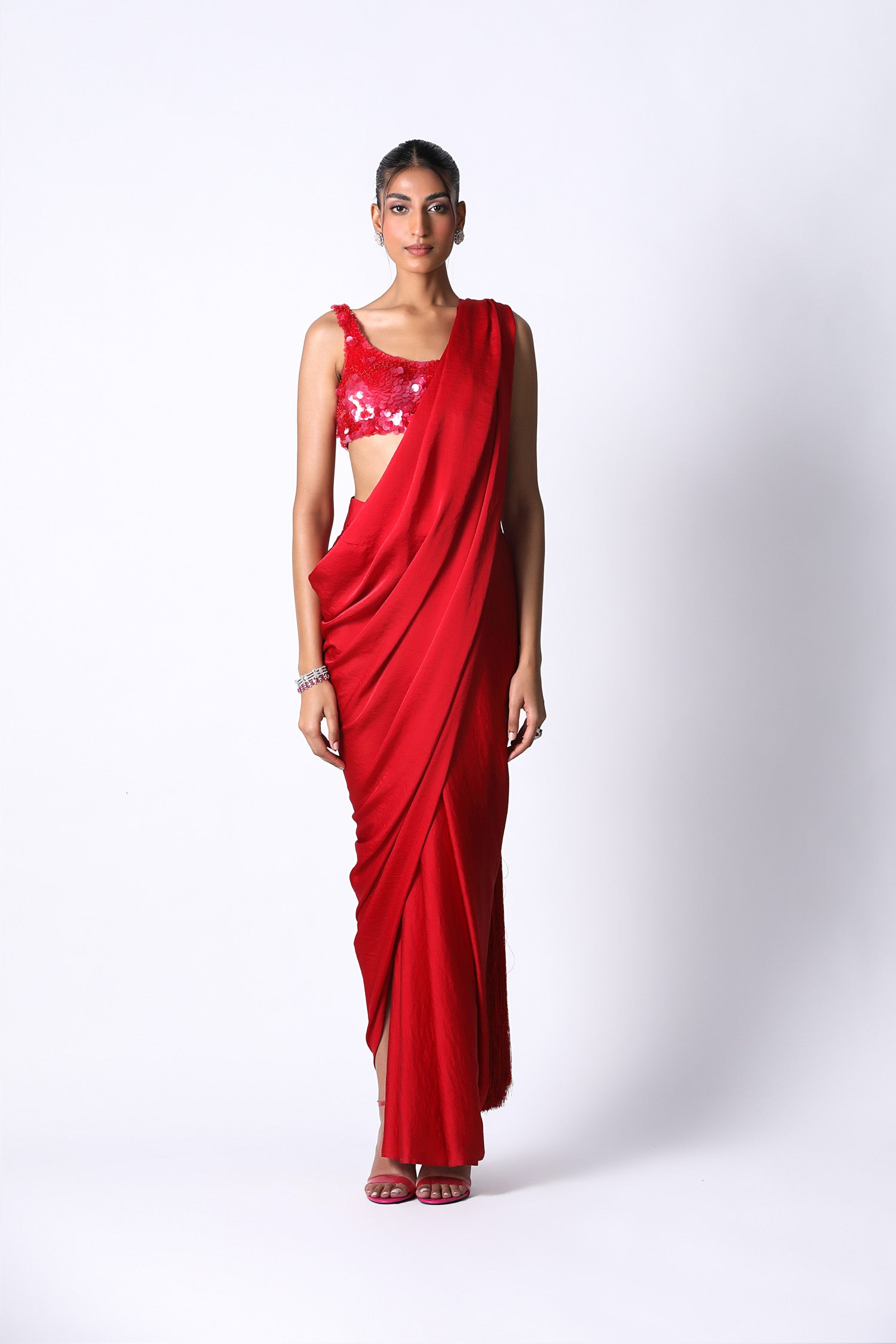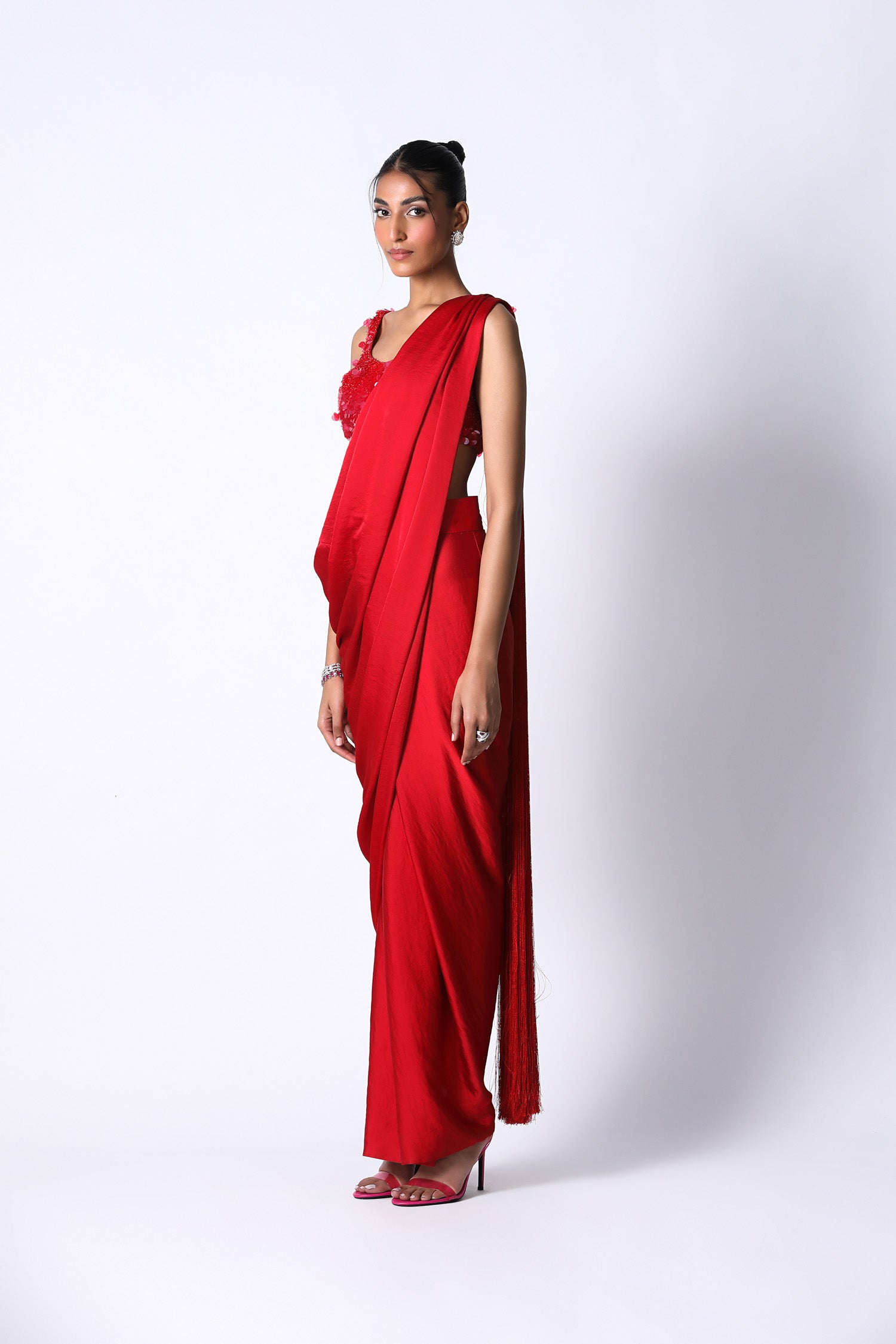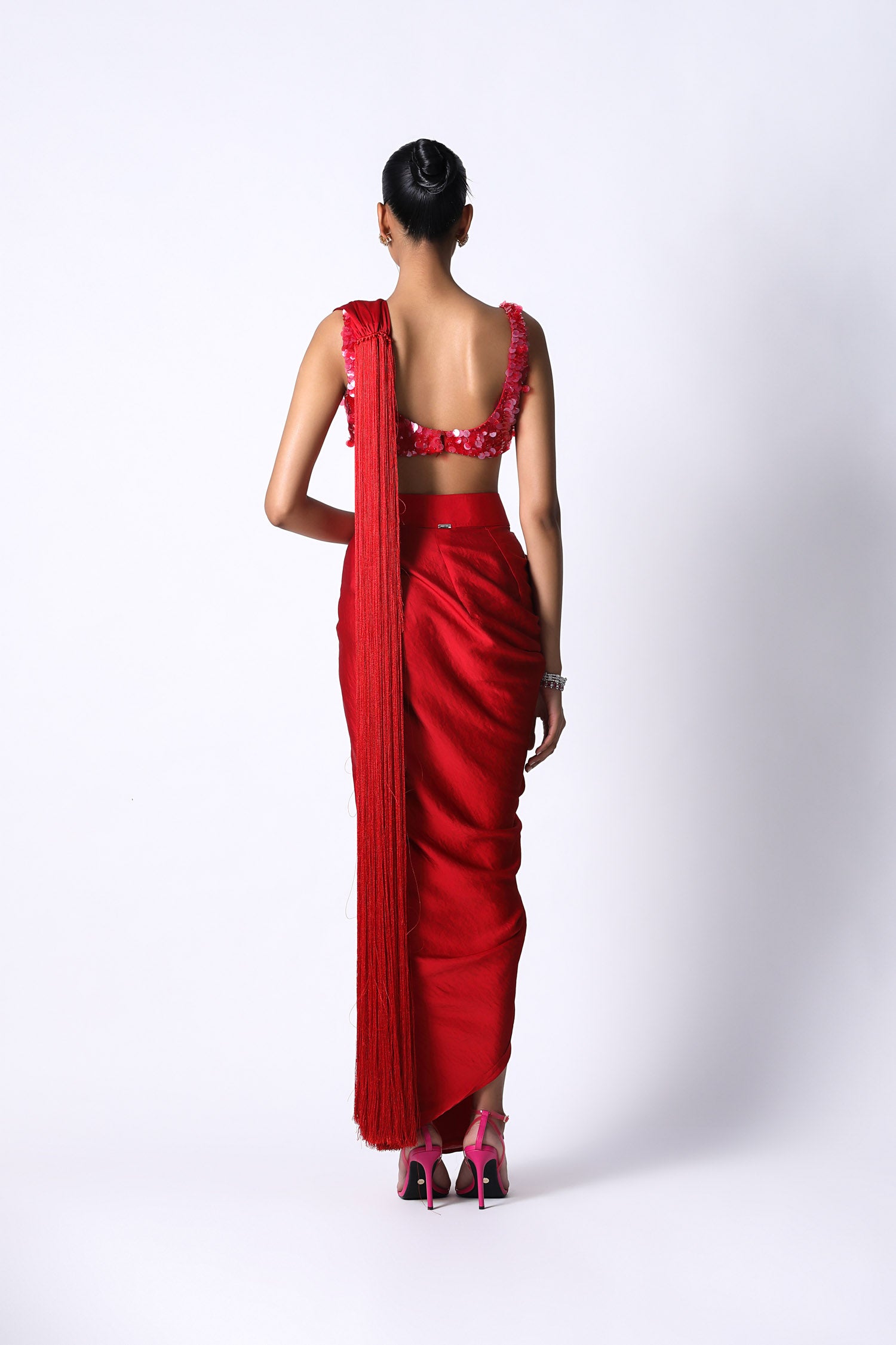 Our contemporary draped sari with a new twist, with a long fringe that acts as a pallu. The Sari X is made in textured satin and feels comfortable on your skin. The fringe pallu adds drama to the look also making it fun and playful. Pair it with the RiRi blouse that is hand embroidered with transparent sequins. It has a square neckline and closes on the side with a zipper. The perfect outfit for those fun day weddings.