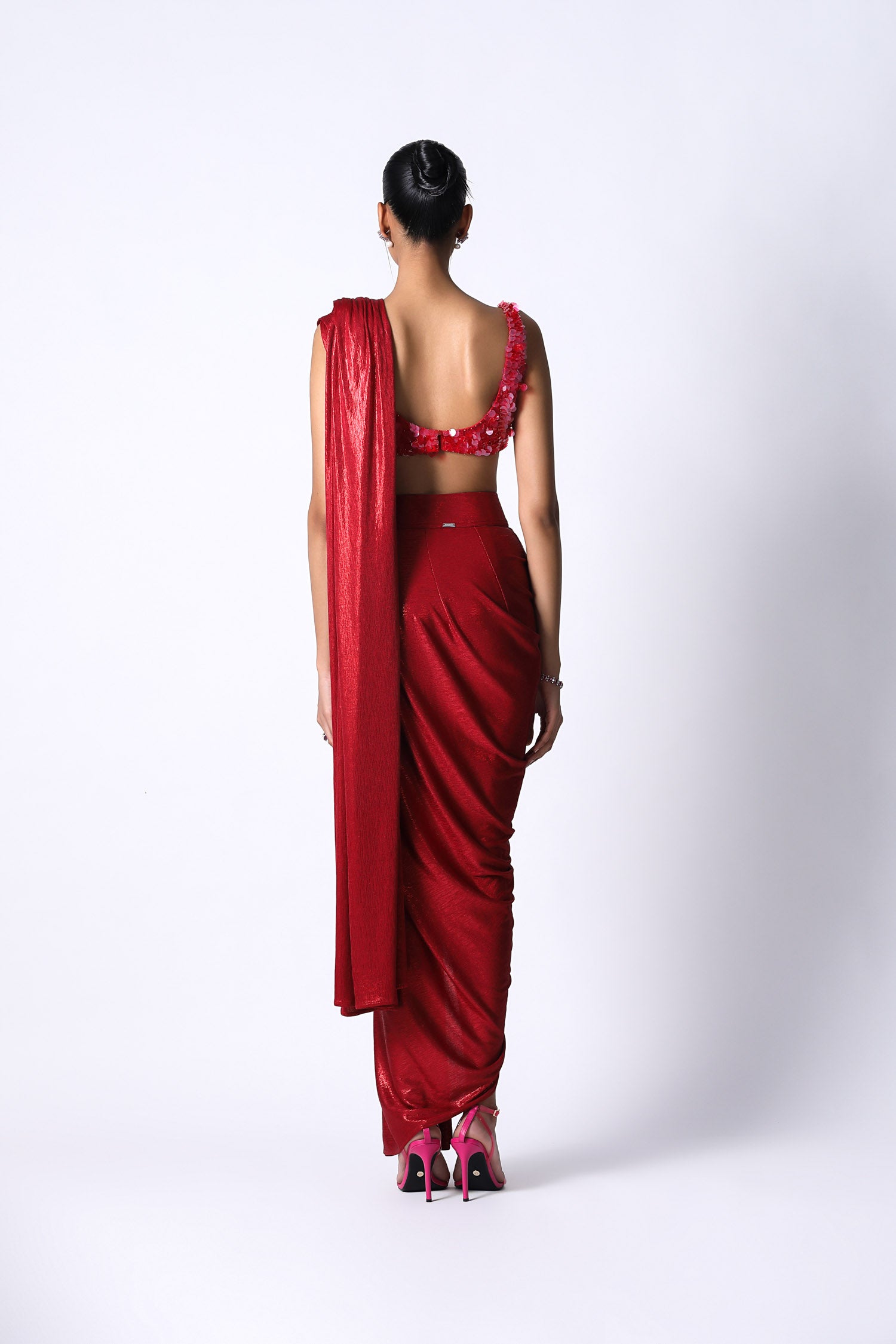 Our new Ocea Sari is made in our slinky knit jersey that feels like liquid. The Ocea sari is lightweight, crush-free, and easy to wear. All you need to do is button up the waist, throw the pallu over your shoulder and you are good to go. Pair it with the RiRi blouse that is hand embroidered with transparent sequins. It has a square neckline and closes on the side with a zipper. The perfect outfit for those fun day weddings.