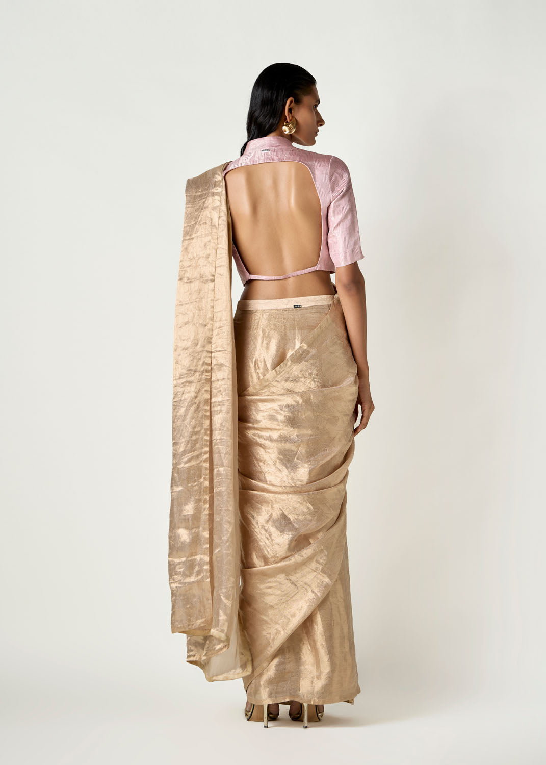 The Nivi Sari is a customary sari that is pre-draped to resemble a standard sari. Crafted from exquisite silk fabric woven through zari in a foliage design.