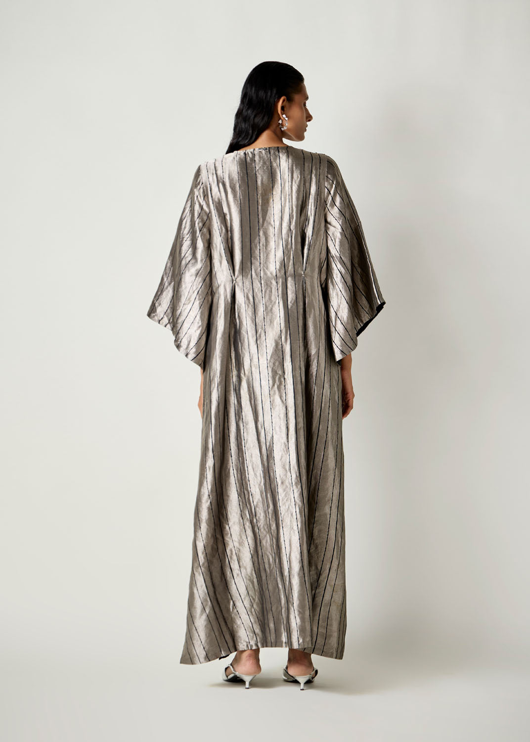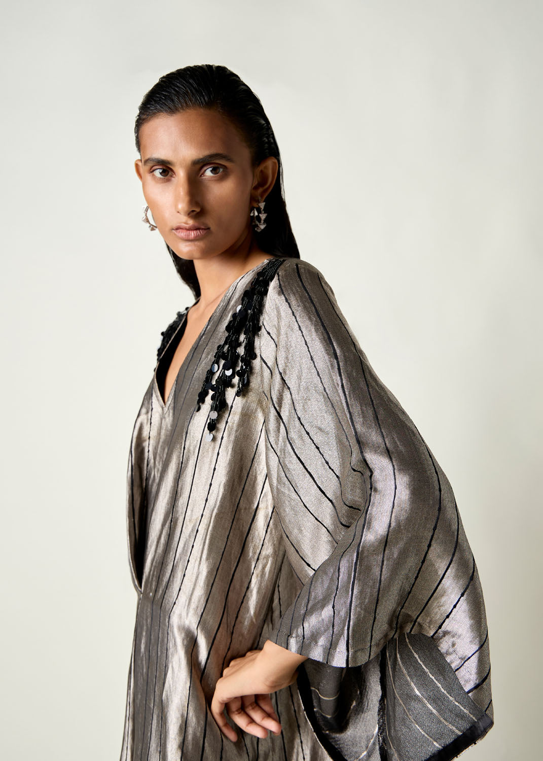 The Riva Dress is a relaxed-fit kaftan with a pleated detail on the front waist that shapes the body slightly. The flowy sleeves and tassel embroidered on the shoulder add some drama to an otherwise simple garment. It has knee-high slits on both sides.