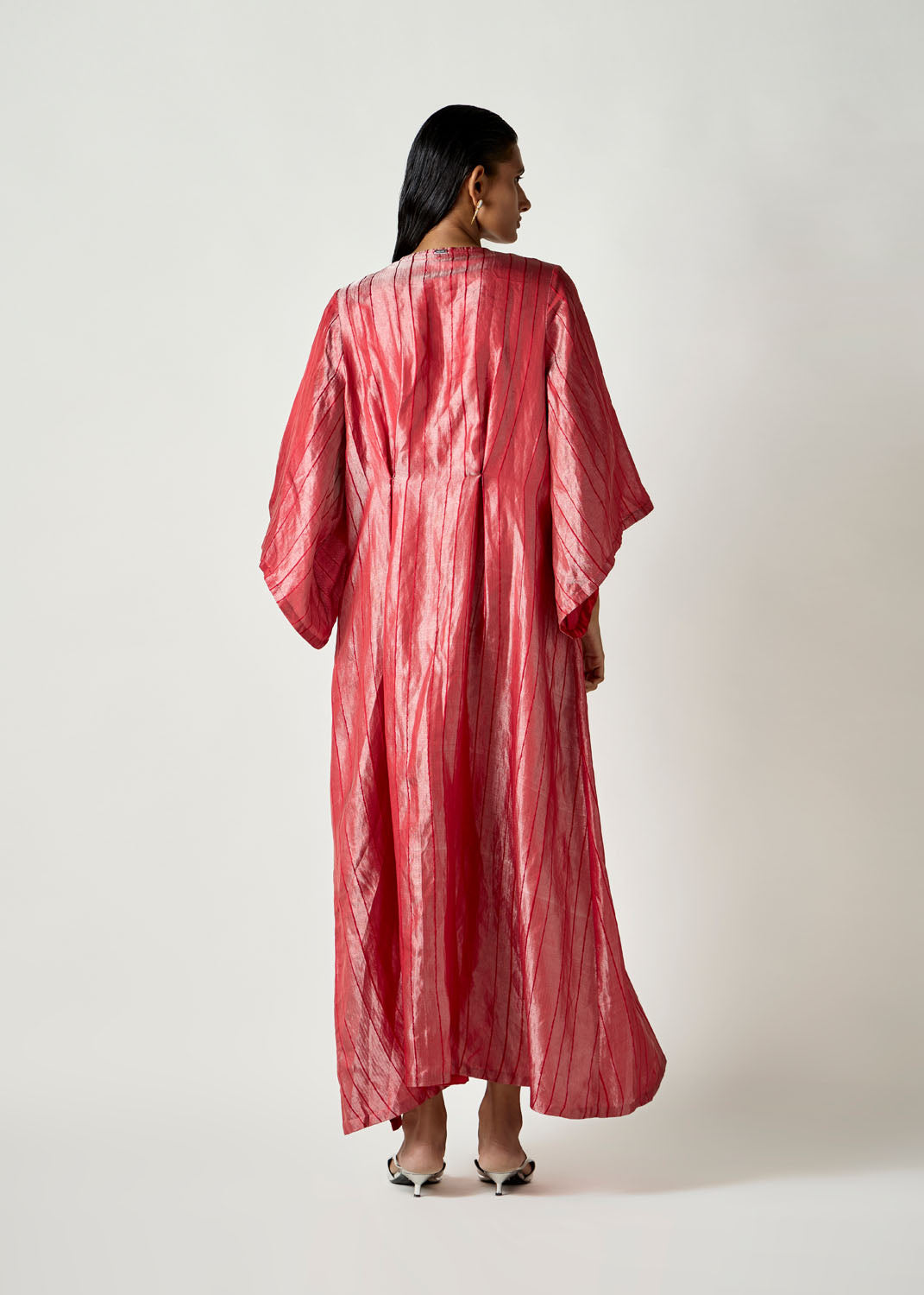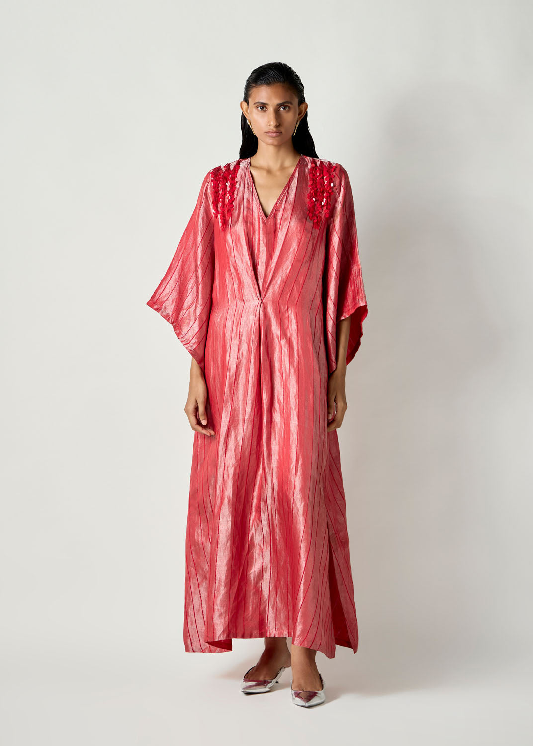 The Riva Dress is relaxed fit kaftan with a pleated detail on the front waist that shapes the body slightly. The flowy sleeves and tassel embroidered on the shoulder add some drama to an otherwise simple garment. It has knee high slits on both sides.