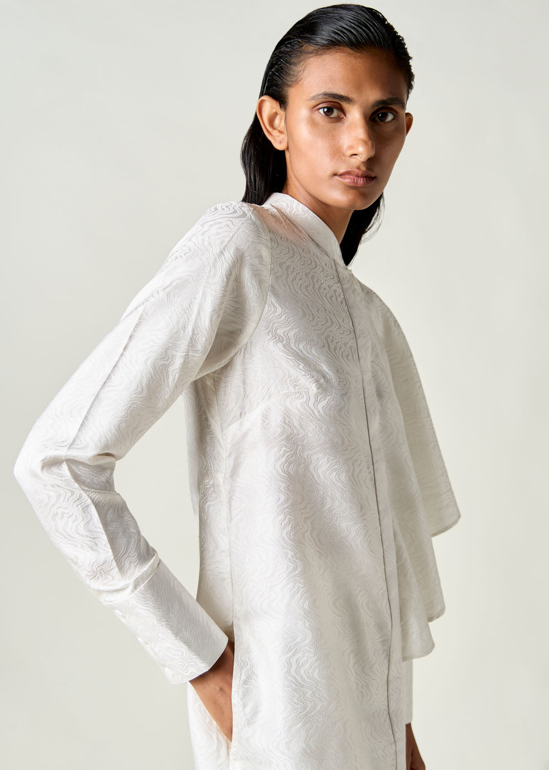 This staple silhouette has a draped scarf, comes with a front panel extending into a scarf that drapes around your neck. Vivian Kurta Set features a relaxed fit scarf kurta with wide trousers. Made in a lightweight silk fabric, it is comfortable yet elegant. The dress is made in a mid-calf length and has full sleeves. Comes with matching trousers for a coordinated look.