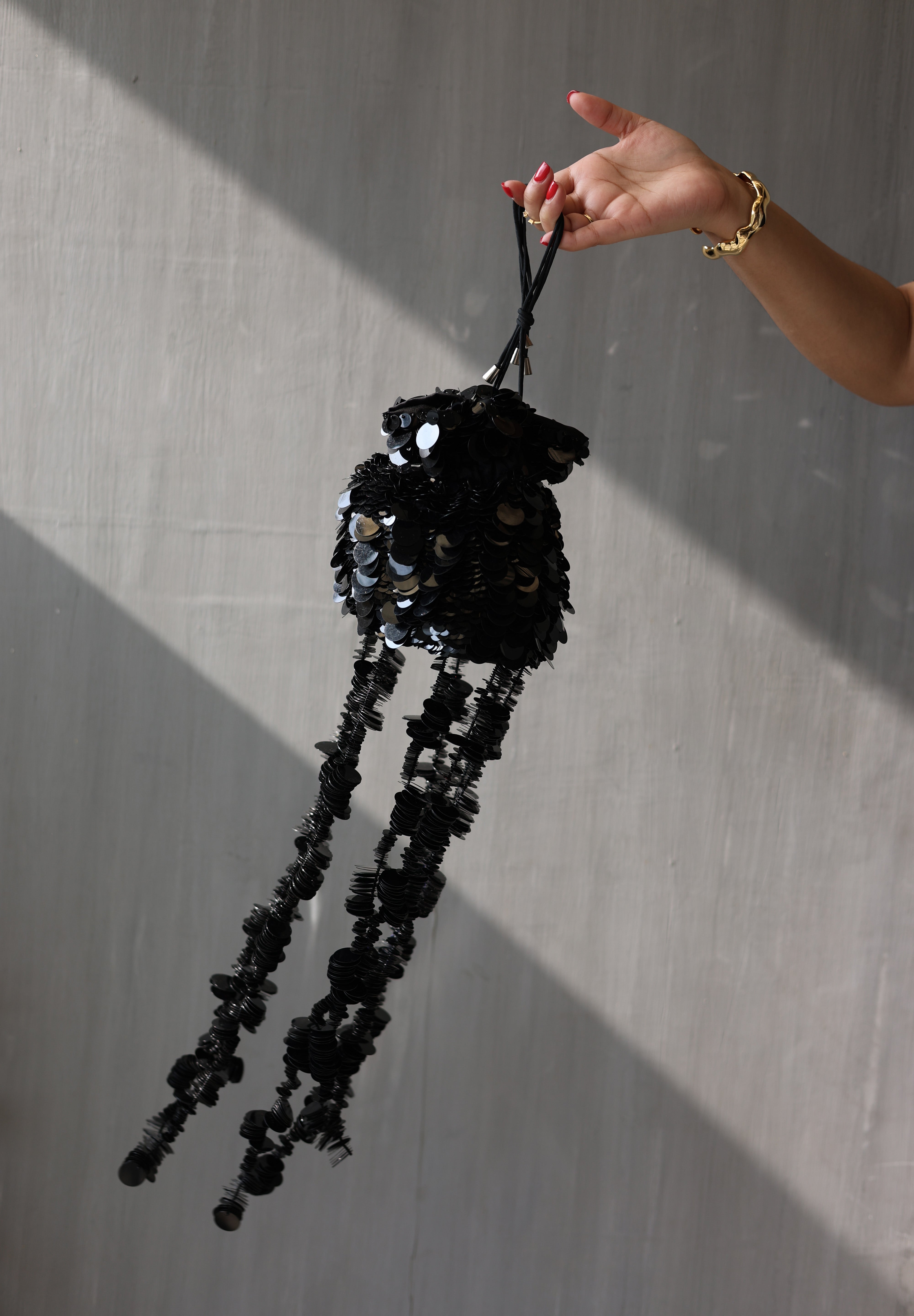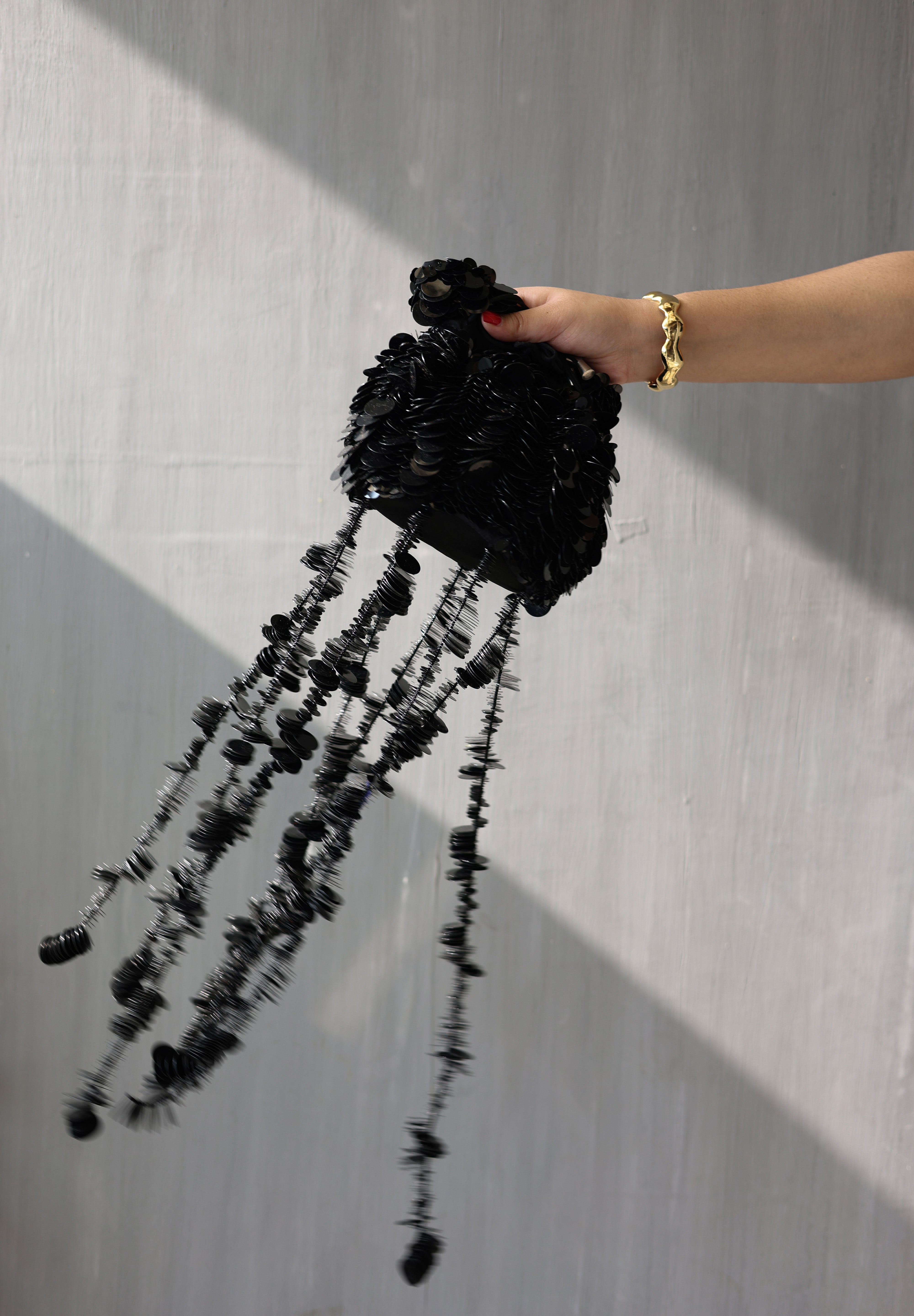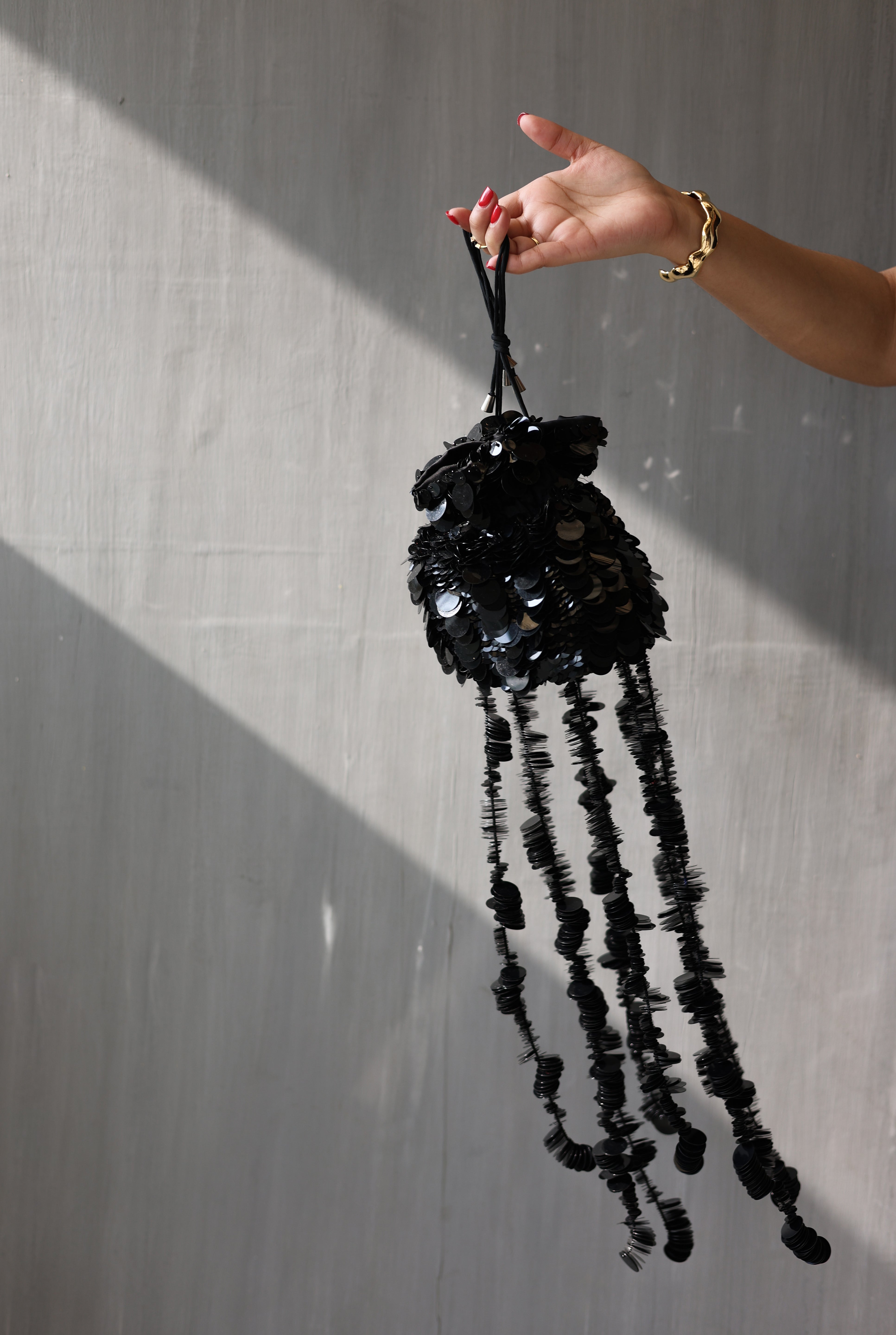 Our X Polti bag is a perfect go to for this festive season . Hand embroidered with our red sequin of two different sizes . With a beautiful tassel detail which will get all eyes on you .