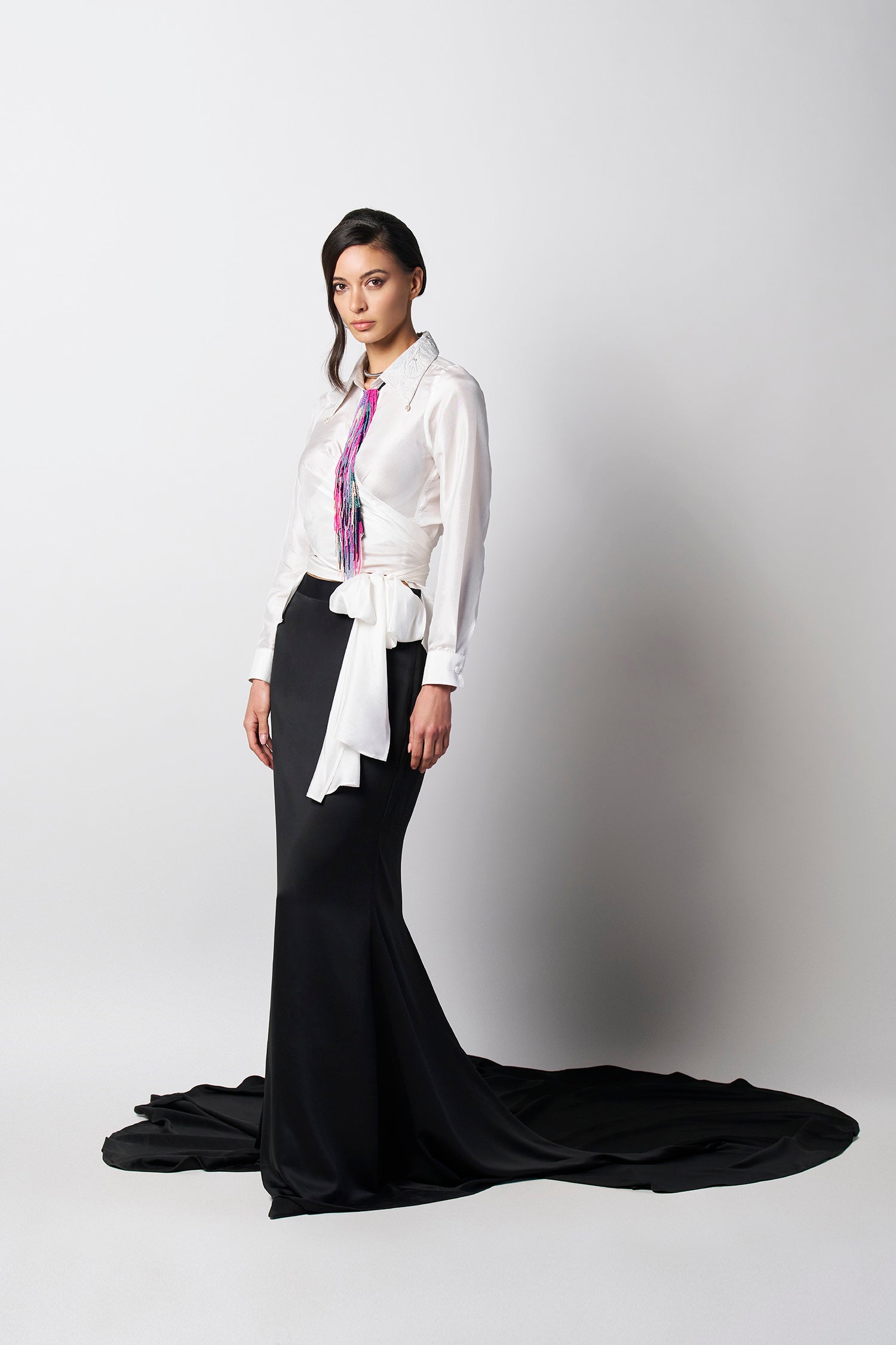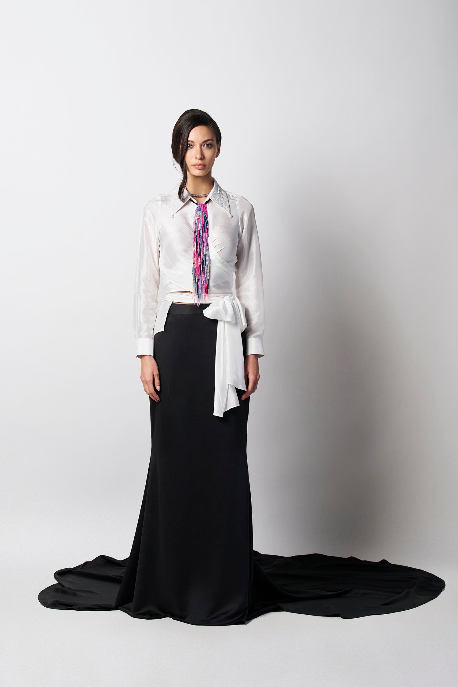 A vibrant pop tie crafted from colorful beads to create a striking fringe effect. It’s a playful, dynamic accessory that will add pop to your any look.