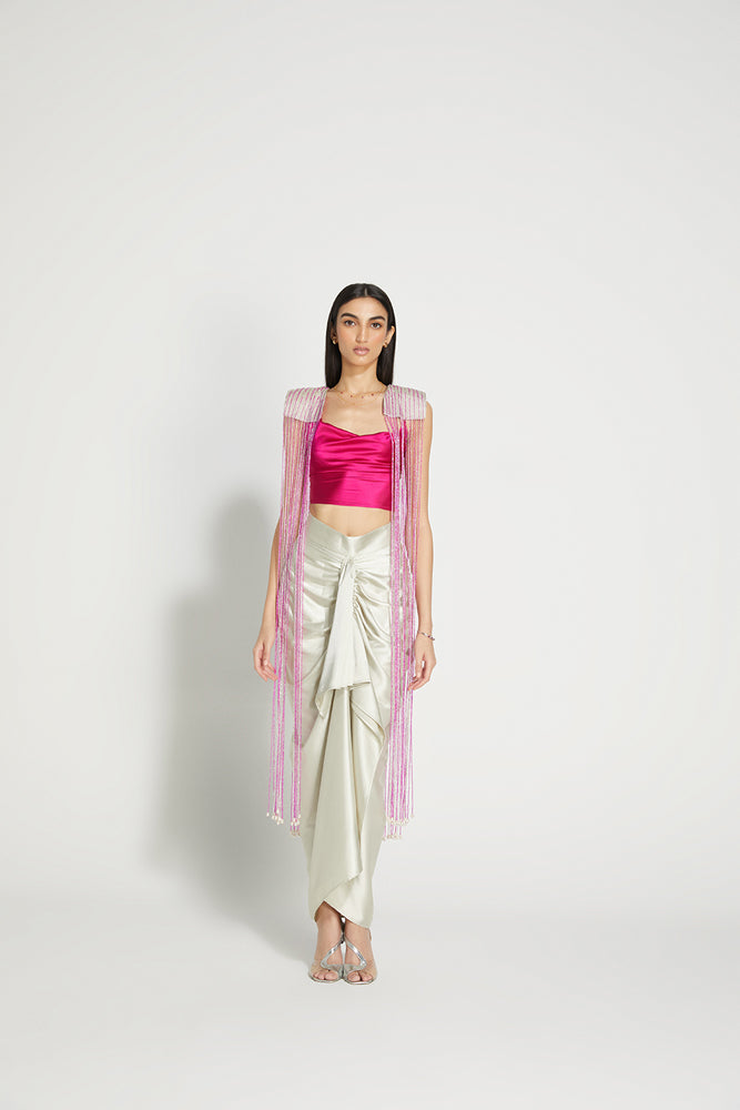 A handcrafted statement cape delicately embroidered with strings of beads from the shoulder to the floor. Structured with padded shoulders, it sits comfortably over your body. Wear it over your saris or your draped skirt for that extra bling and drama.