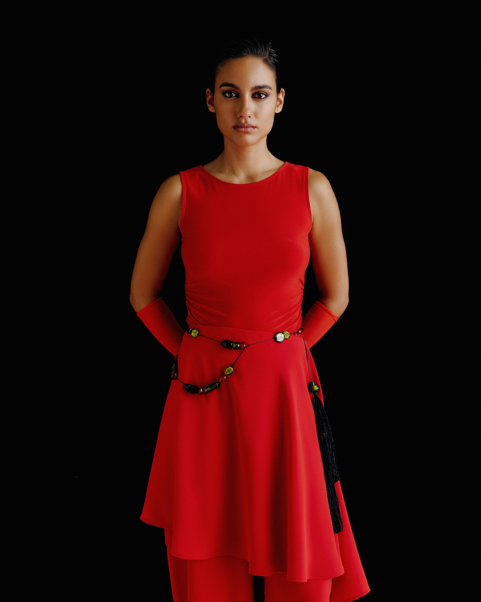 Distinctive and artful, the Dim Belt embodies modern craftsmanship with a bohemian edge. Hand-strung with glass and resin beads in warm amber, olive green, and violet hues, it features dual black silk tassels that drape gracefully to frame the neckline. Lightweight yet statement-making, this piece elevates any ensemble with its sculptural balance and effortless versatility.