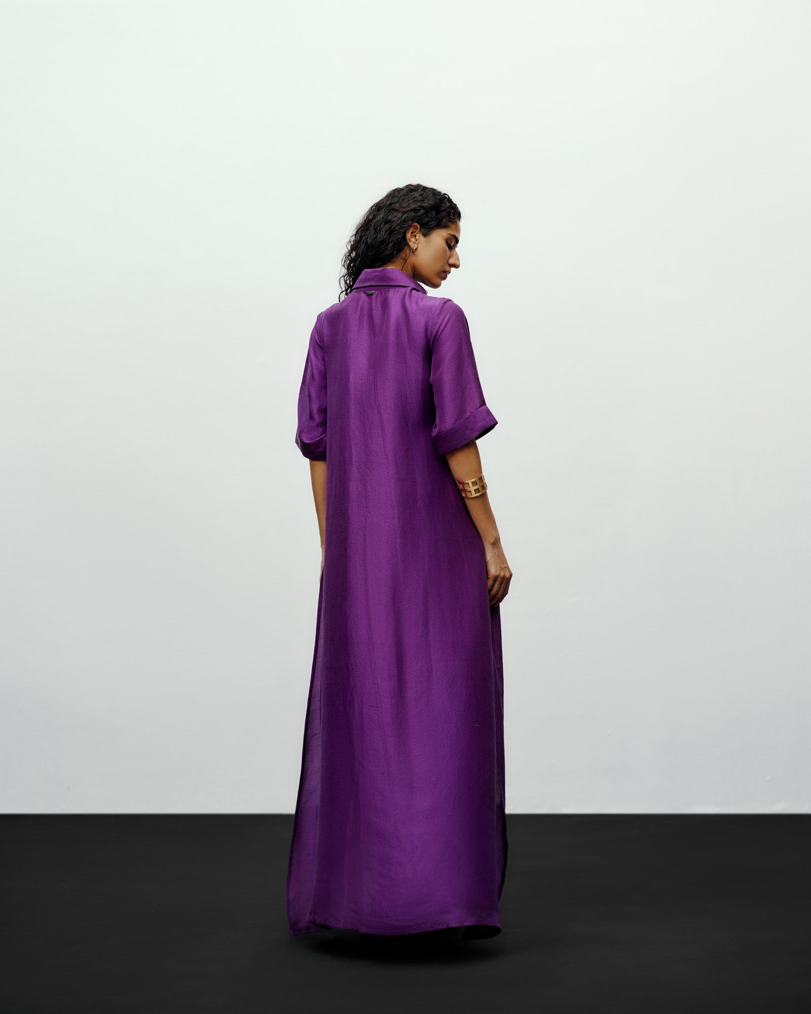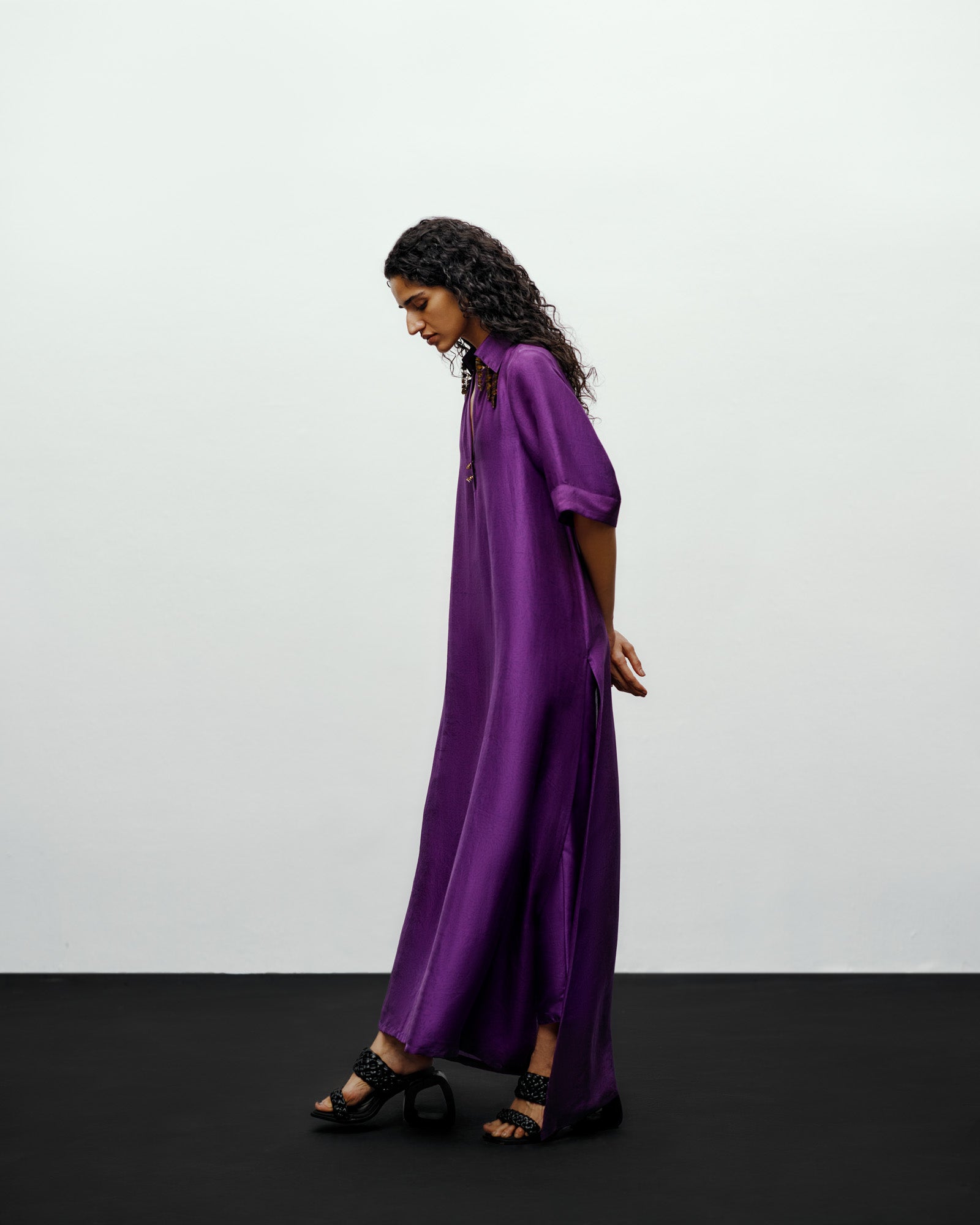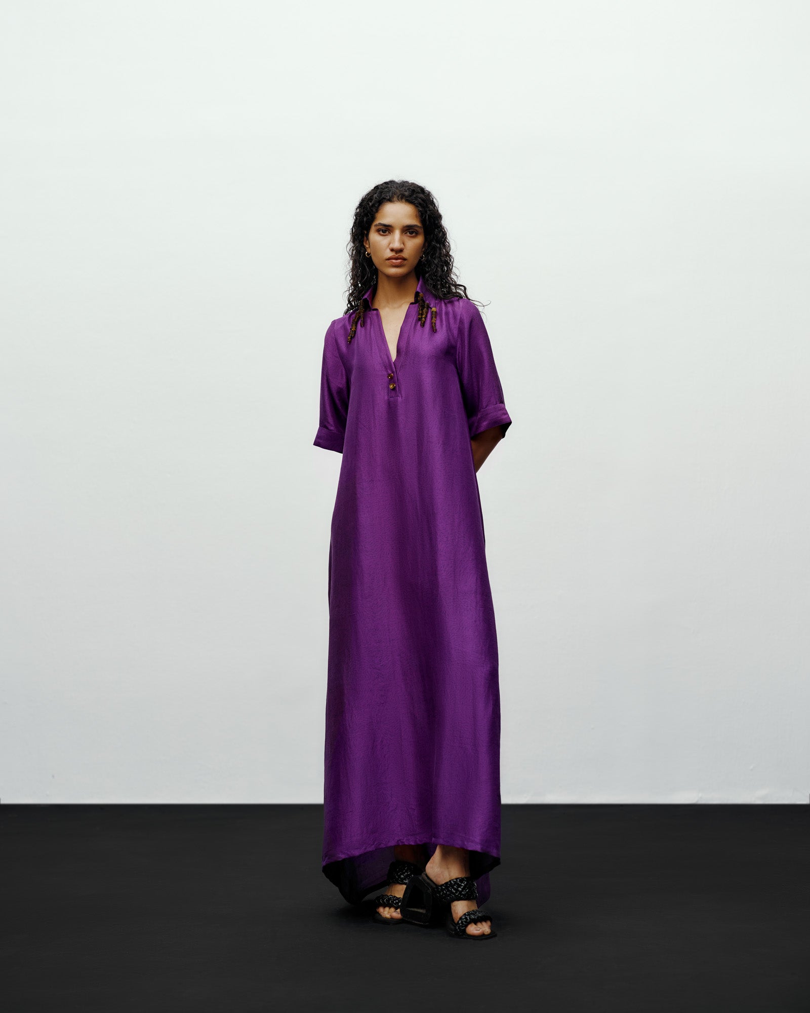 The Fern Kurta Set in purple channels understated sophistication with fluid tailoring and luminous texture. Cut from lightweight silk, this silhouette features a relaxed drape with a collared neckline and soft front pleats that create subtle volume and movement paired with comfortable pants . Designed for ease and elegance, the kurta falls gracefully to an asymmetric hemline, offering both comfort and effortless poise. A deep purple hue enhances its timeless appeal, making it ideal for both intimate gatherings and elevated daywear.