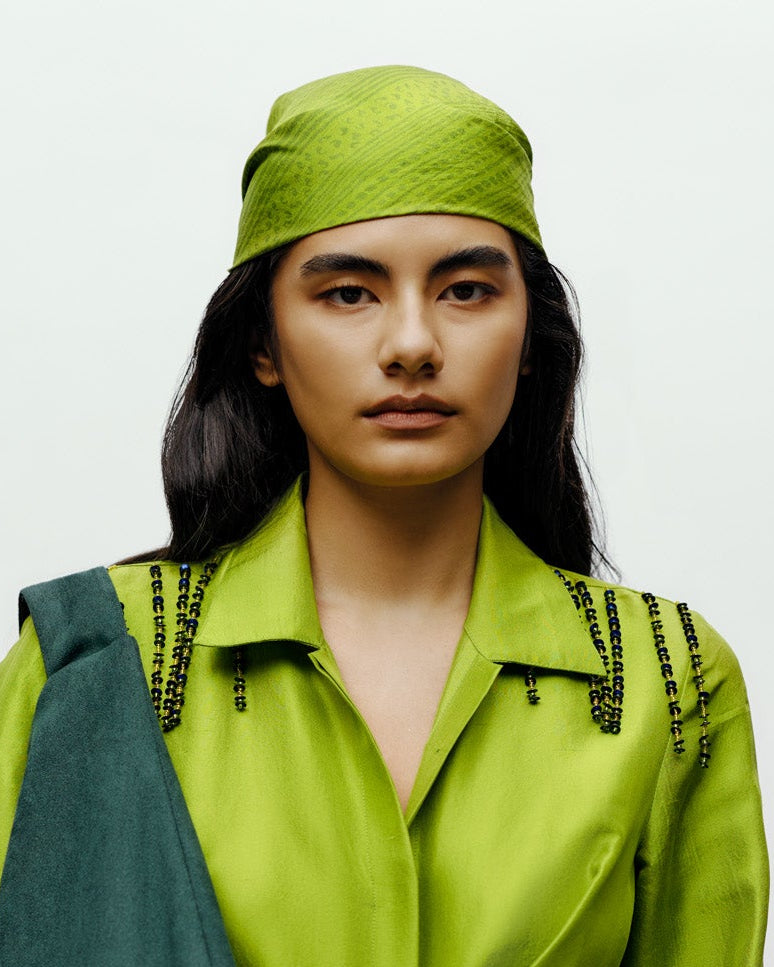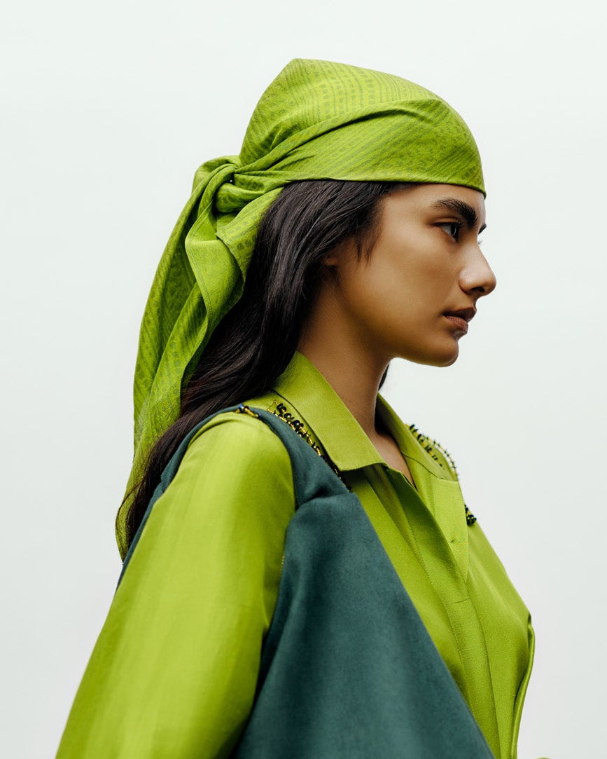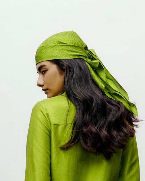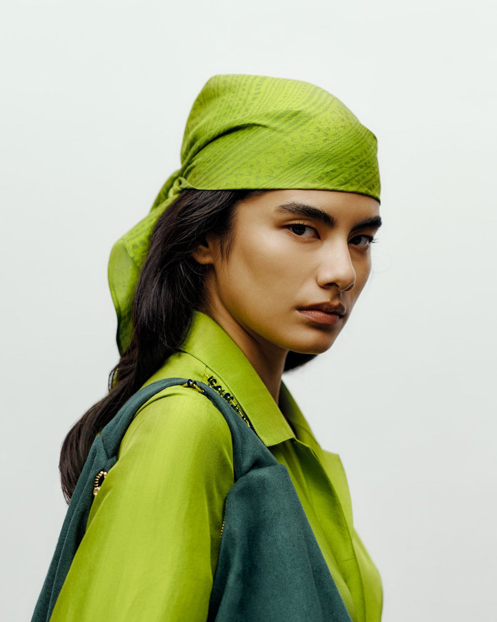 The Heather Bandana is a head scarf that embodies the brand's philosophy of blending luxurious femininity with modern, versatile styling. Crafted from exquisitely soft, fluid silk in heather print, this piece adds a touch of effortless glamour and color to any look.