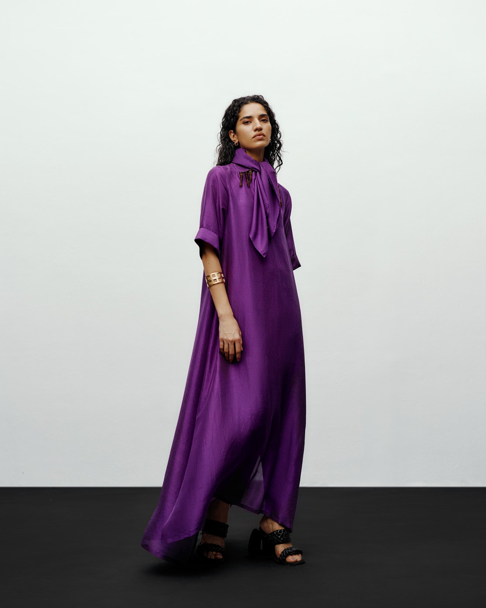 The Iris Bandana is a head scarf that embodies the brand's philosophy of blending luxurious femininity with modern, versatile styling. Crafted from exquisitely soft, fluid silk in Iris print, this piece adds a touch of effortless glamour and color to any look.