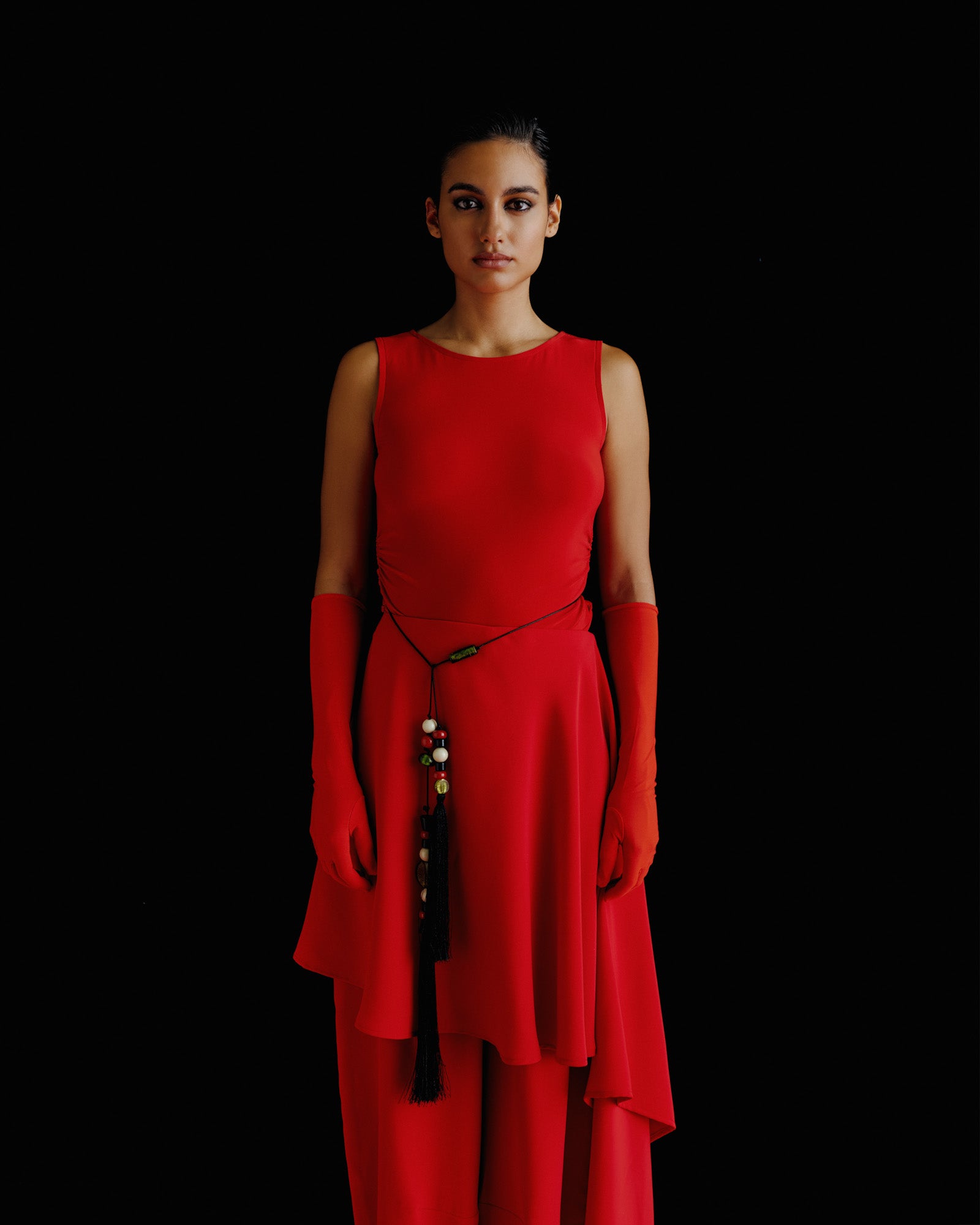 Artful, bold, and tactile, the Merly Belt redefines modern adornment with a handcrafted sensibility. Composed of vibrant beads in rich jewel tones, this piece features dual black tassels that drape fluidly across the neckline. The mix of color, texture, and geometry creates a statement that is both contemporary and timeless.