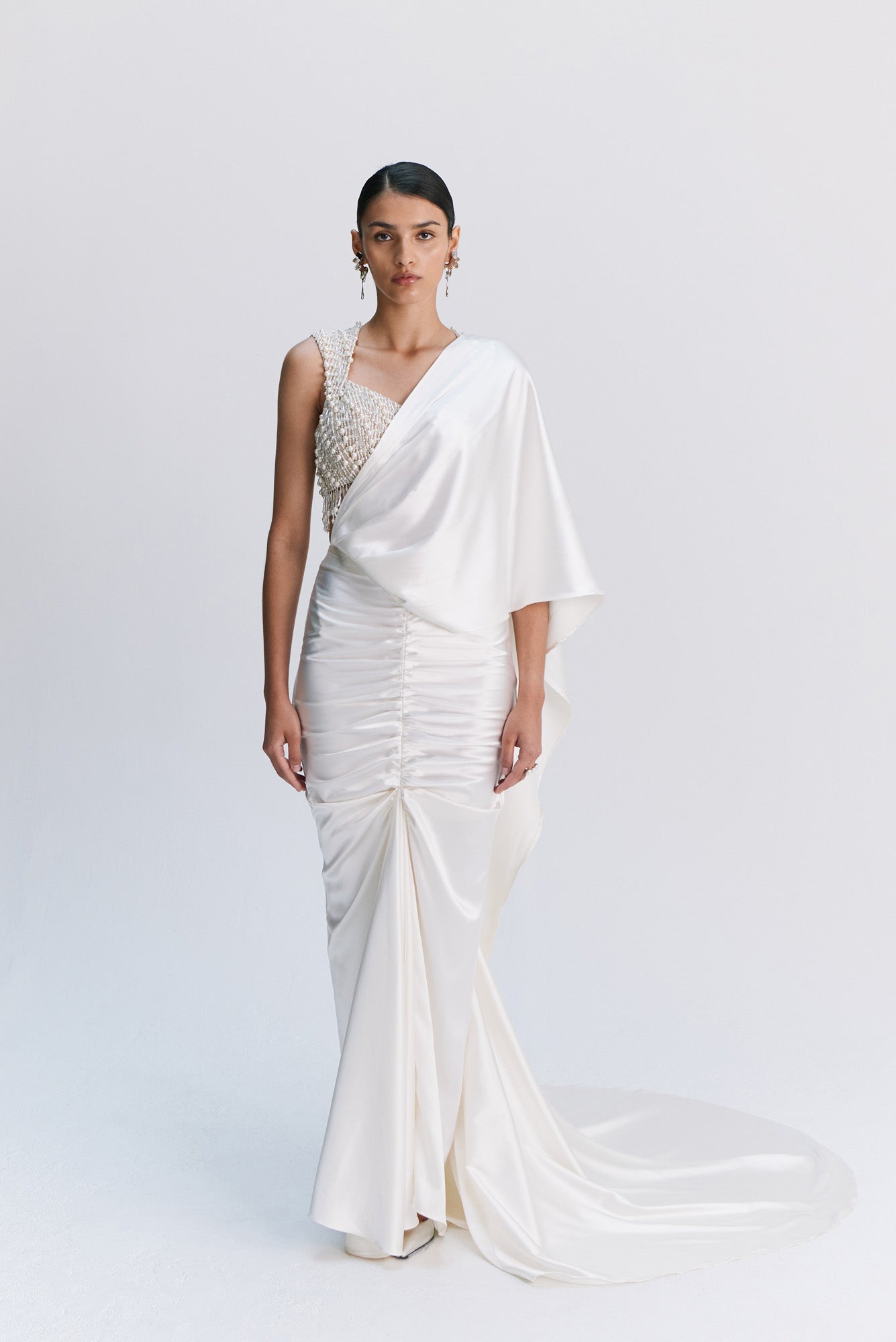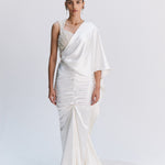 A draped ivory satin silhouette, stitched with a modern sense of tradition, features a ruched front that elongates the body and a pre-draped pallu that floats from the shoulder like a second skin.