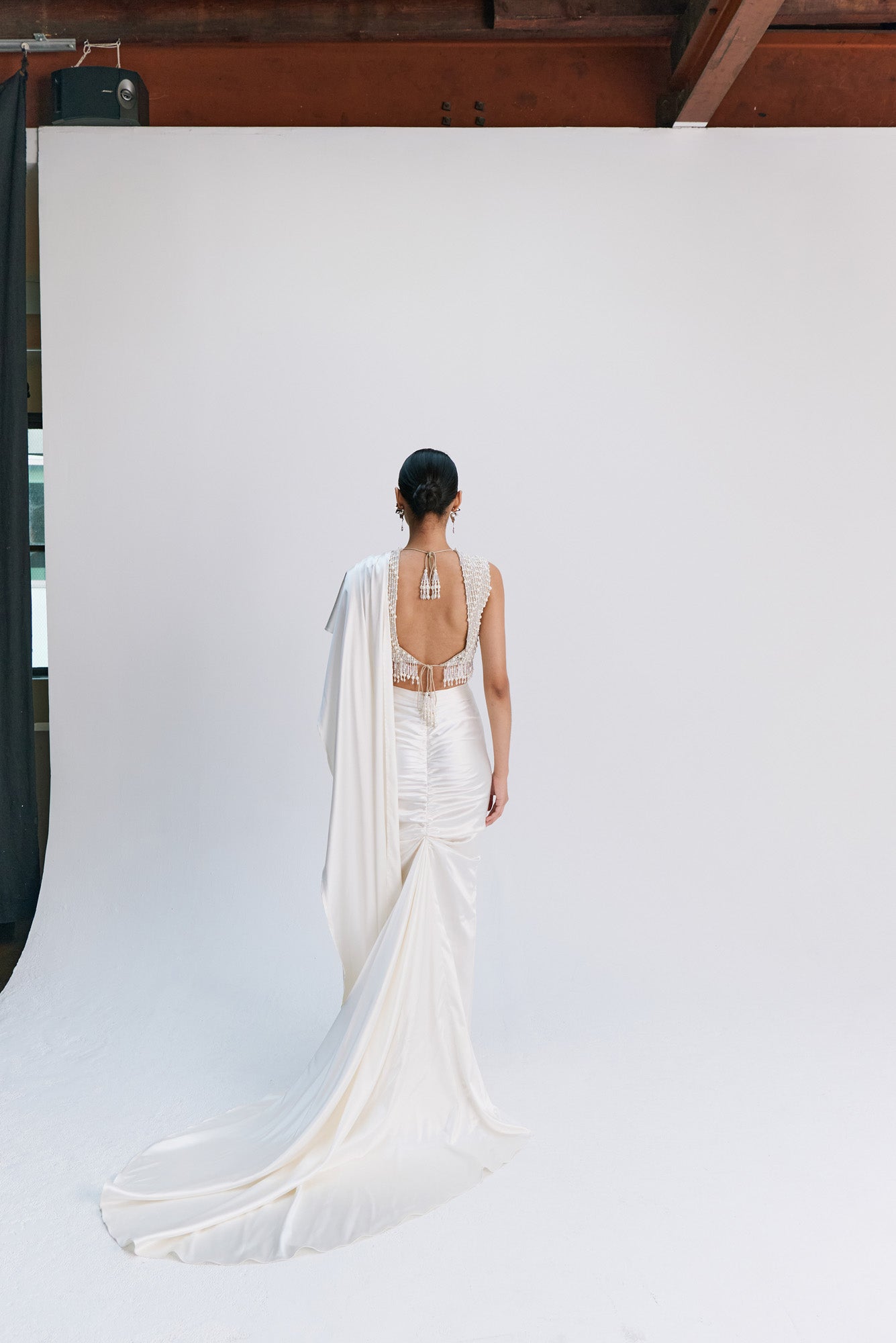 The Issa Set reinterprets bridal drapery through the lens of sculpture—fluid yet precise, ethereal yet grounded.
