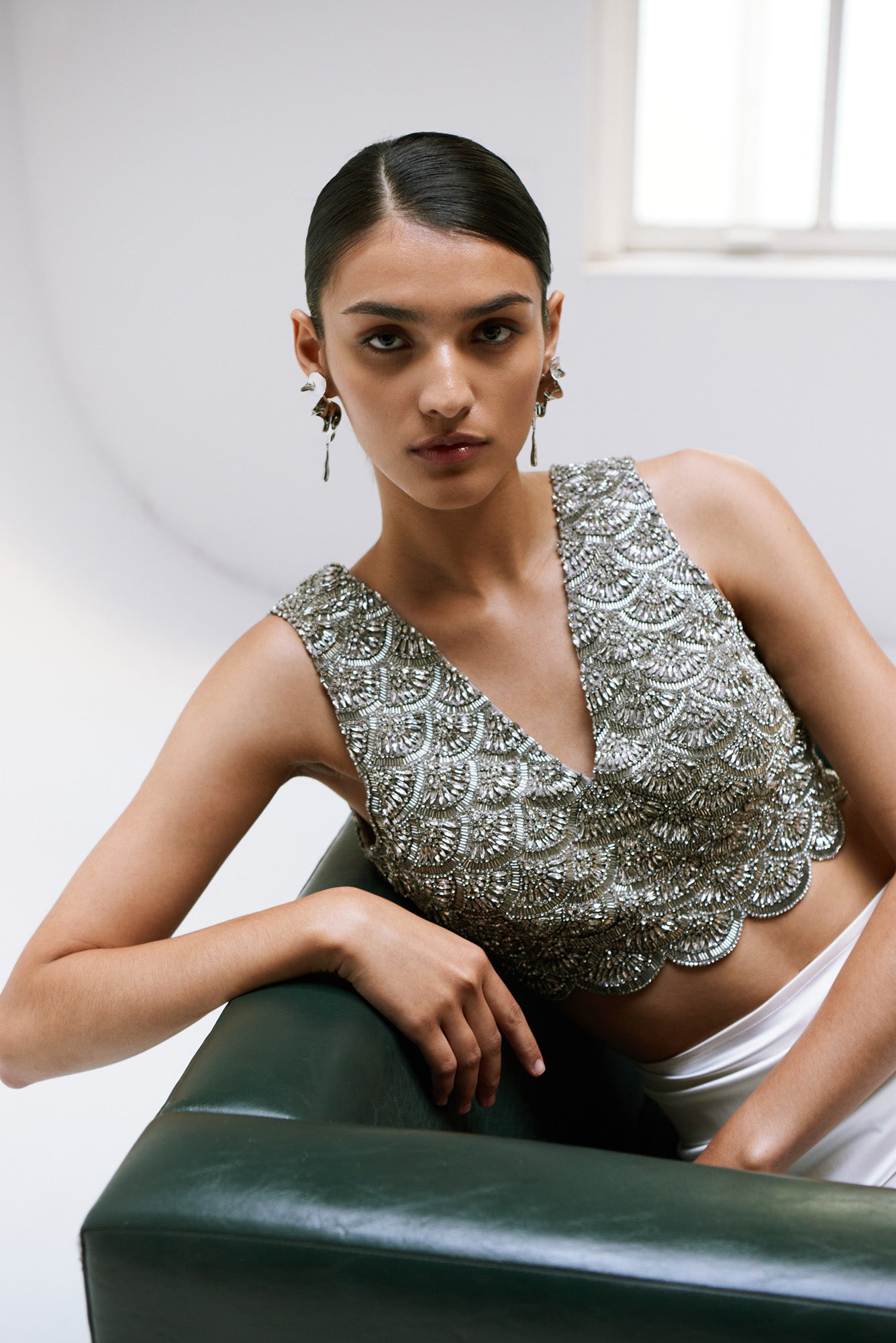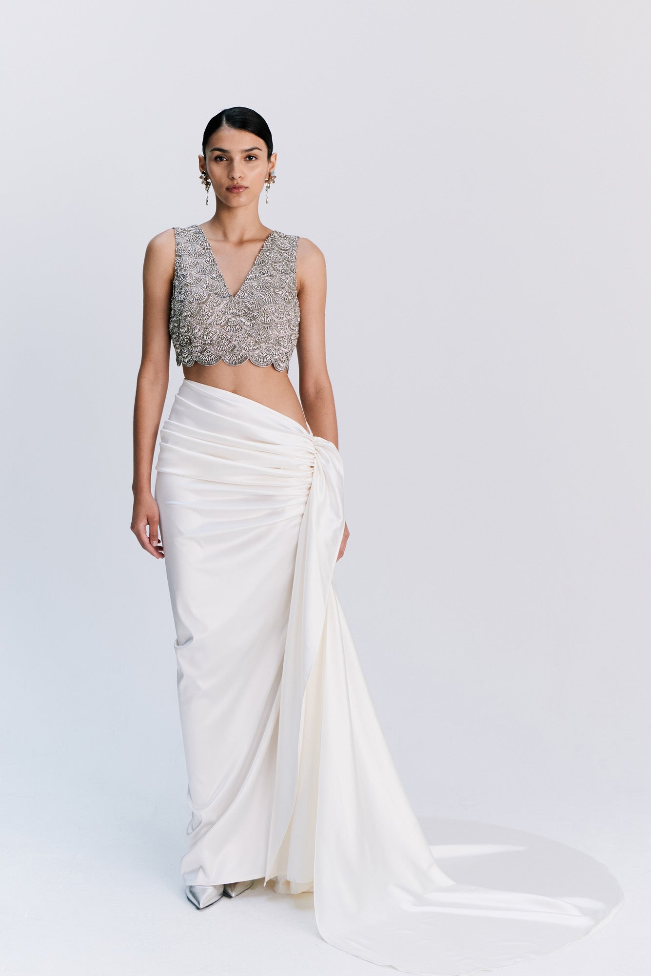The Kate Set is the embodiment of modern bridal minimalism — soft draping balanced with architectural lines.