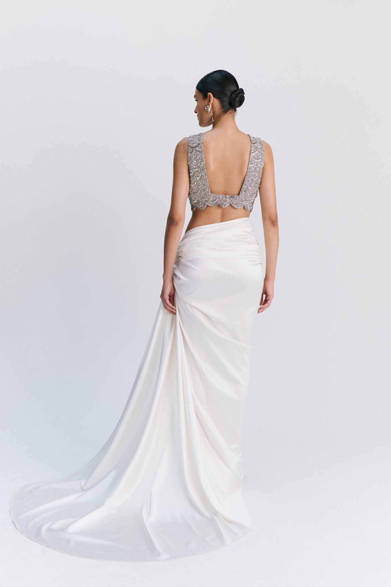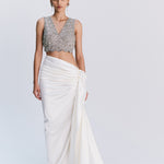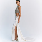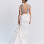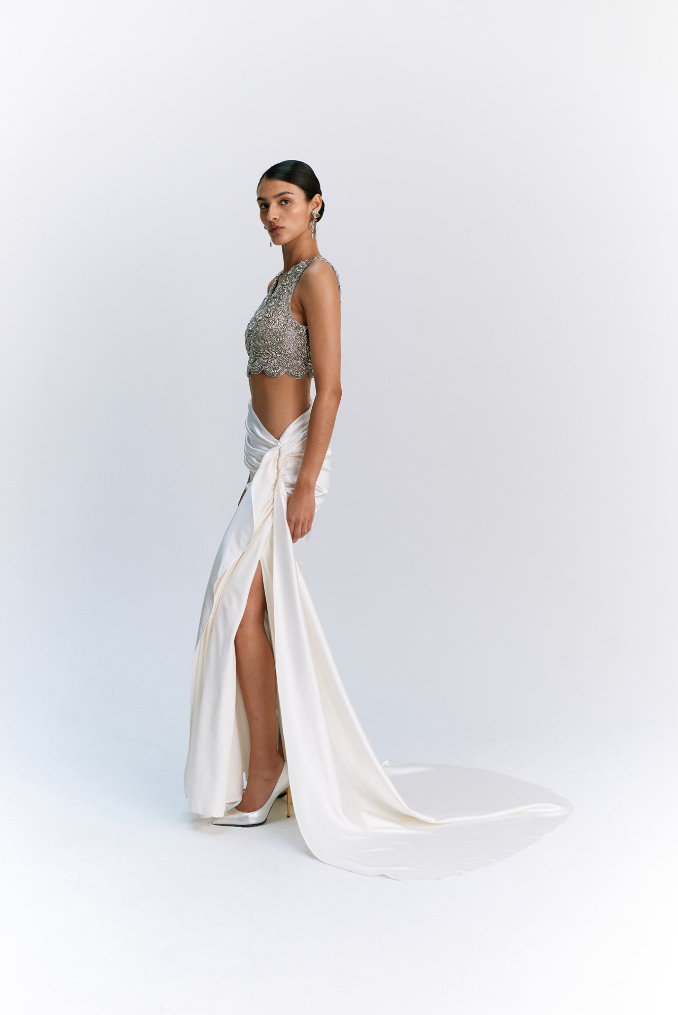 - Pre-draped ivory satin skirt with soft side gathers