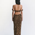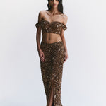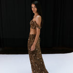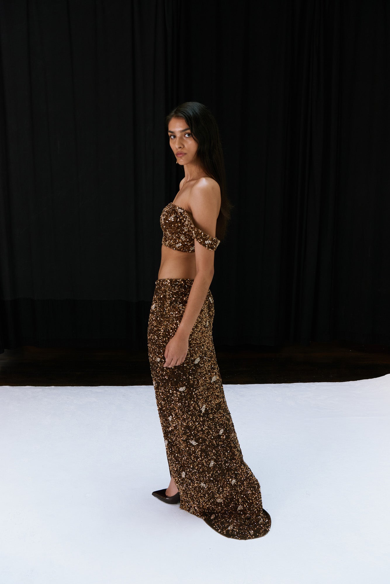 Hand-embroidered in bronze sequins, the off-shoulder blouse dips into a sculpted sweetheart neckline, paired with a straight-cut skirt that opens into a front slit.