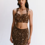 - Hand-embroidered bronze sequin blouse with sweetheart neckline