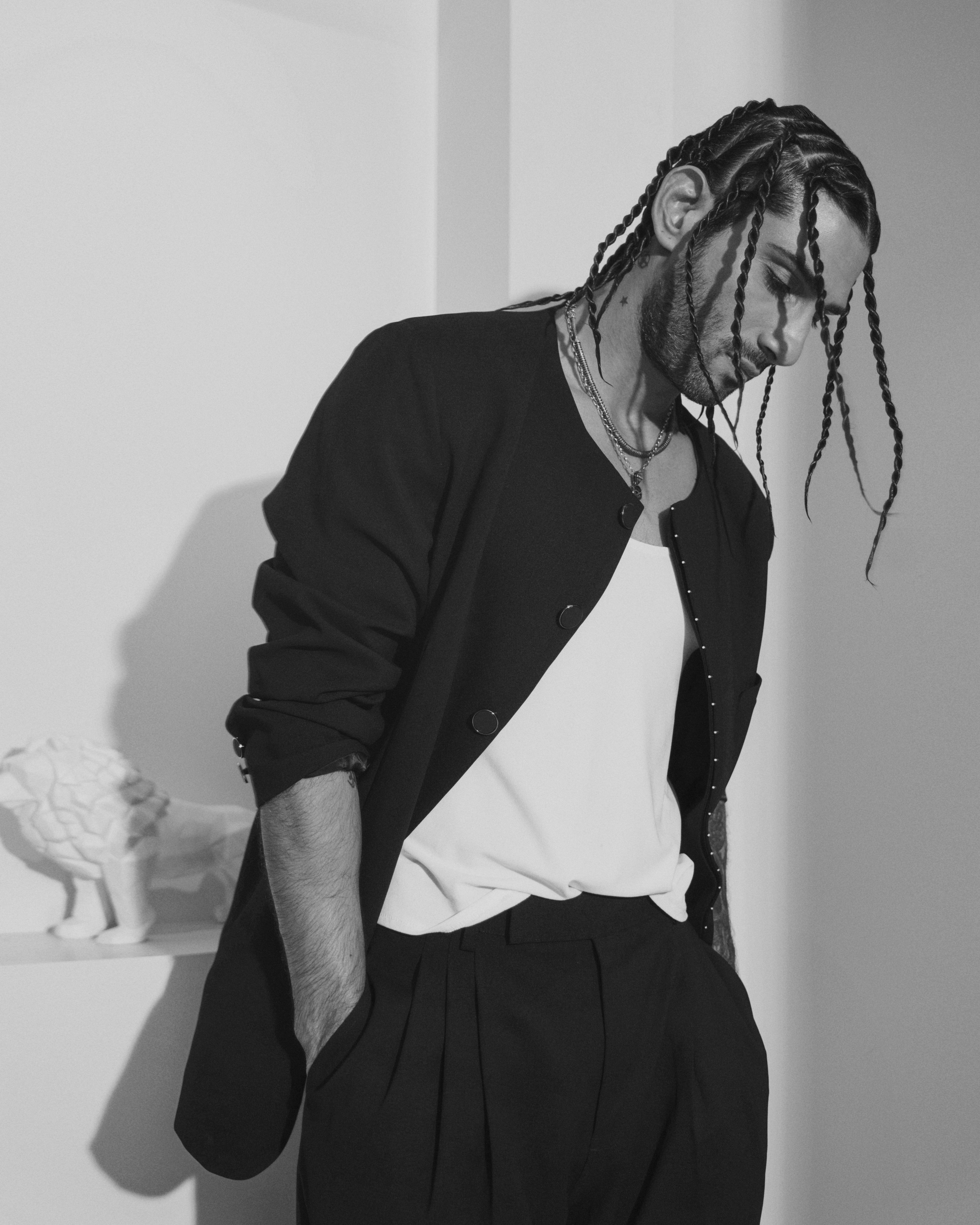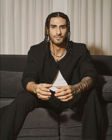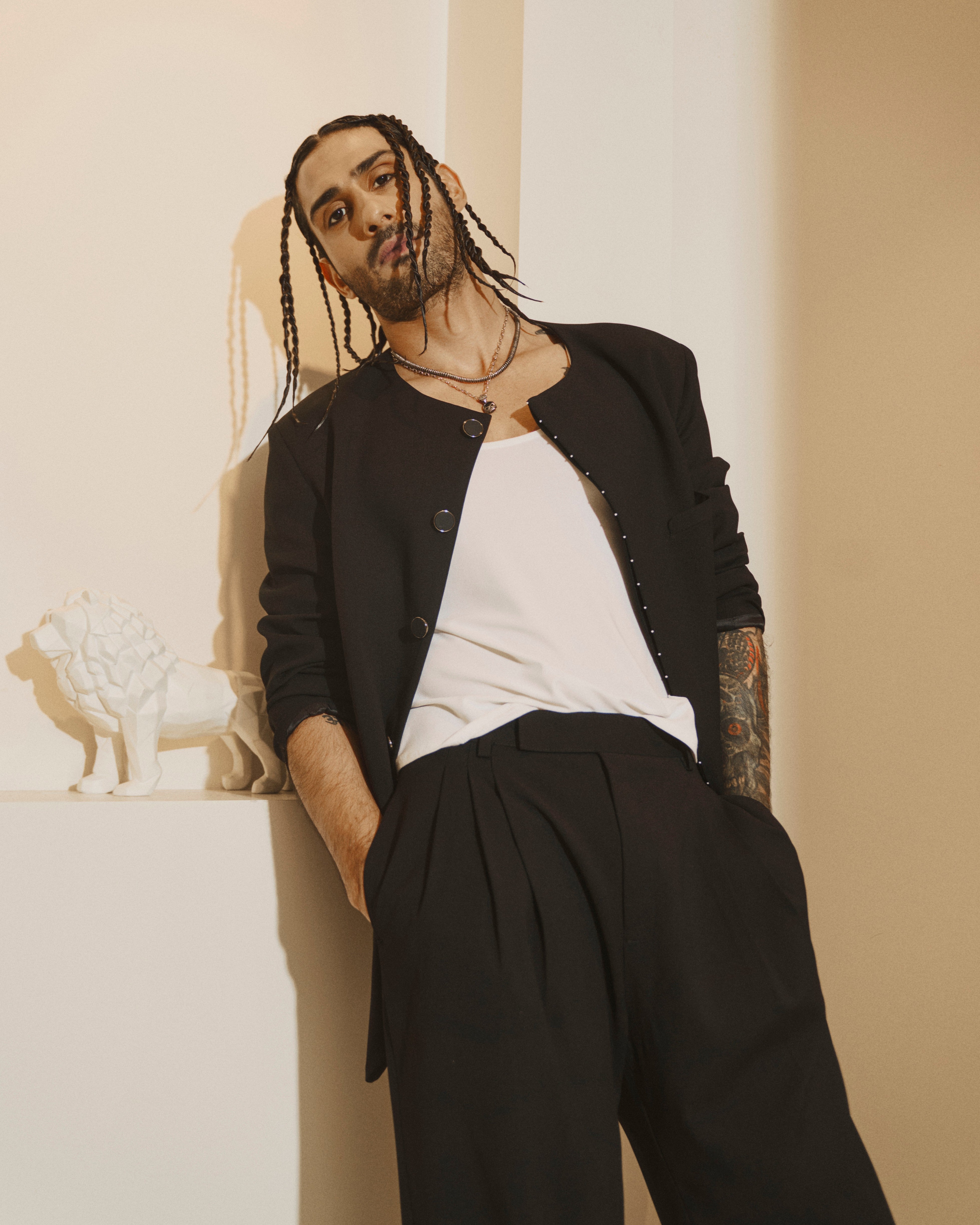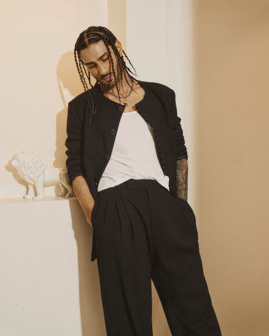 88 Men's Bandhgala is a front open bandhgala with a curved hidden placket and a minimal bead embroidery on the edge paired with our HS Pants. These trousers combine a relaxed, workwear-inspired silhouette with a lightweight crepe fabric. Pleats on the waistline allow comfort and easy movement and our sleeveless tank style ganjee with a deep round neck, crafted in lycra.