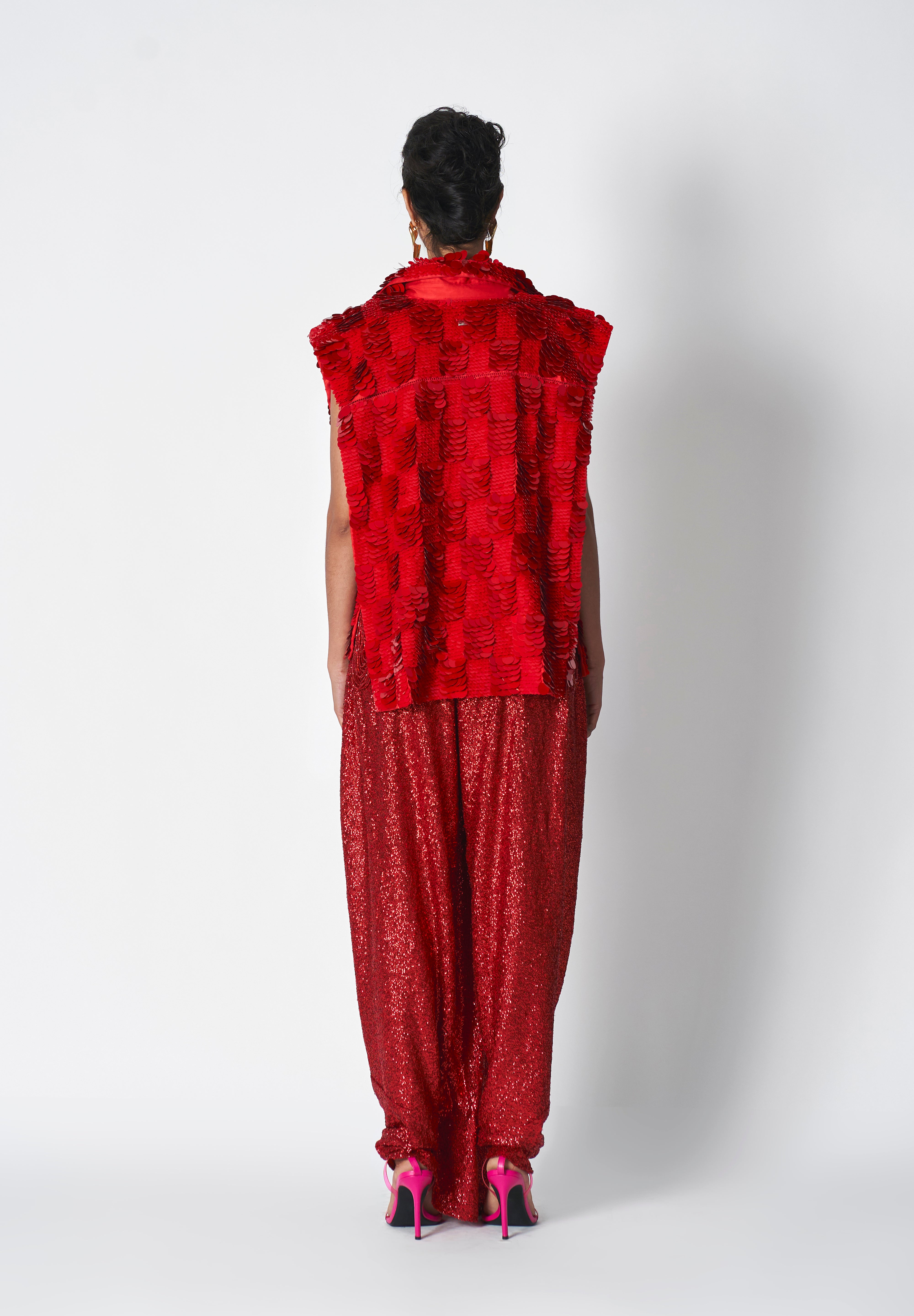 The Jacket Y is a celebration of our 10 years. Unapologetically blinged, this open jacket is fully hand embroidered with intricate beaded strings elegantly holding it together from the side. It is the perfect amount of fun and sexy and works as a great statement layer to wear over your dresses or trousers.