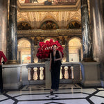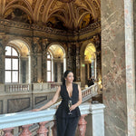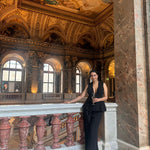 The perfect pant suit for the day. The Tan Blazer is a tailored sleeveless blazer with a flared peplum bottom. It has a thin round collar and a deep neckline and closes in the front with loops and maxi crystal buttons. Can be worn over your shirts as well. The Tan Trousers are the perfect high waisted flared trousers. It is tailored with front darts and pleats to give it that perfect fit and has side pockets. Closes in the front with a zipper and hooks.