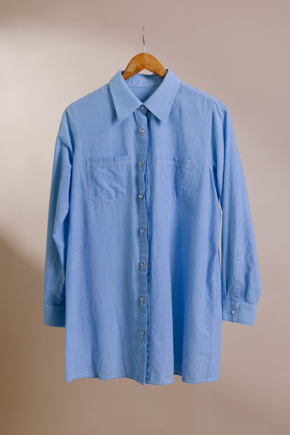 The Ivy Denim Shirt is a relaxed straight fit style featuring patch pockets on the front with long sleeves. Hand embroidered crystal buttons enhances the placket.