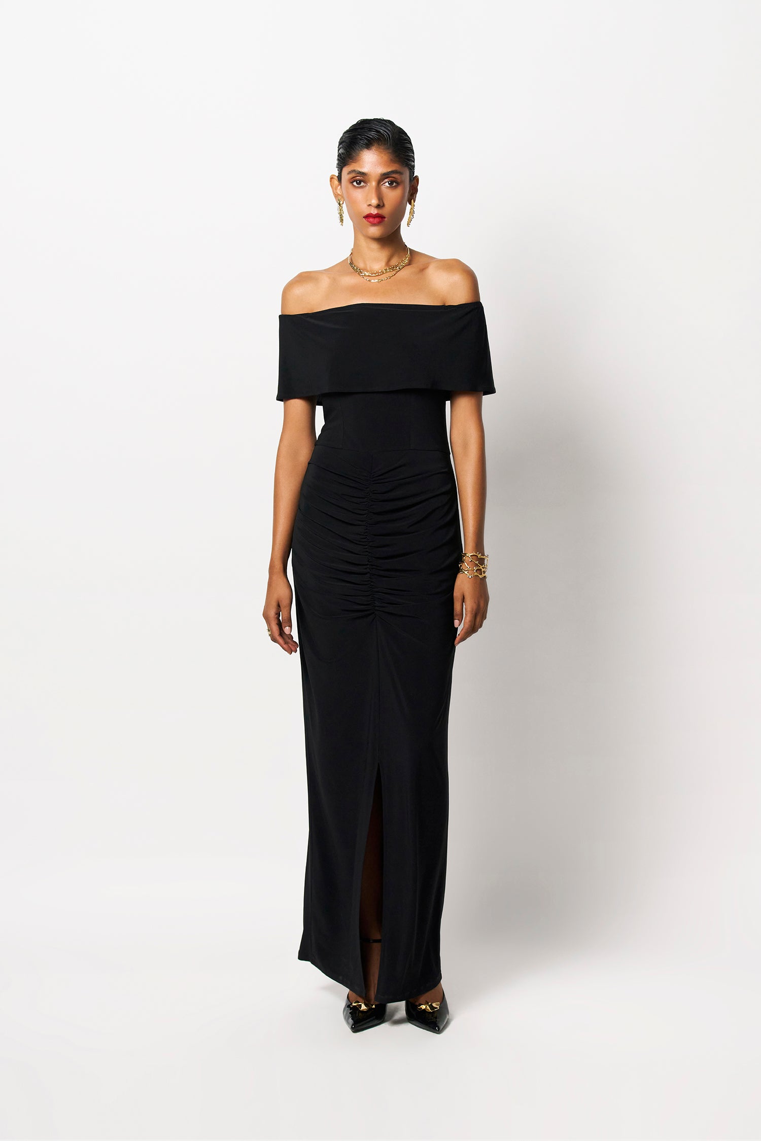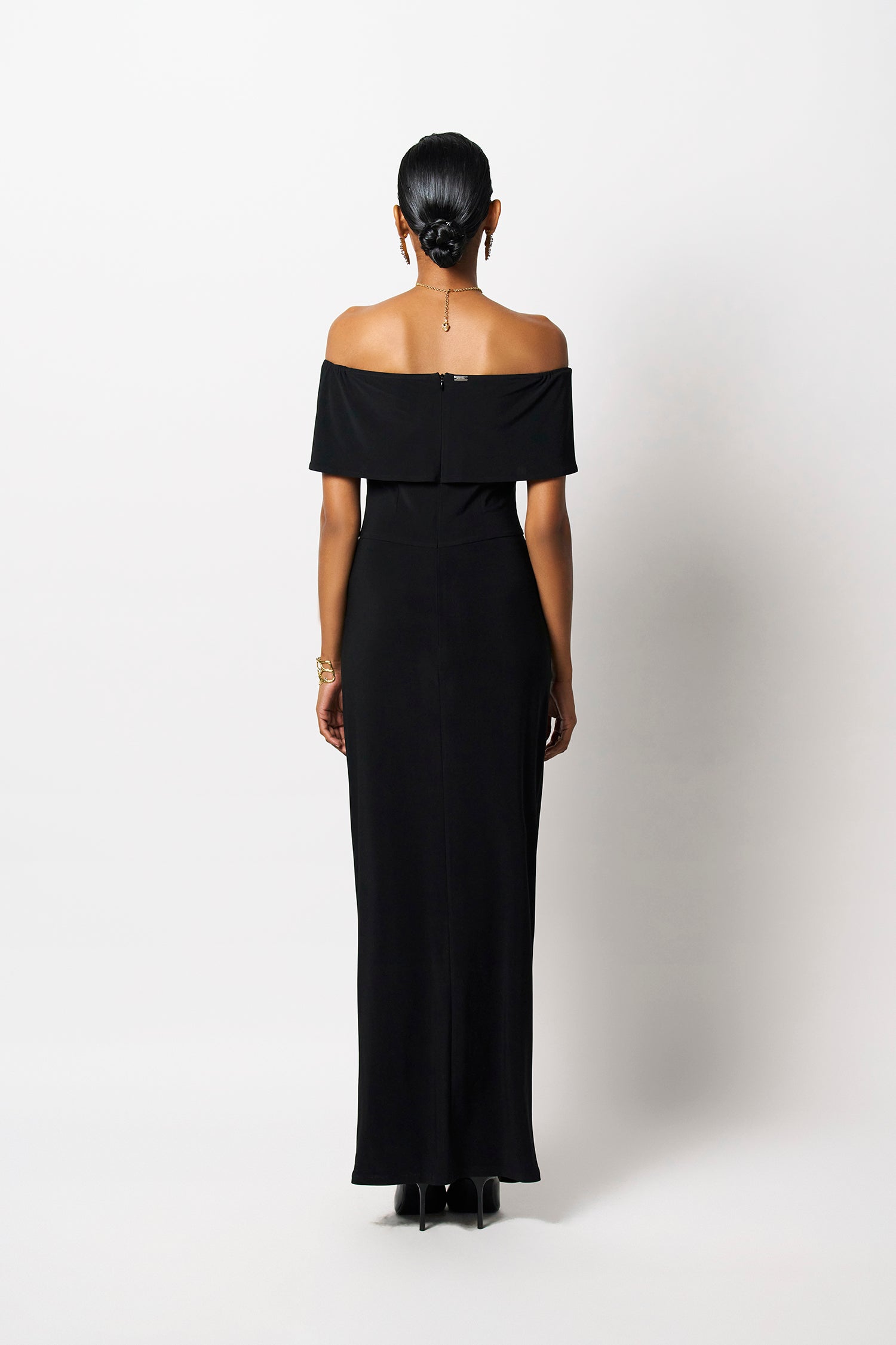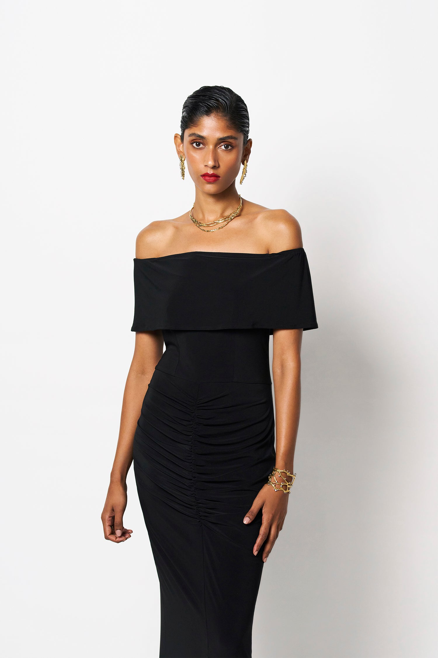 The beautiful Ana Dress has a slim fit that flatters your body. Made from soft jersey fabric, it has a back zip for easy wear. It features an off-shoulder neckline, and a stylish gathered front that adds an elegant touch.