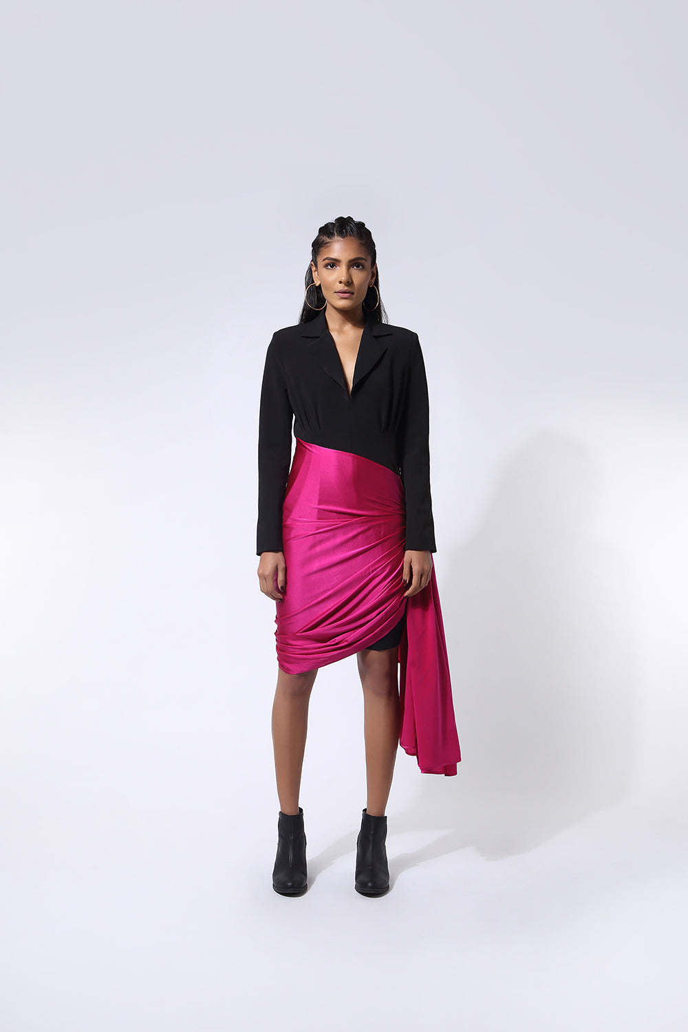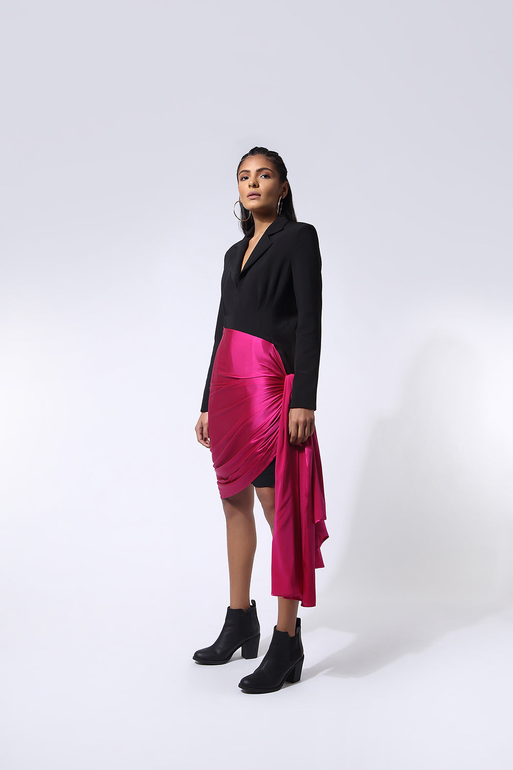 Our Aviator Dress features a blazer-style dress with draped satin over the dress. The layered upper panel can be tied up on the side. A super flattering silhouette and perfect dress for your next dinner date.