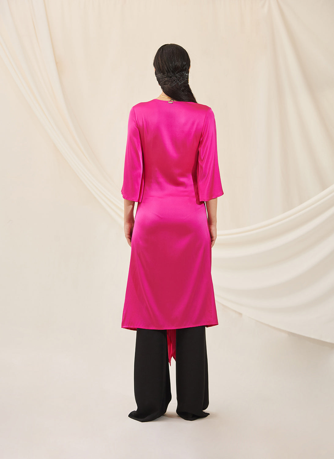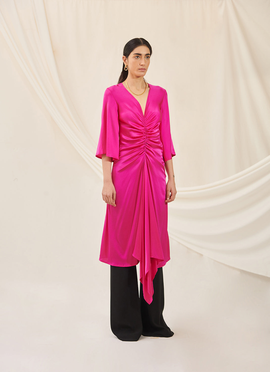 The Nivi Dress is beautifully draped and has a gathered detail on the front that extends into a slit towards the end of the front flap. Slightly skims the body with free flowing sleeves. Pairs best with our Safa Pant and perfect for work to dinner days.